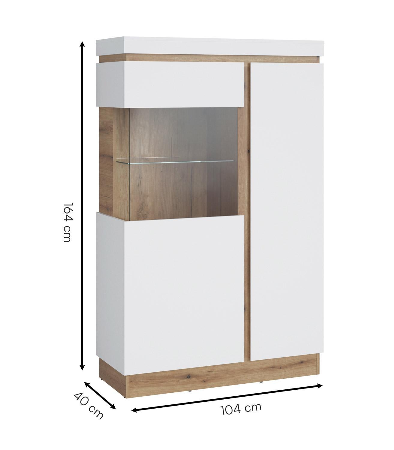 Das Highboard CLARA ist in Alpinweiß gehalten und verfügt über Absetzungen im Dekor Evoke Eiche. Es ist mit einer Tür sowie einer Tür mit Glasteilfront ausgestattet. Im Inneren befinden sich sechs Einlegeböden und ein Glasboden. Eine Beleuchtung ist nicht enthalten. Die Maße des Highboards betragen 104 cm in der Breite, 164 cm in der Höhe und 40 cm in der Tiefe.
