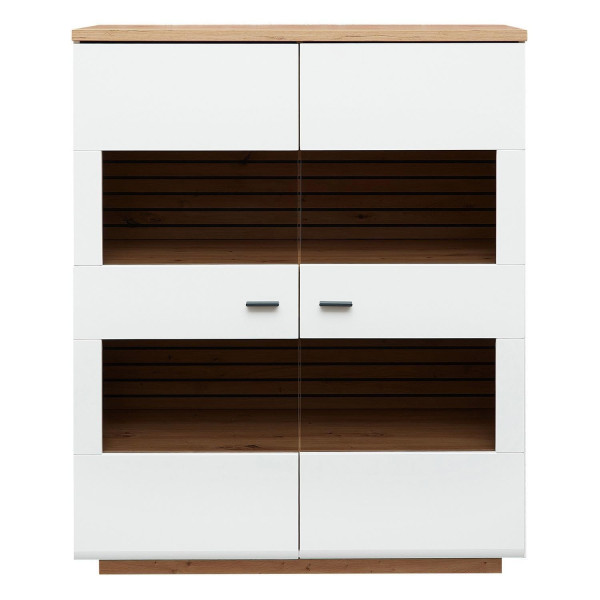 Das Highboard FANCY ist in Weiß matt ausgeführt, während die Absetzungen und das Innendekor in Artisan Eiche Dekor gehalten sind. Die Front unterteilt sich in zwei Türen mit Glasteilfronten, welche über eine Soft-Close-Funktion verfügen. Im Inneren befinden sich vier Einlegeböden, wobei diese Ausführung ohne Beleuchtung geliefert wird. Die Maße umfassen eine Breite von 110 cm, eine Höhe von 137 cm sowie eine Tiefe von 40 cm.