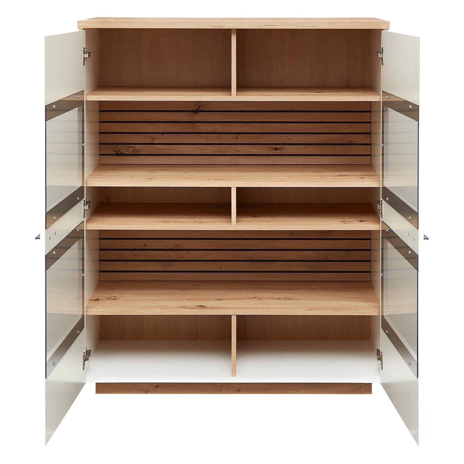 | Lieferumfang: | 1 Highboard mit 2 Glastüren, 4 Einlegeböden. Die Beleuchtung ist nicht enthalten |