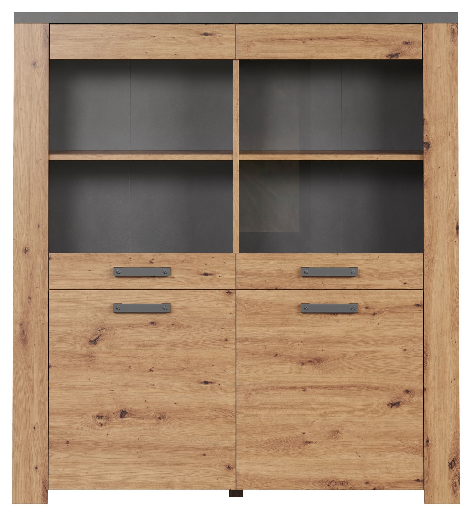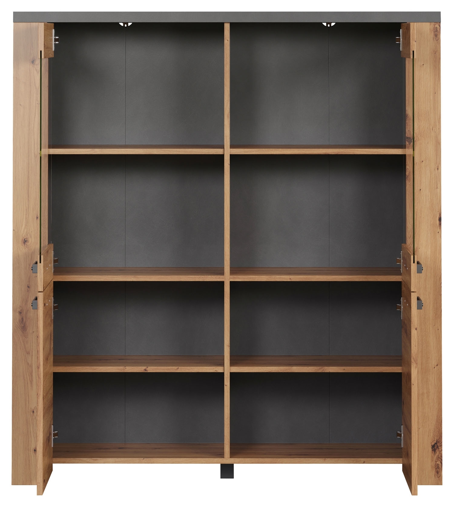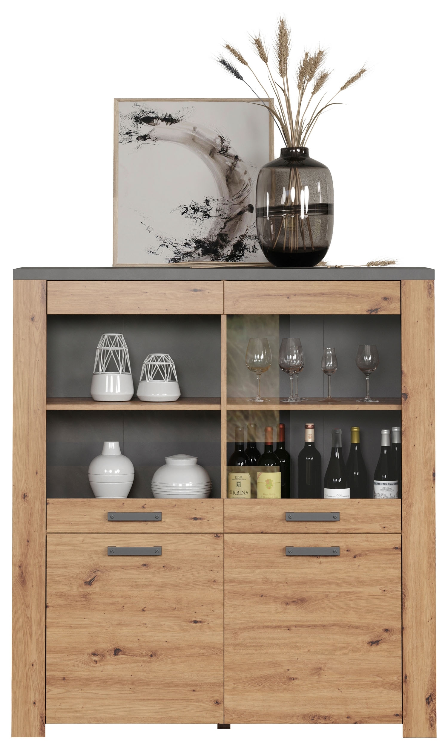 Unser Highboard in Artisan Eiche Dekor mit Matera Dekor Absetzung bietet stilvolle Aufbewahrungslösungen. Ausgestattet mit 2 Glastüren, 2 Holztüren und 6 Einlegeböden ist es äußerst vielseitig.