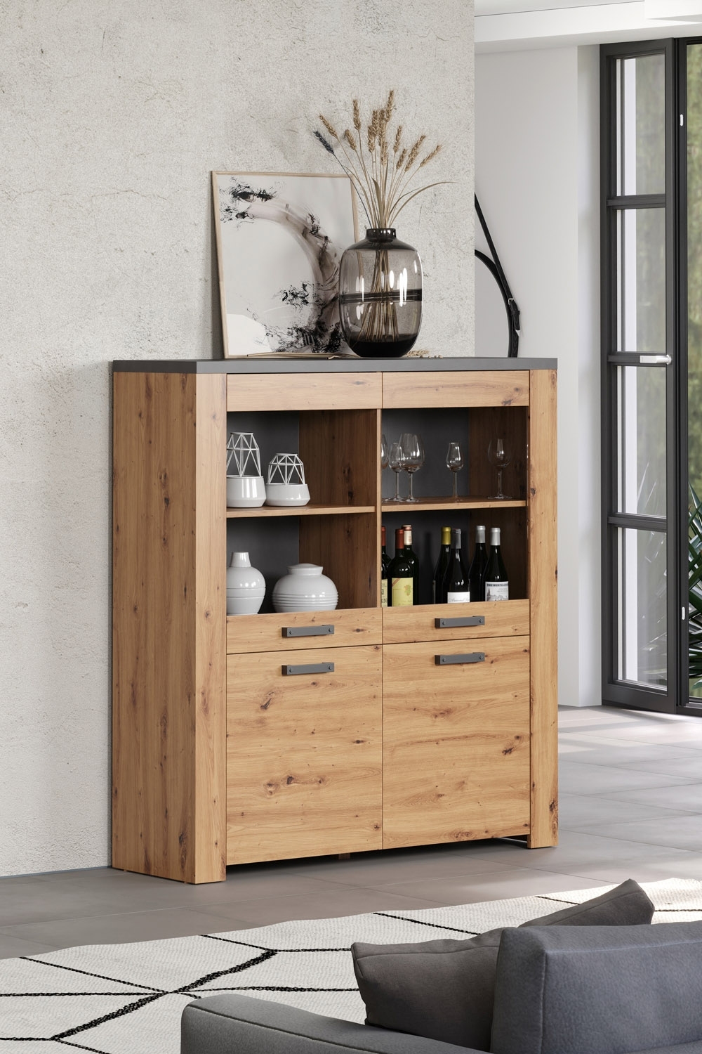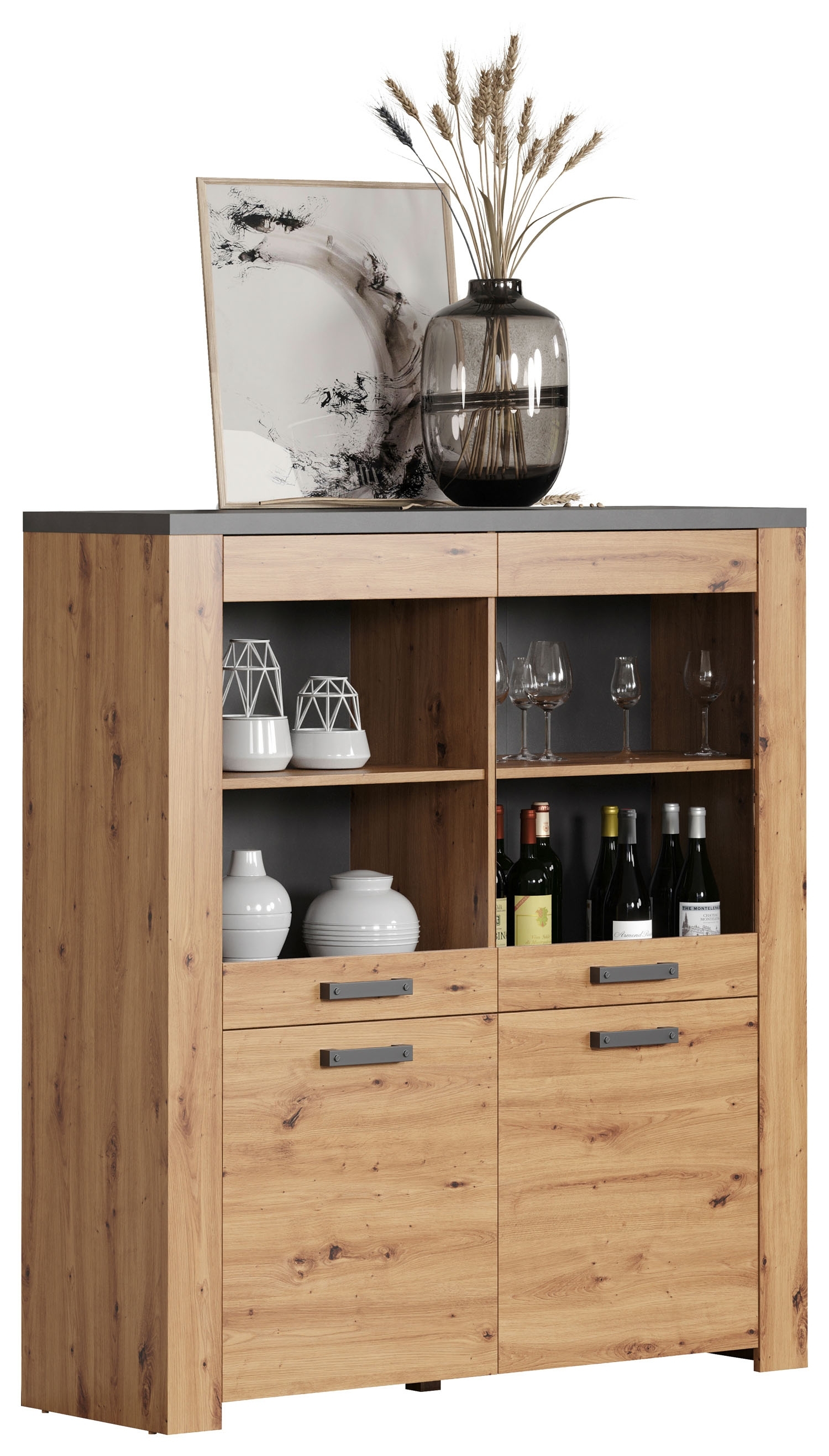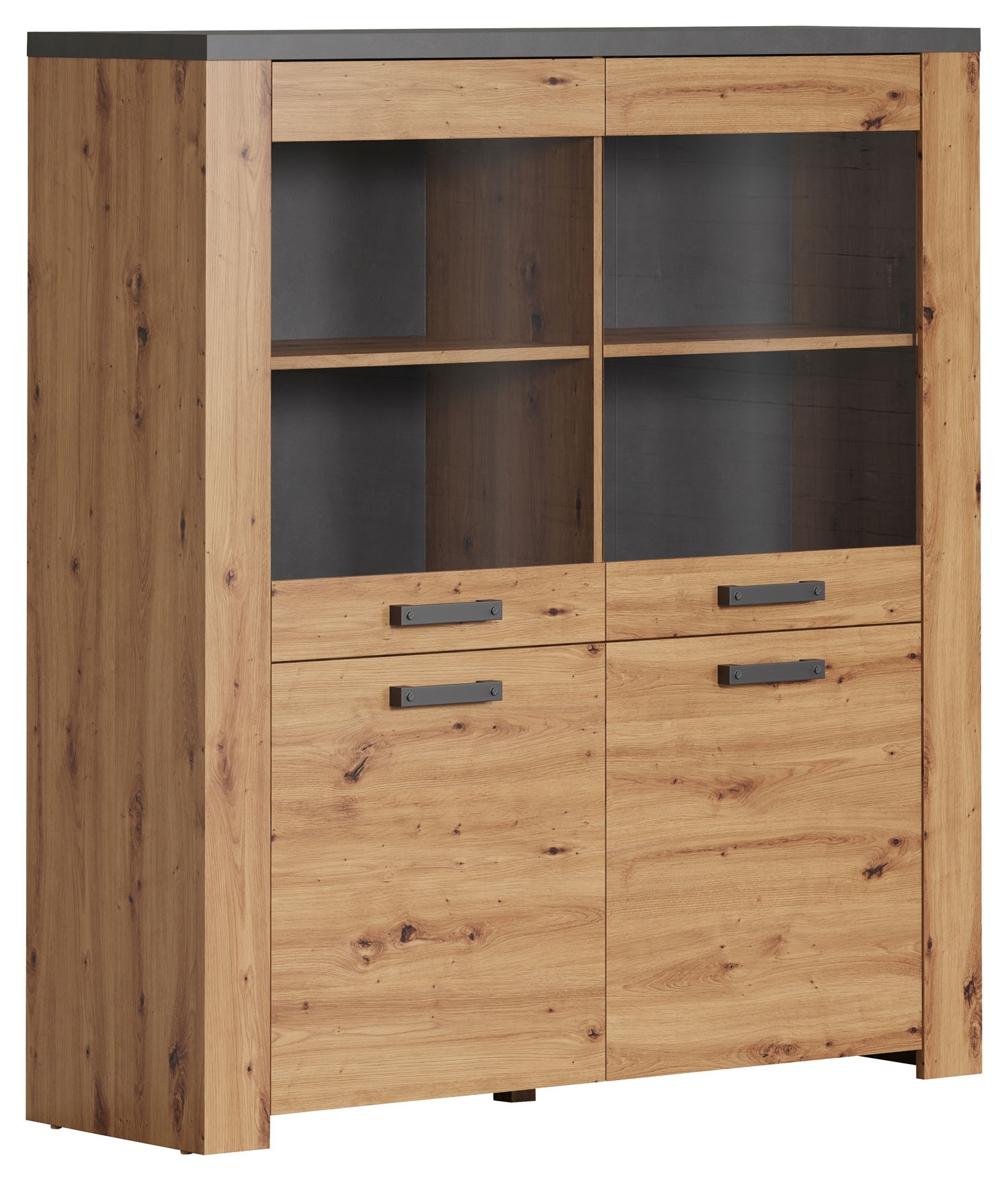 Unser Highboard in Artisan Eiche Dekor mit Matera Dekor Absetzung bietet stilvolle Aufbewahrungslösungen. Ausgestattet mit 2 Glastüren, 2 Holztüren und 6 Einlegeböden ist es äußerst vielseitig.