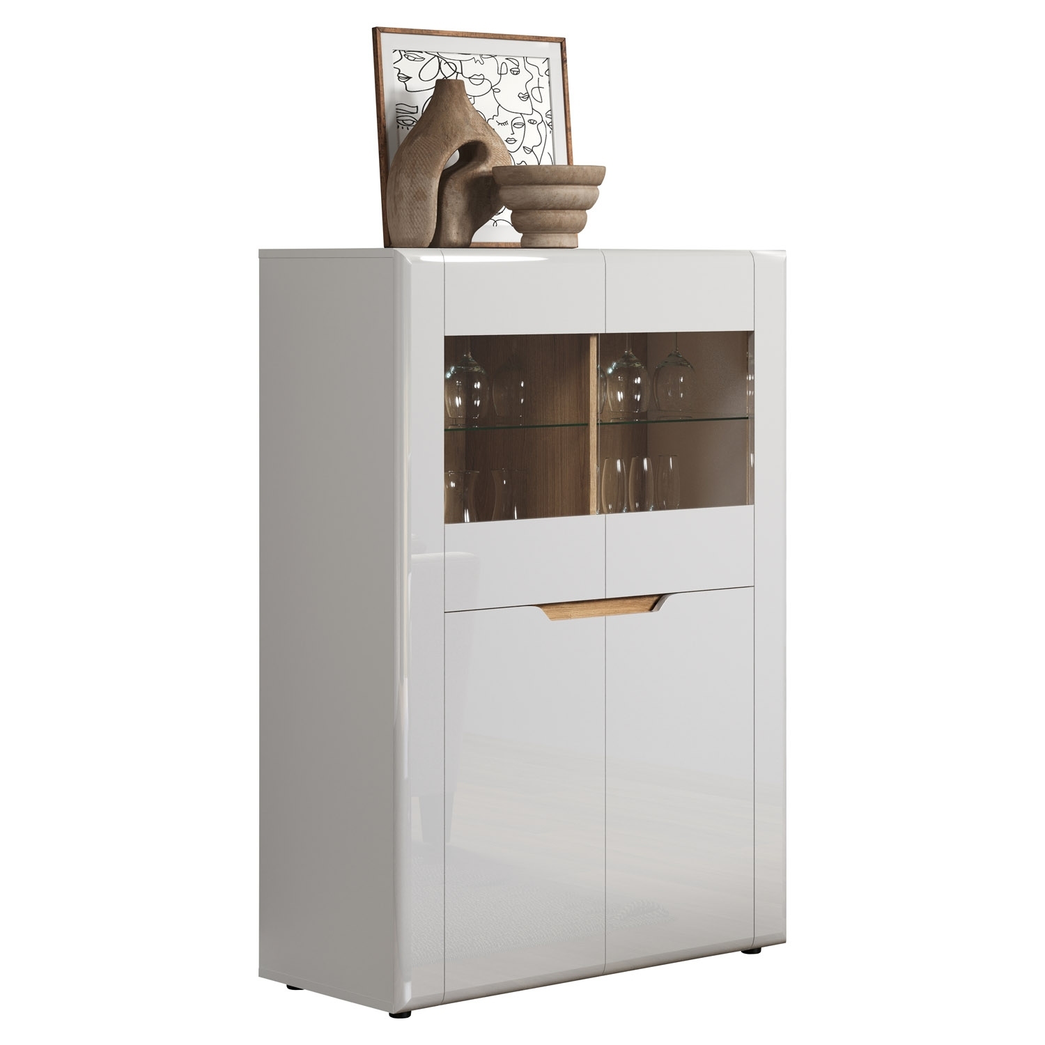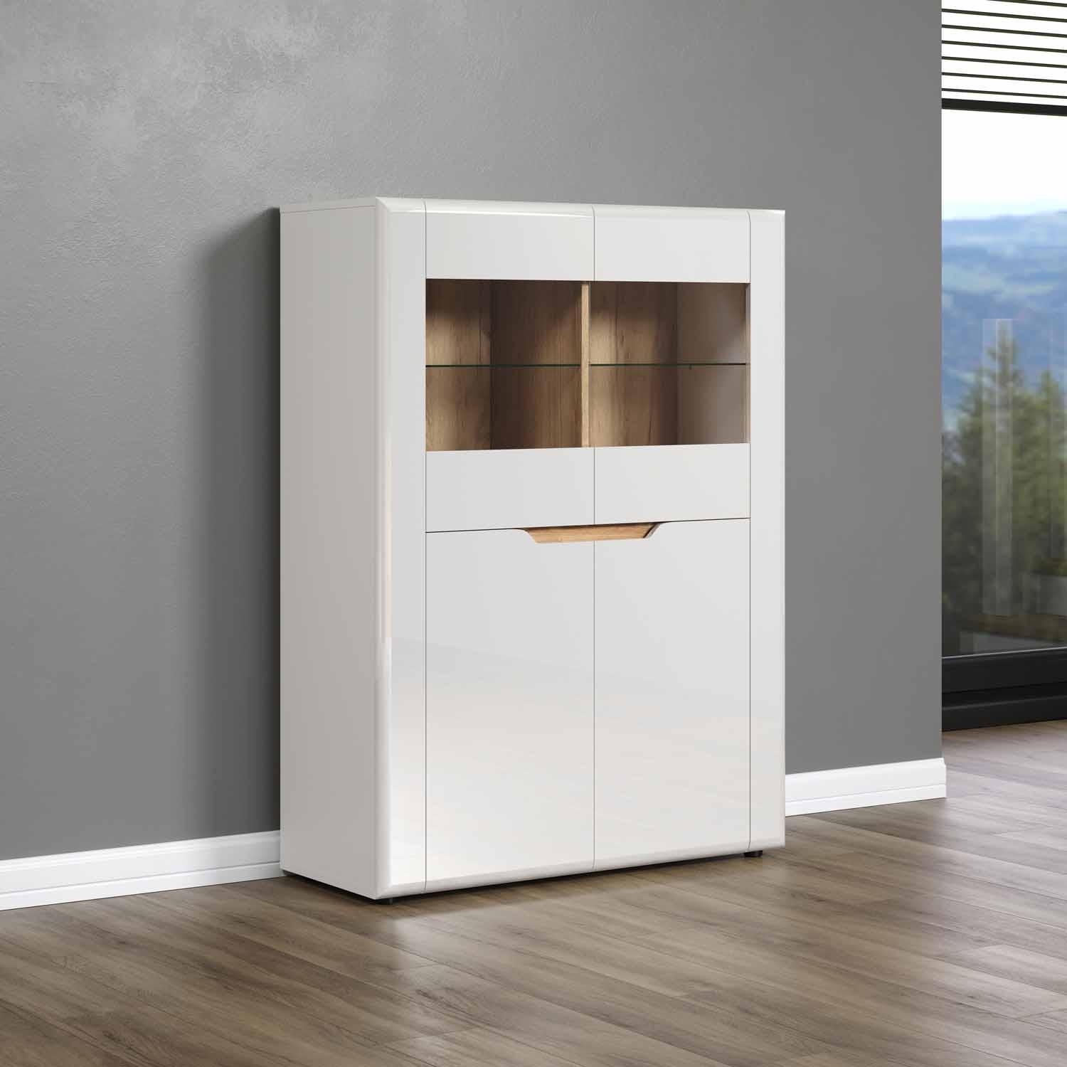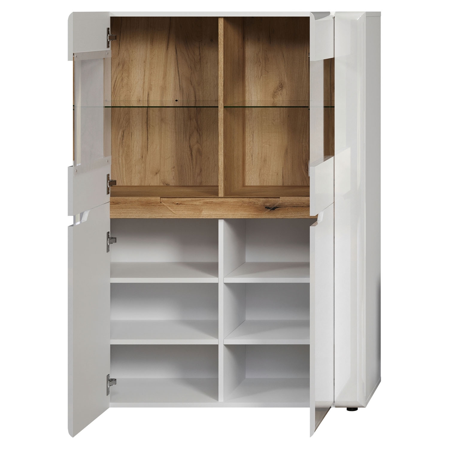 Das Highboard in weißem Hochglanz mit Evoke Eiche Dekor-Akzenten ist eine stilvolle Aufbewahrungslösung mit einer Breite von 96 cm. Mit 2 Türen, teilweise aus Glas, bietet es einen transparenten Blick auf den Inhalt. Die 2 Glasböden und 4 Einlegeböden in Weiß ermöglichen eine geordnete Präsentation von Gegenständen. Diese Kombination aus Design und Funktionalität verleiht Ihrem Raum einen modernen und eleganten Charakter.