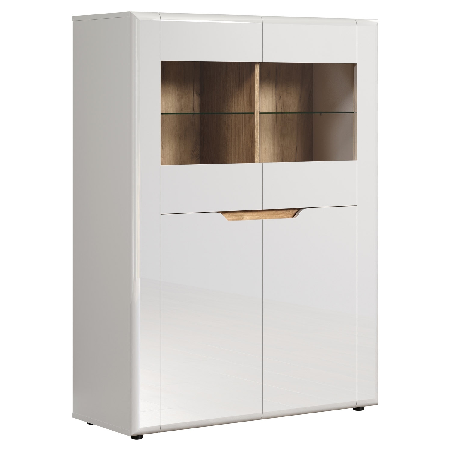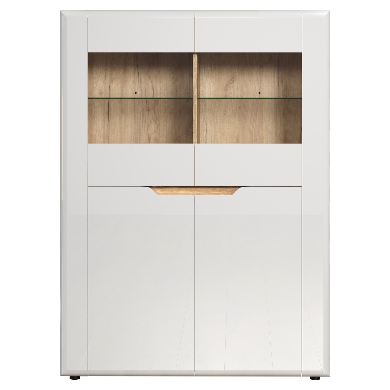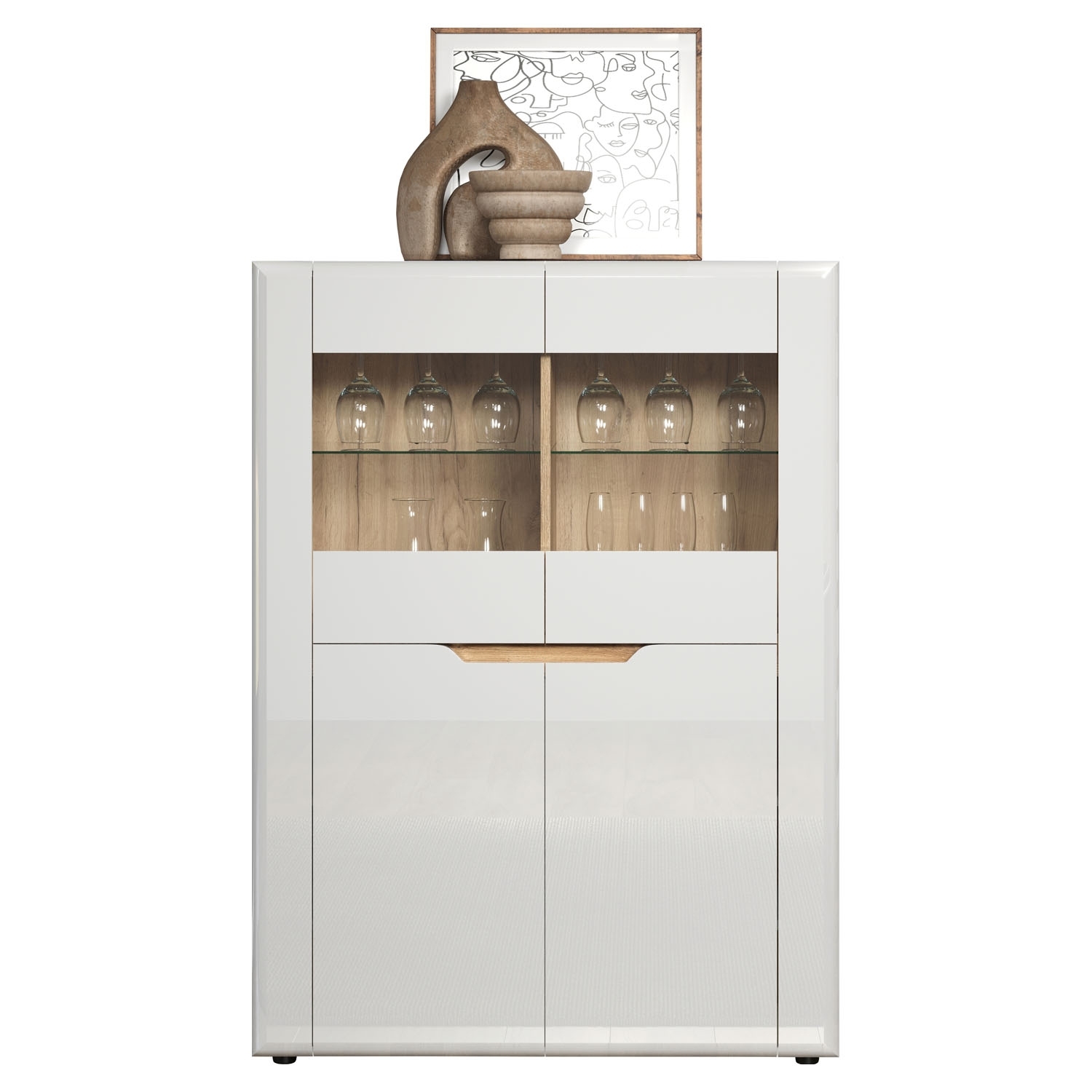 Das Highboard in weißem Hochglanz mit Evoke Eiche Dekor-Akzenten ist eine stilvolle Aufbewahrungslösung mit einer Breite von 96 cm. Mit 2 Türen, teilweise aus Glas, bietet es einen transparenten Blick auf den Inhalt. Die 2 Glasböden und 4 Einlegeböden in Weiß ermöglichen eine geordnete Präsentation von Gegenständen. Diese Kombination aus Design und Funktionalität verleiht Ihrem Raum einen modernen und eleganten Charakter.