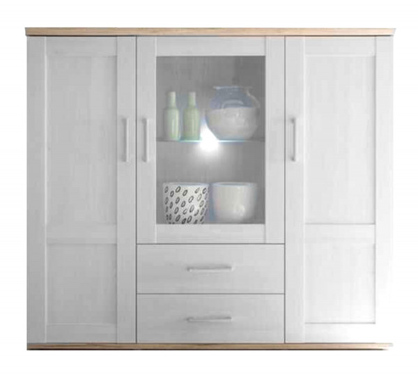 | Lieferumfang: | 1 Highboard mit 1 Tür mit Glasfront, 2 Türen, 2 Schubladen sowie 1 Glas- und 6 Holzböden. 1 LED-Glaskantenbeleuchtung für 1 Glasboden ist enthalten |