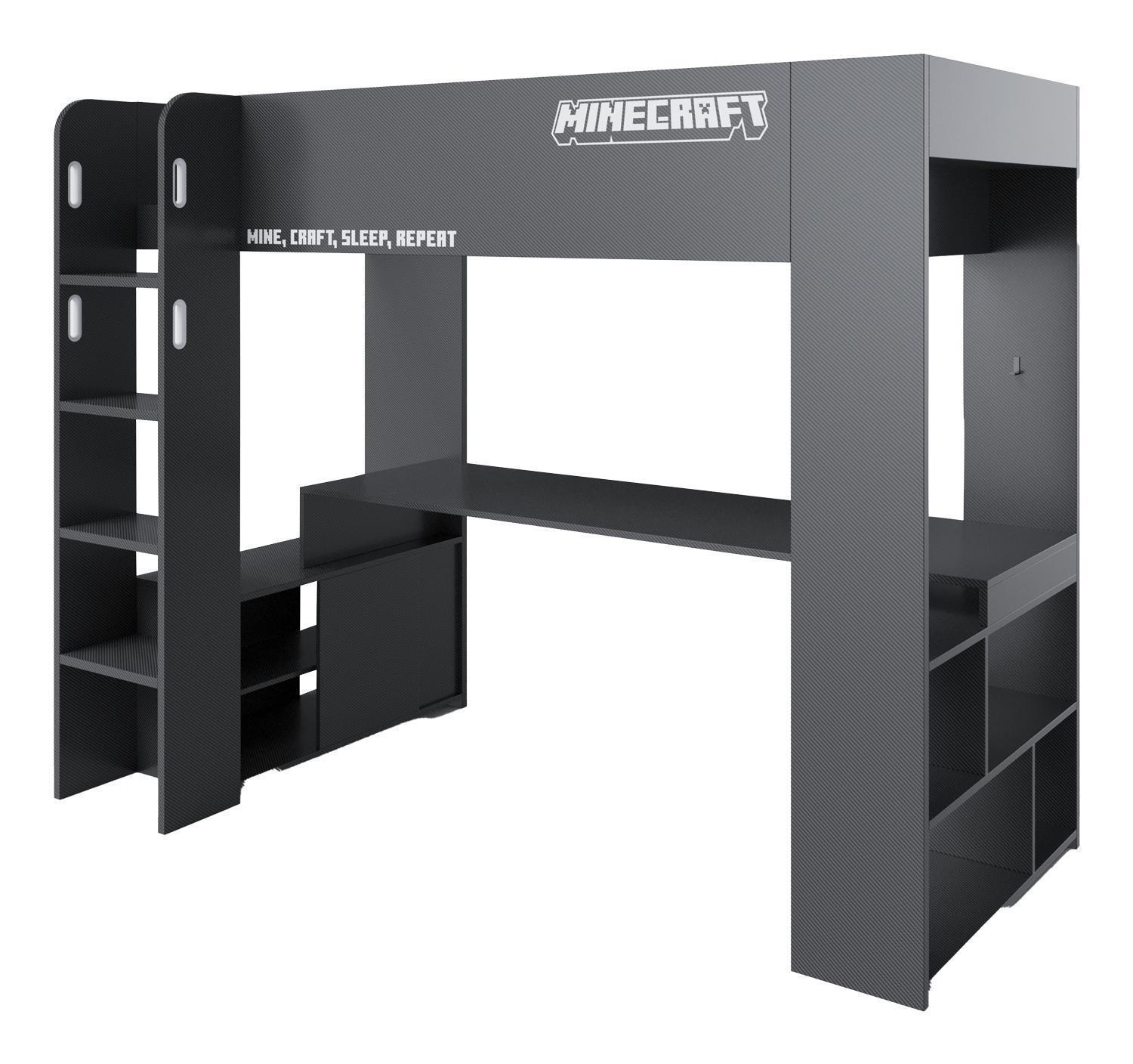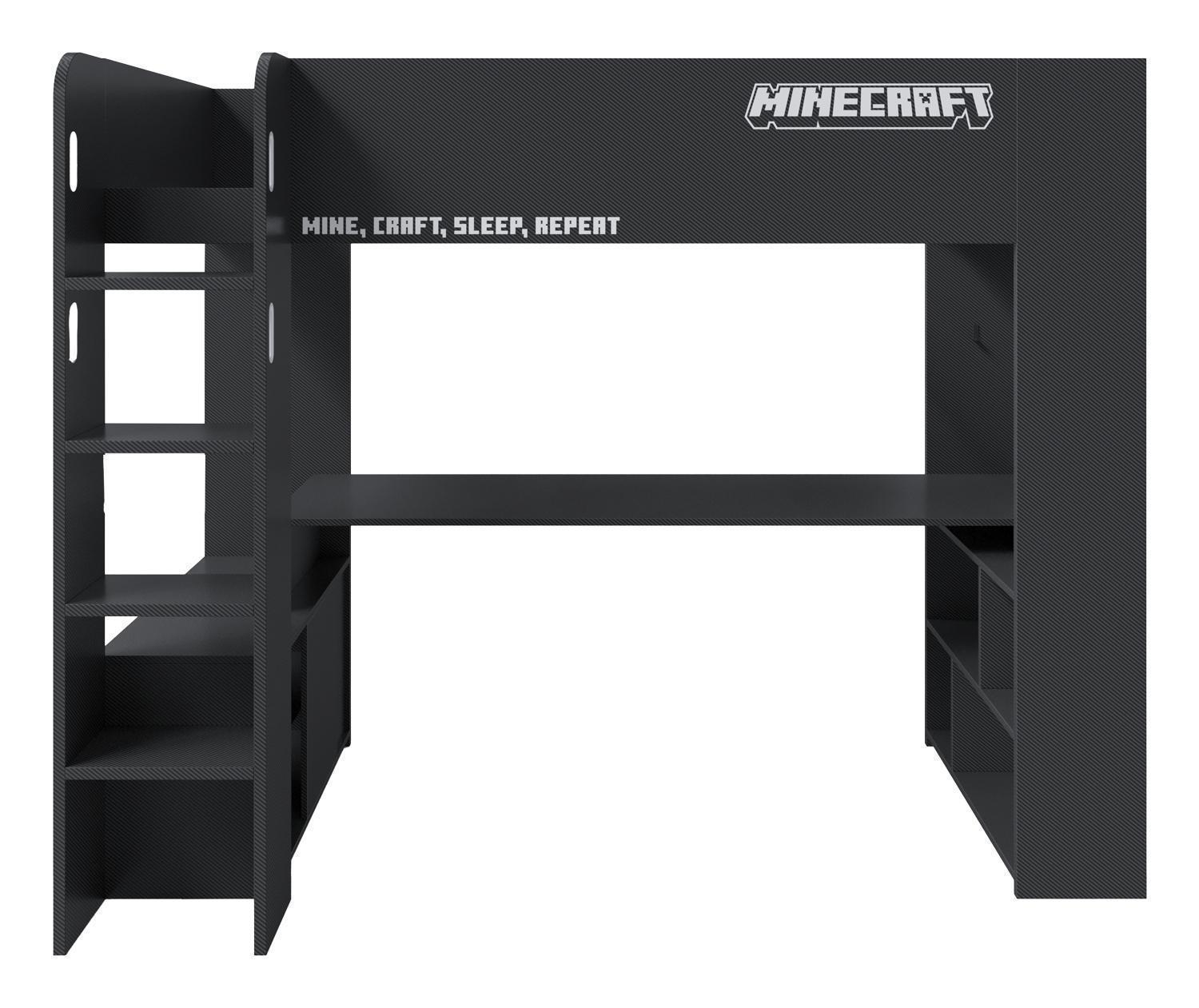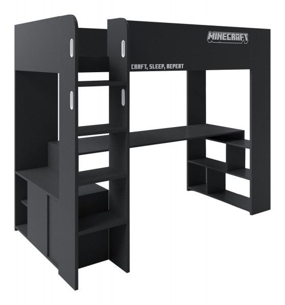 Das Hochbett MINECRAFT ist schwarz mit Karbonoptik und einem weißen Schriftzug. Es verfügt über eine Leiter, einen Schreibtisch, offene Ablagefächer und eine Schiebetür. Die Liegefläche beträgt 90 x 200 cm. Die Gesamtmaße sind 227 cm Breite, 181 cm Höhe und 96 cm Tiefe.