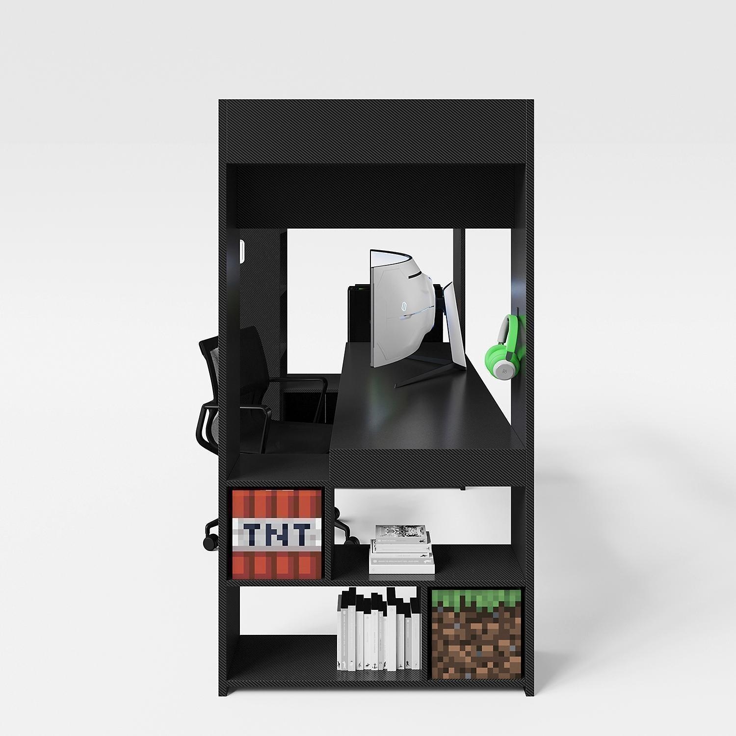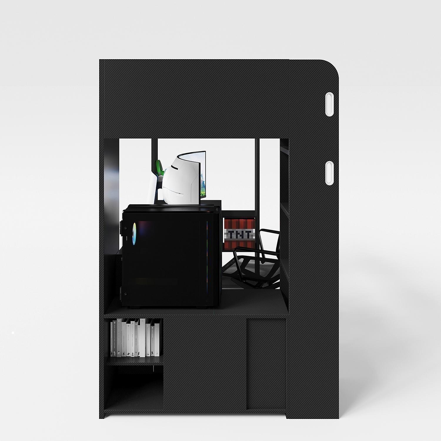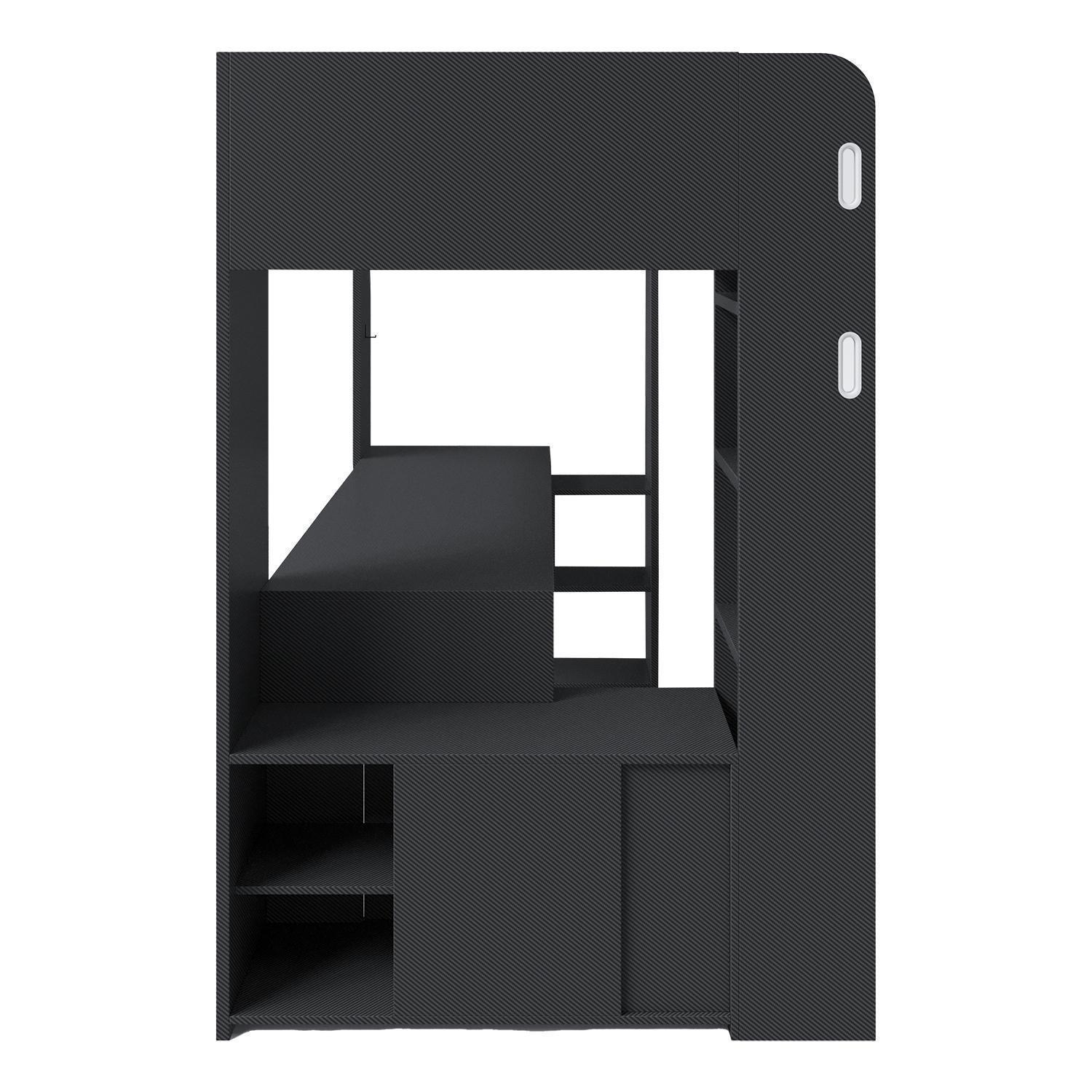 Das Hochbett MINECRAFT ist schwarz mit Karbonoptik und einem weißen Schriftzug. Es verfügt über eine Leiter, einen Schreibtisch, offene Ablagefächer und eine Schiebetür. Die Liegefläche beträgt 90 x 200 cm. Die Gesamtmaße sind 227 cm Breite, 181 cm Höhe und 96 cm Tiefe.