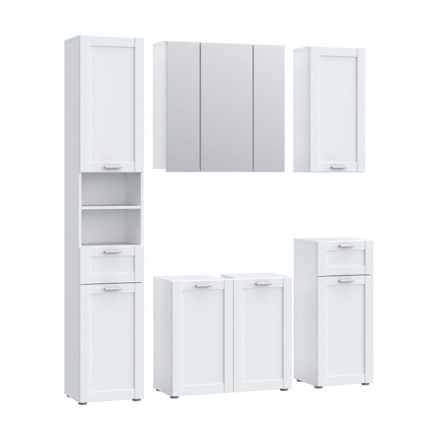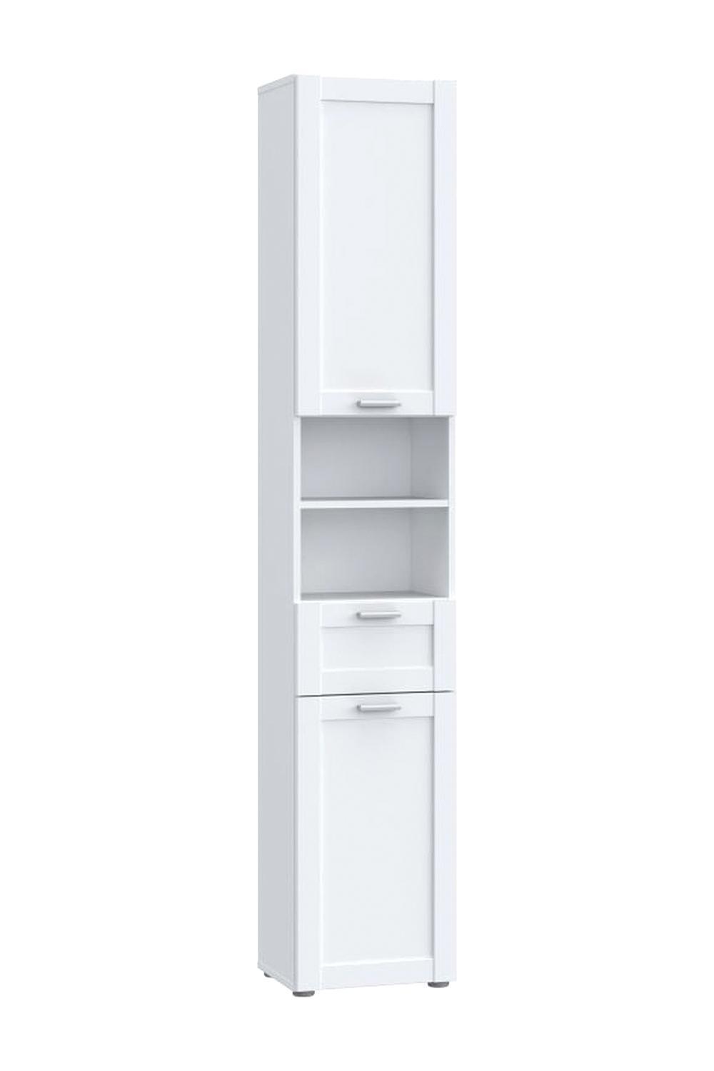 Der Hochschrank LARRY ist in matter Weißlackierung ausgeführt. Er verfügt über zwei offene Ablagefächer, zwei Drehtüren sowie eine Schublade. Im Innenraum sind zwei Einlegeböden enthalten. Die Türanschläge lassen sich wahlweise rechts oder links montieren. Die Abmessungen betragen 35 cm in der Breite, 191 cm in der Höhe und 31 cm in der Tiefe.