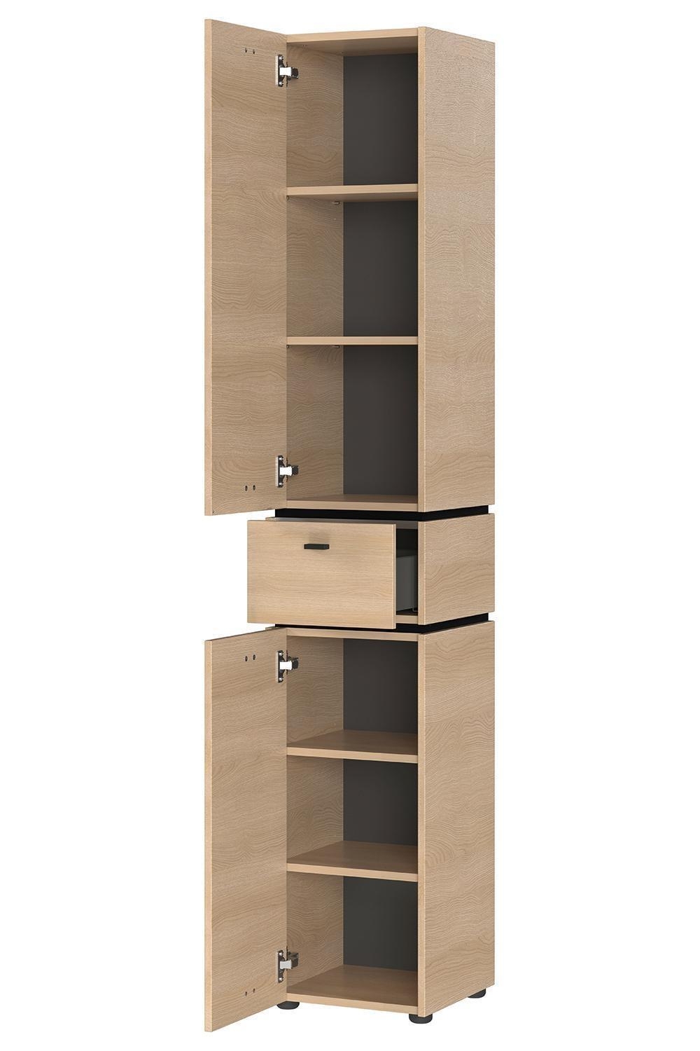 Der Hochschrank MODESTO der Marke Germania ist in Lindberg-Eiche Dekor gefertigt. Die Absetzungen sind in Schwarz gehalten, die Rückwand in Graphit Dekor. Der Schrank verfügt über zwei Türen mit Soft-Close-Funktion, eine Schublade mit Soft-Close-Funktion und vier höhenverstellbare Einlegeböden. Die Breite beträgt 34 cm, die Höhe 189 cm und die Tiefe 34 cm. Der Hochschrank wird in Deutschland hergestellt.