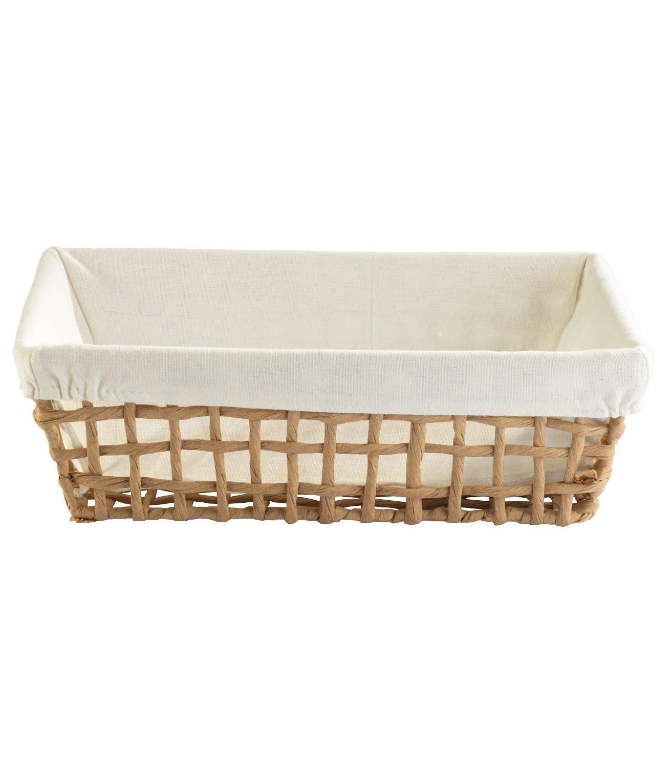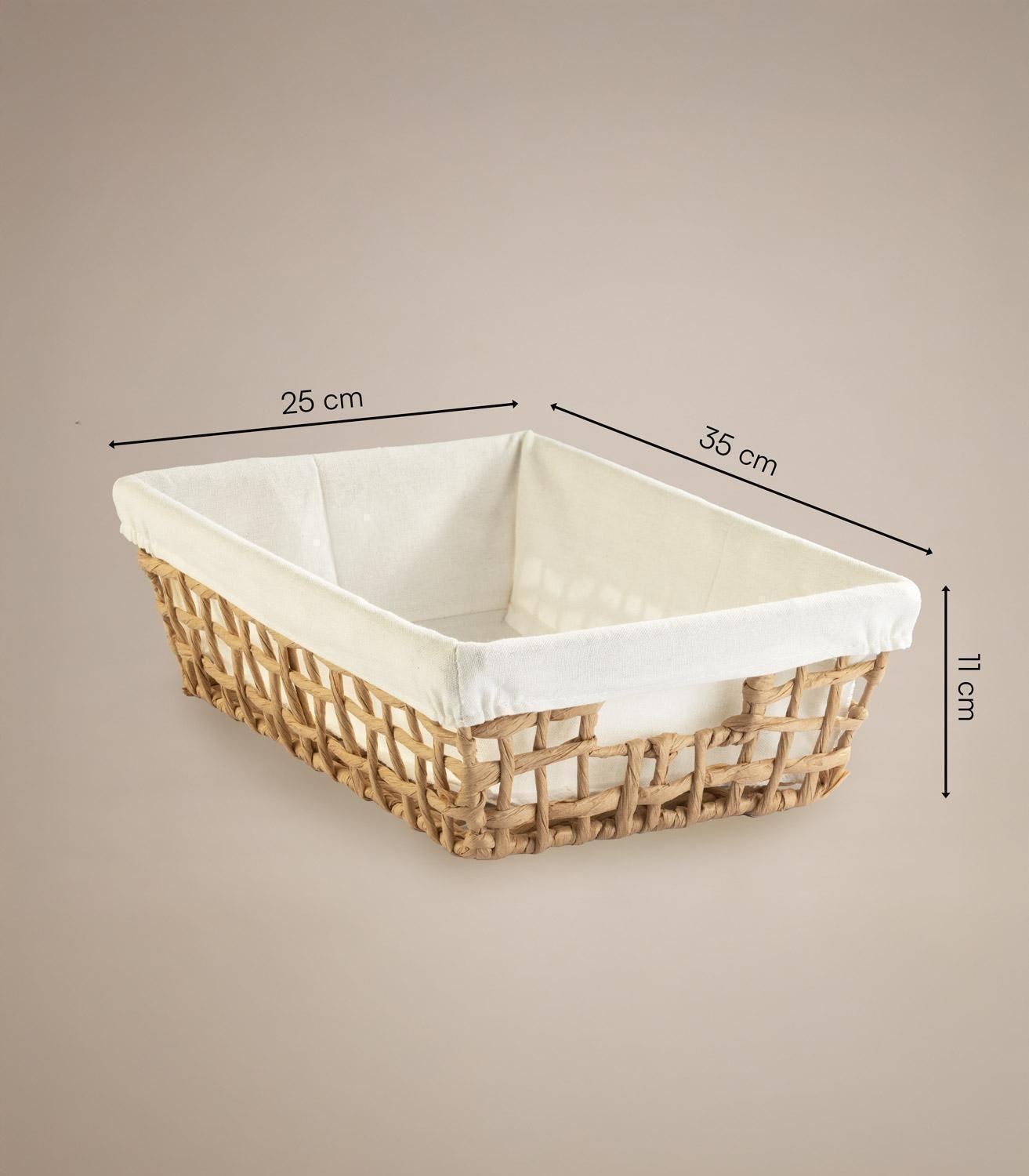 Der Aufbewahrungskorb JETTA von Home4You ist in Beige gehalten und verfügt über ein Drahtgestell mit Papierumwicklung in Braun. Er ist mit einem abnehmbaren Stoffeinsatz ausgestattet. Der Korb eignet sich zur Aufbewahrung von Pflegeprodukten, Dekoration und weiteren Gegenständen. Die Maße betragen 35 cm in der Breite, 11 cm in der Höhe und 25 cm in der Tiefe.