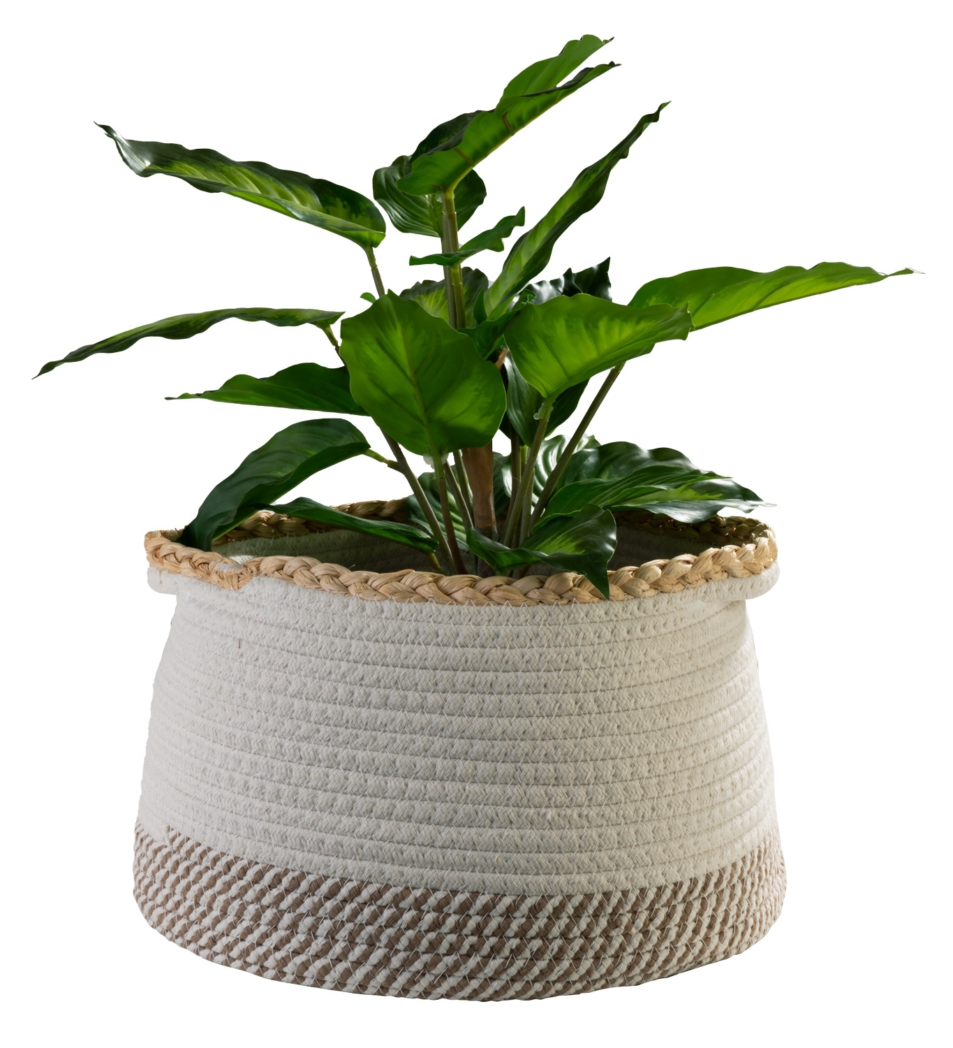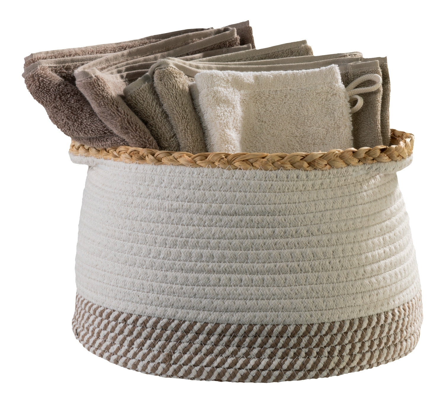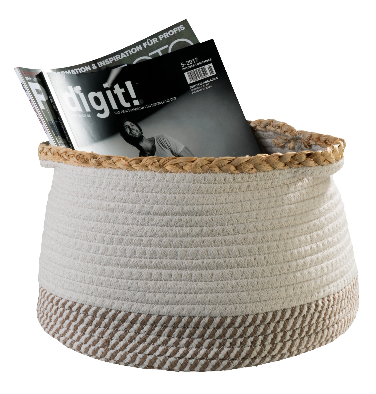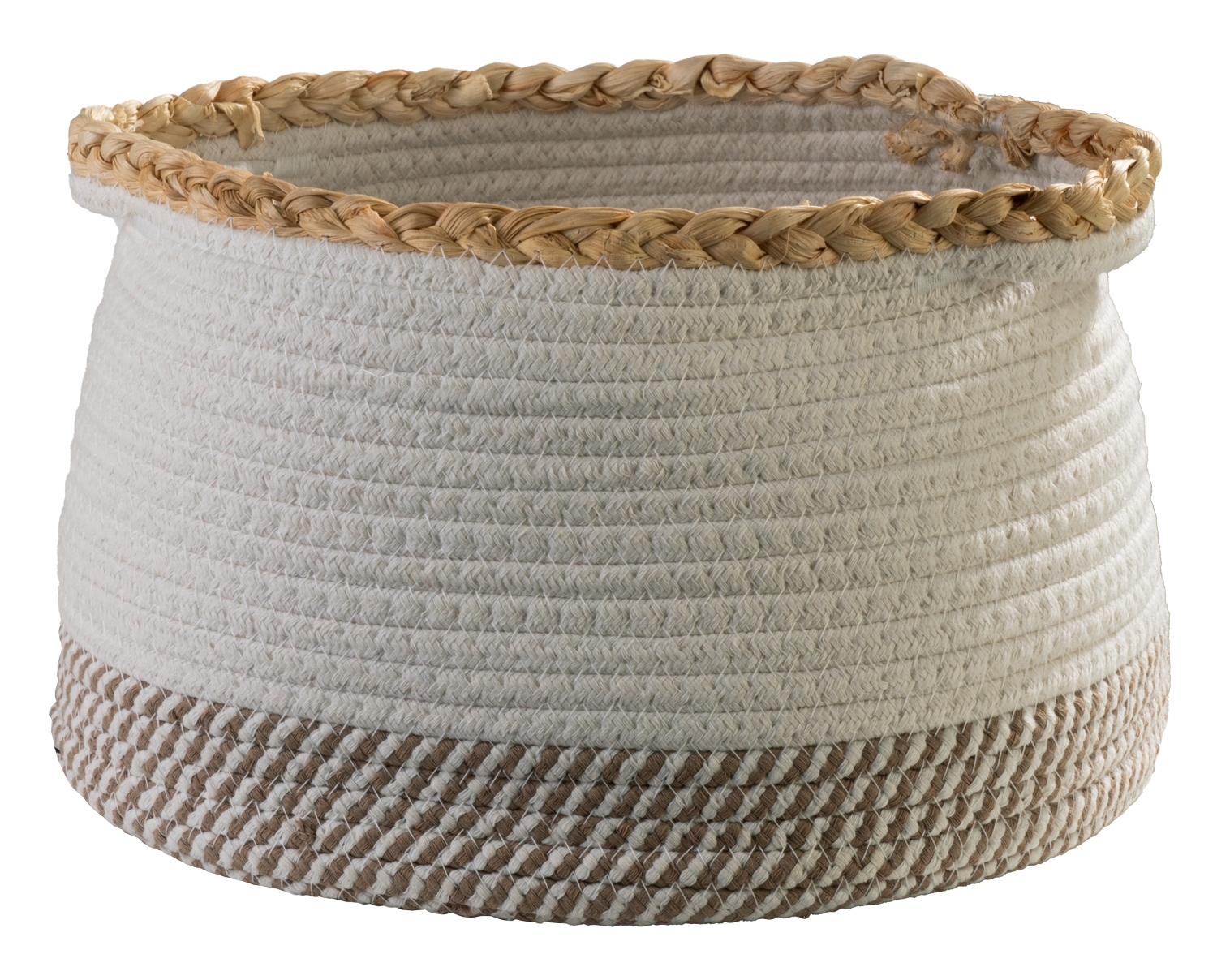 Der Aufbewahrungskorb JULE von Home4You in beige und weiß besteht aus Baumwolle. Er eignet sich ideal zur Aufbewahrung von Spielzeug, Zeitschriften und vielem mehr. Ohne Griffe, mit einem Durchmesser von 32 cm und einer Höhe von 20 cm ist er praktisch und platzsparend.