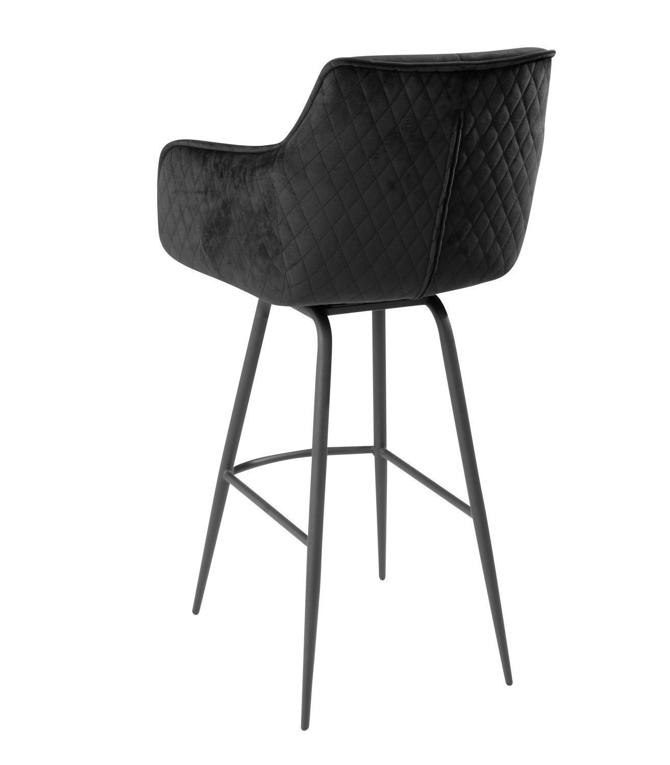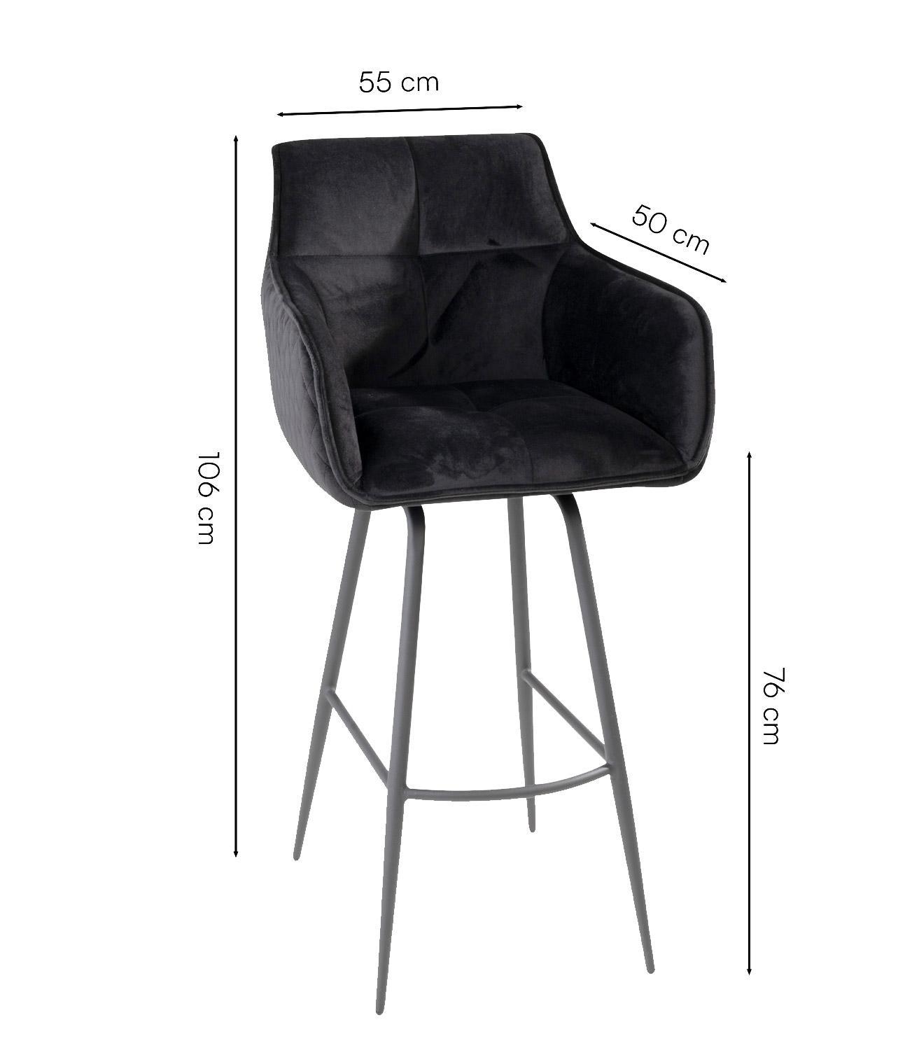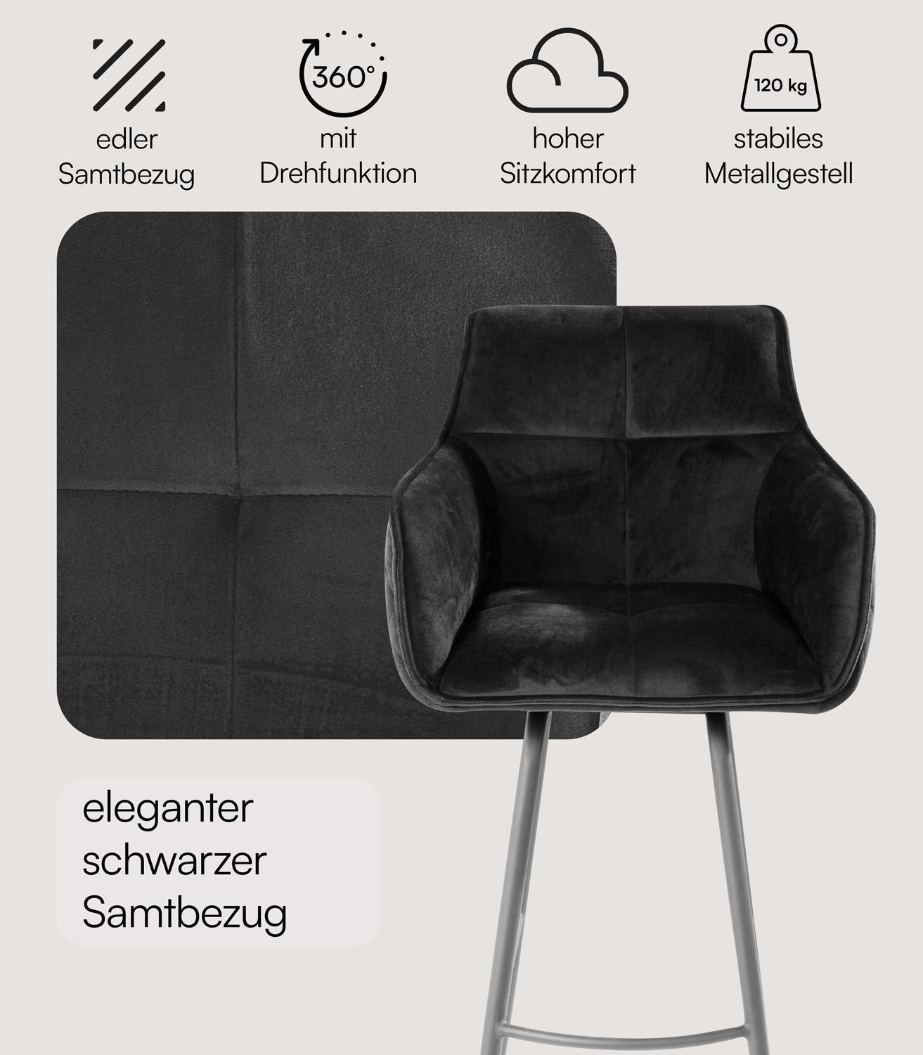 Der Barhocker JORIS von Home4You vereint stilvolles Design und hohen Komfort. Mit seinem eleganten schwarzen Samtbezug und einem stabilen Metallgestell in Schwarz ist er ein echter Hingucker. Die bequemen Armlehnen und die praktische Fußablage sorgen für zusätzlichen Sitzkomfort. Der Hocker ist 360 Grad drehbar ohne Rückstellfunktion, was Flexibilität ermöglicht. Mit einer Breite von 55 cm, einer Höhe von 106 cm und einer Tiefe von 50 cm bietet er ausreichend Platz. Die maximale Belastbarkeit liegt bei 120 kg.