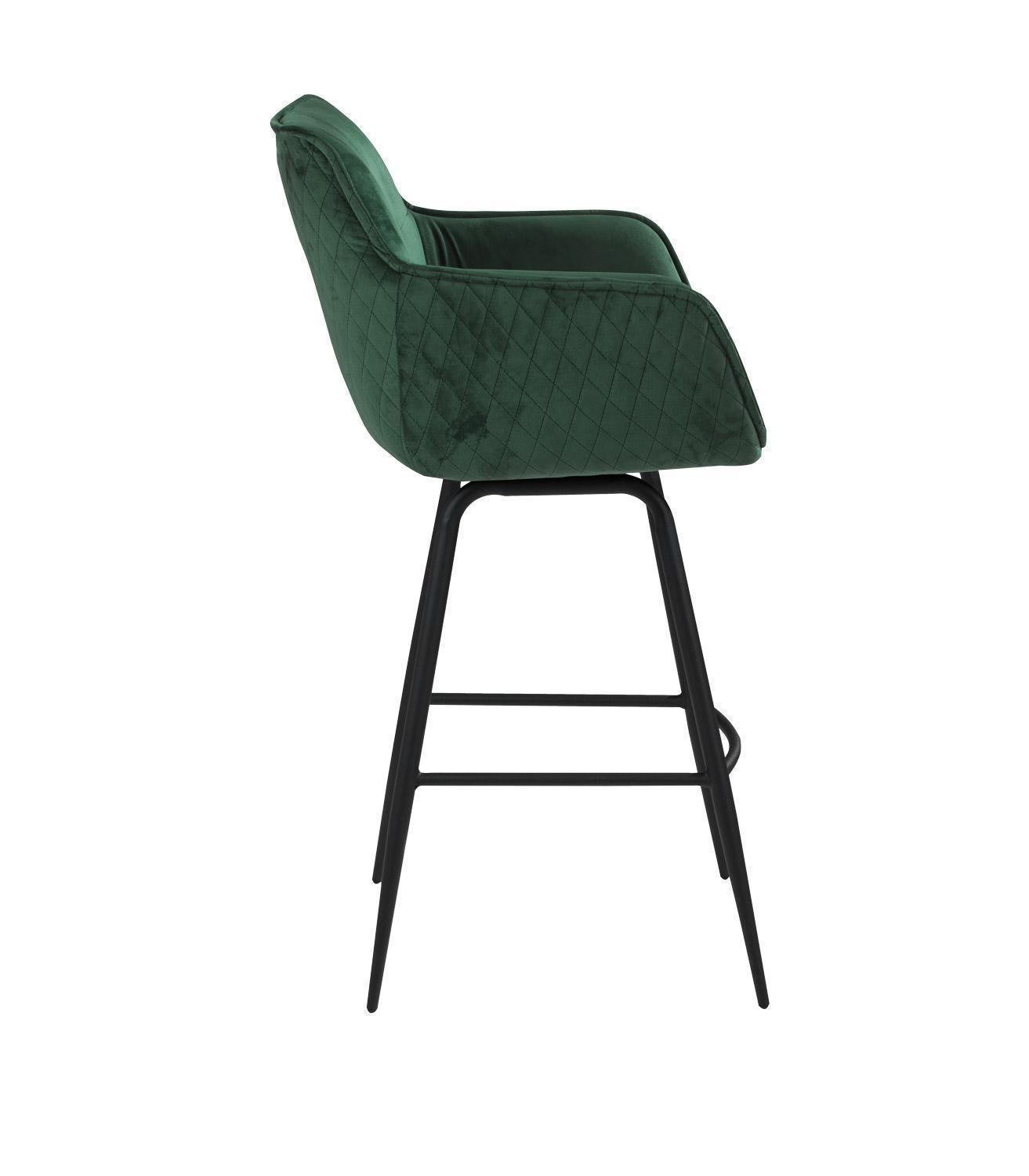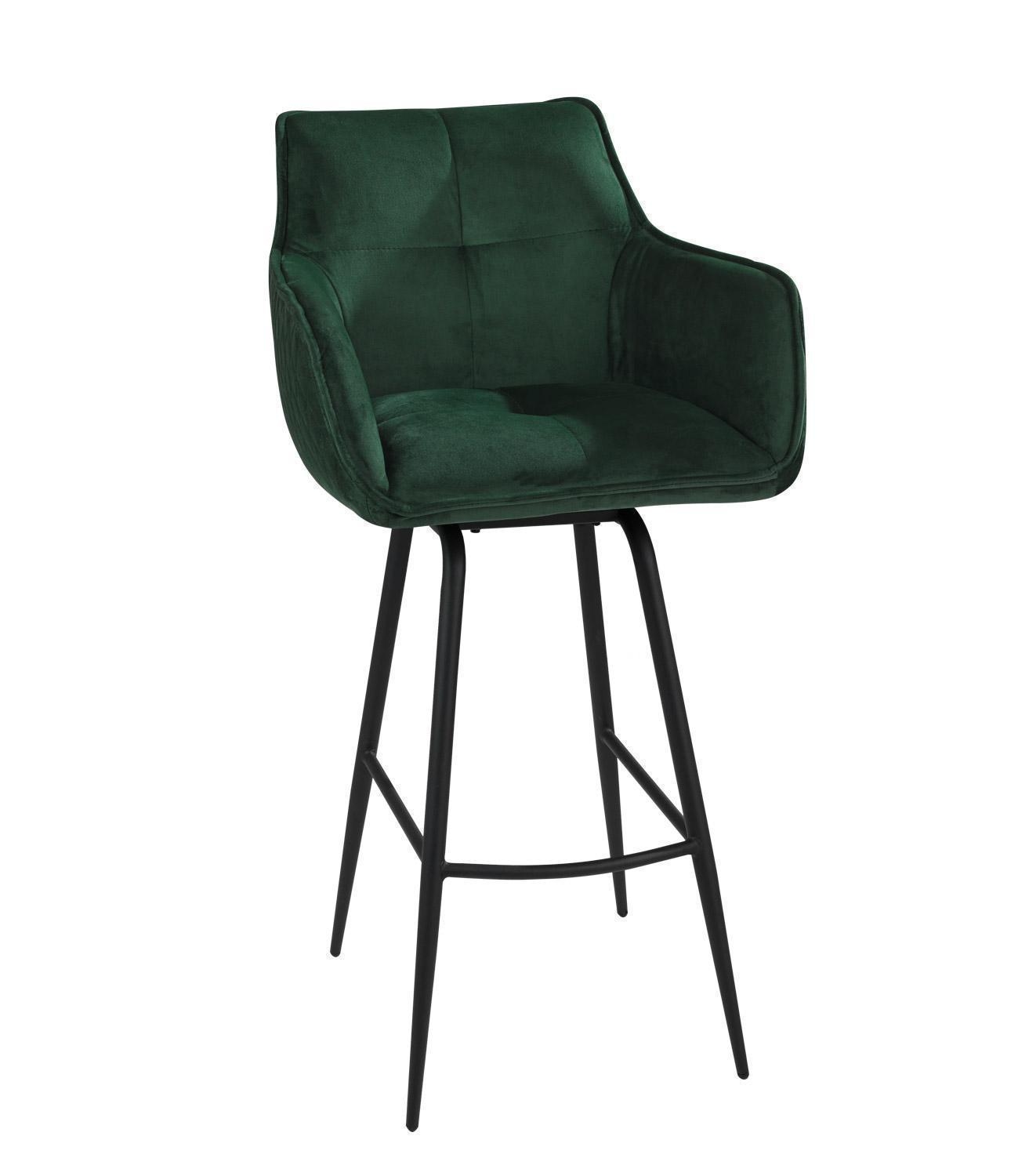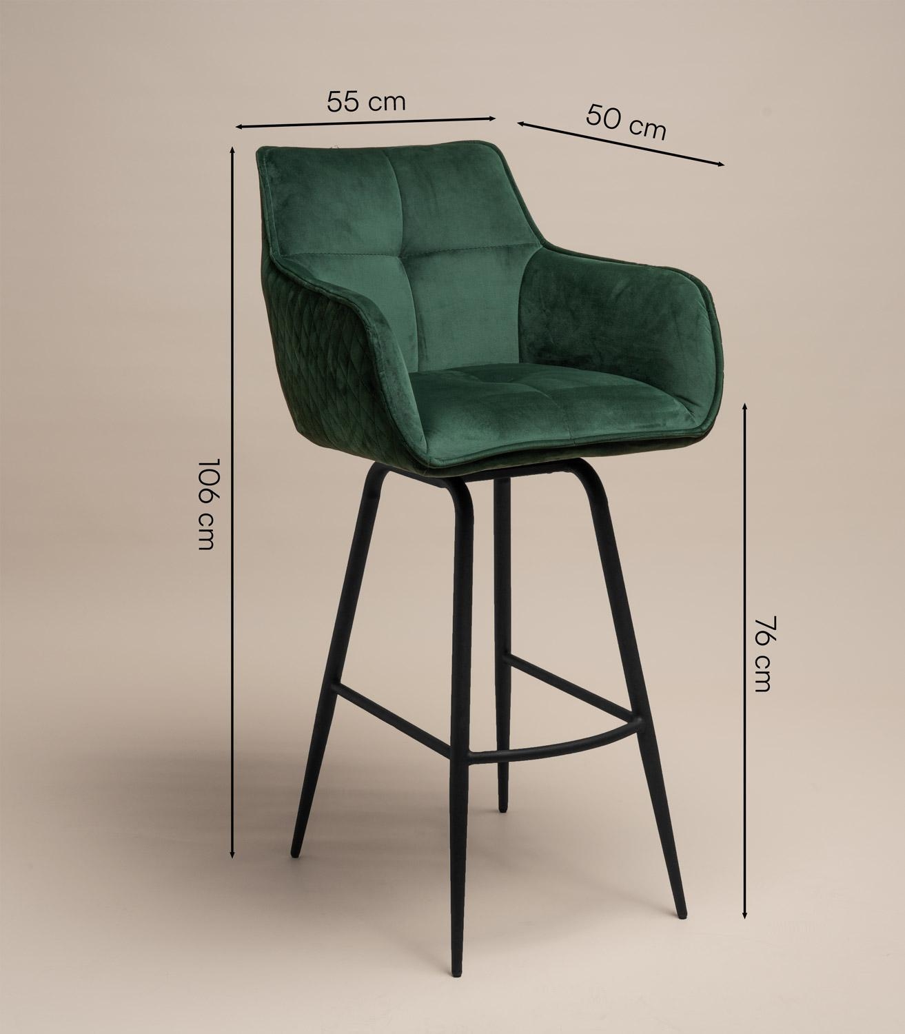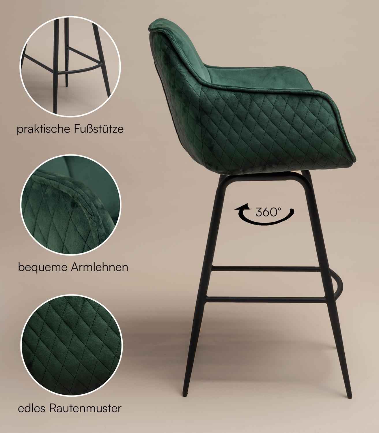 Der Barhocker JORIS von Home4You vereint stilvolles Design und hohen Komfort. Mit seinem eleganten grünen Samtbezug und einem stabilen Metallgestell in Schwarz ist er ein echter Hingucker. Die bequemen Armlehnen und die praktische Fußablage sorgen für zusätzlichen Sitzkomfort. Der Hocker ist 360 Grad drehbar ohne Rückstellfunktion, was Flexibilität ermöglicht. Mit einer Breite von 55 cm, einer Höhe von 106 cm und einer Tiefe von 50 cm bietet er ausreichend Platz. Die maximale Belastbarkeit liegt bei 120 kg.