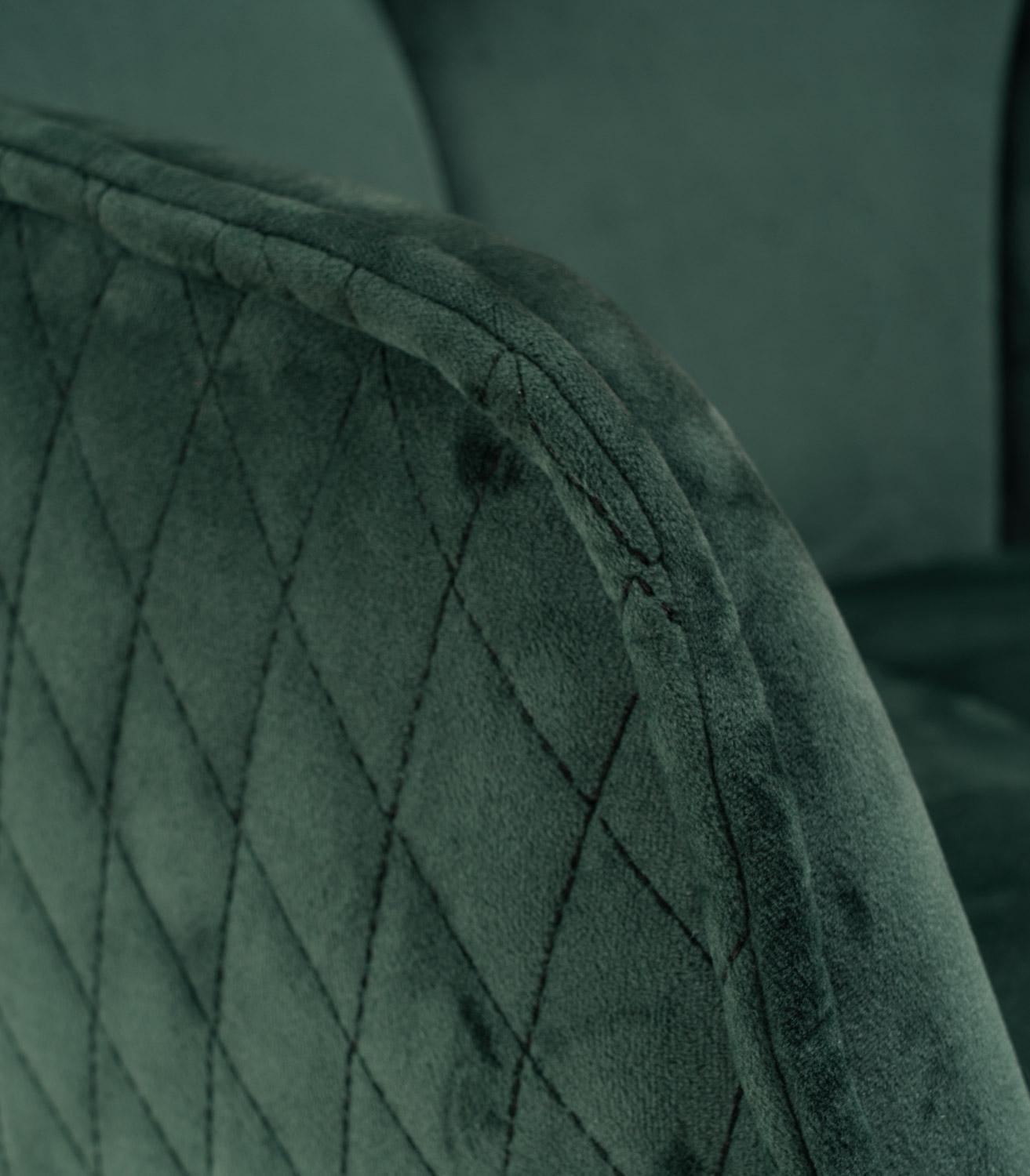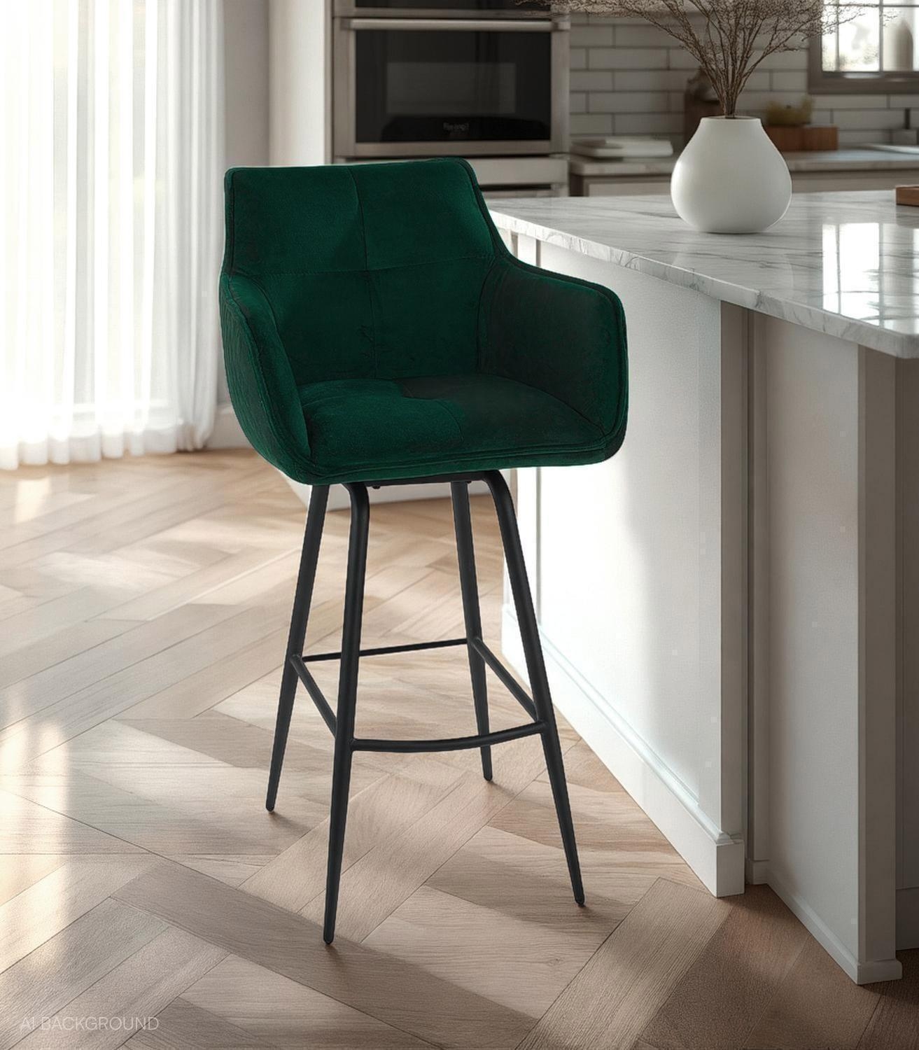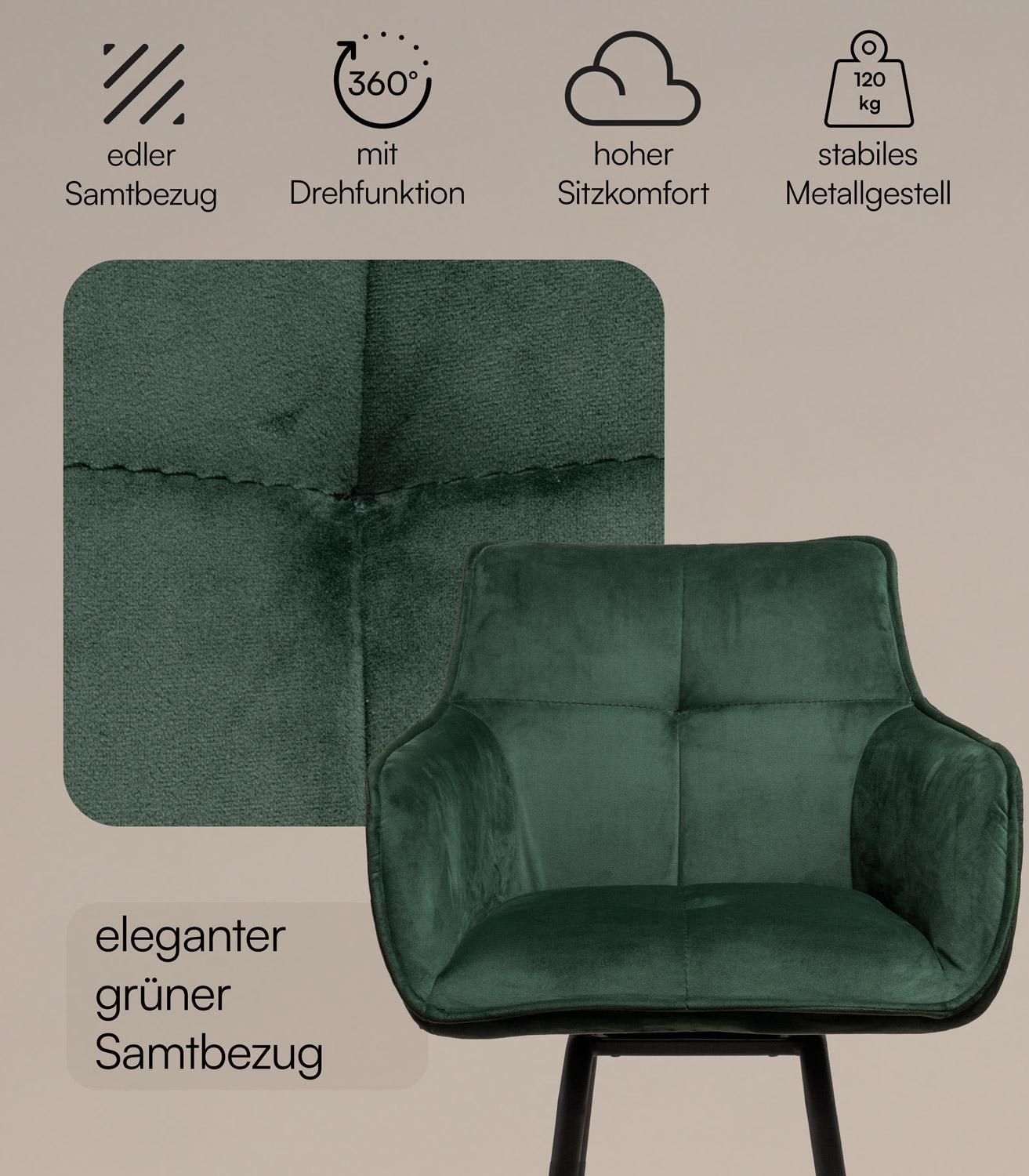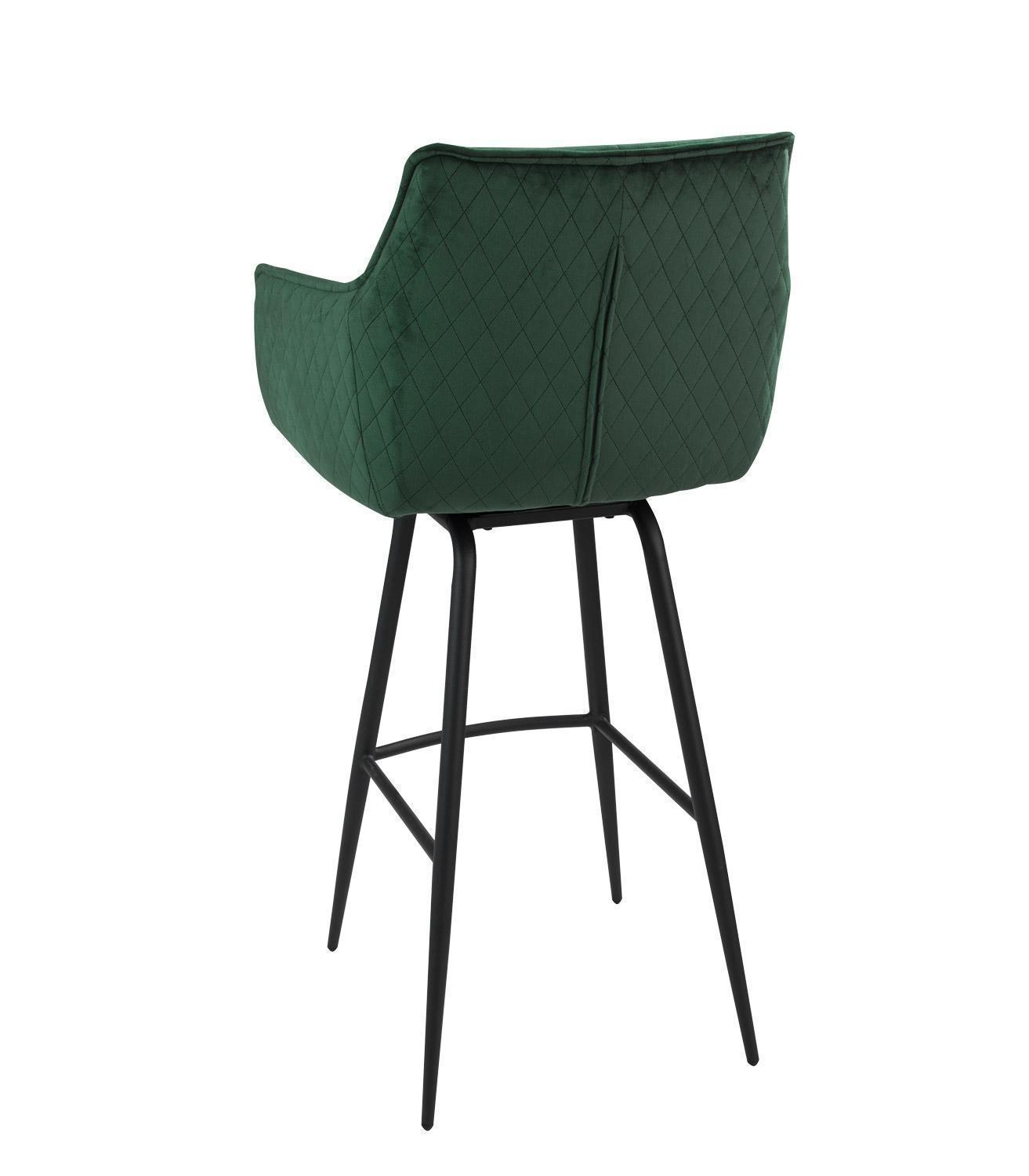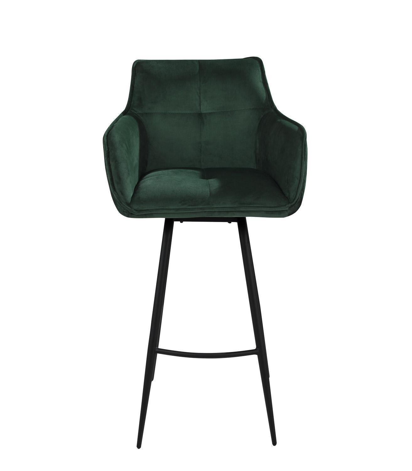 Der Barhocker JORIS von Home4You vereint stilvolles Design und hohen Komfort. Mit seinem eleganten grünen Samtbezug und einem stabilen Metallgestell in Schwarz ist er ein echter Hingucker. Die bequemen Armlehnen und die praktische Fußablage sorgen für zusätzlichen Sitzkomfort. Der Hocker ist 360 Grad drehbar ohne Rückstellfunktion, was Flexibilität ermöglicht. Mit einer Breite von 55 cm, einer Höhe von 106 cm und einer Tiefe von 50 cm bietet er ausreichend Platz. Die maximale Belastbarkeit liegt bei 120 kg.
