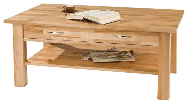 Der Couchtisch von Home4You besteht aus massiver Kernbuche, die lackiert ist. Er misst 110 x 70 cm und verfügt über 2 Schubladen für zusätzlichen Stauraum. Die Farbe des Tisches ist Braun. Die Höhe beträgt 48 cm. Sowohl die Tischplatte als auch das Gestell sind aus Holz gefertigt. Zusätzlich bietet der Tisch eine Ablagefläche. Er wird teilmontiert geliefert und der Versand erfolgt per Spedition.