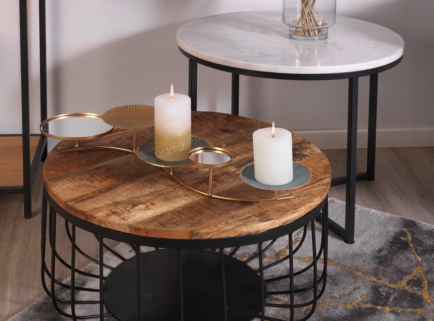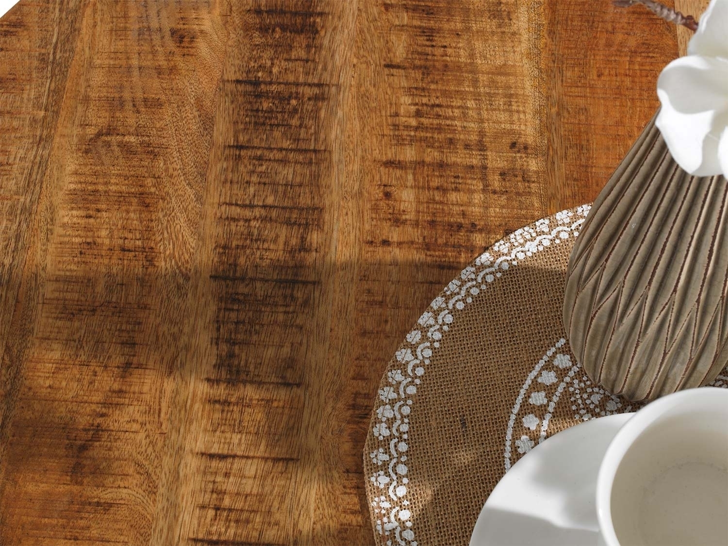 Der Home4You Tisch begeistert mit einer Tischplatte aus Mangoholz, einem Durchmesser von 90 cm und einem eleganten schwarzen Metallgestell. Das schicke Korb-Design verleiht dem Tisch einen zeitgemäßen Charme. Die Tischplatte ist fest angebracht, und die Kombination von Mangoholz und Metall schafft eine stilvolle Ergänzung für Ihr Zuhause.