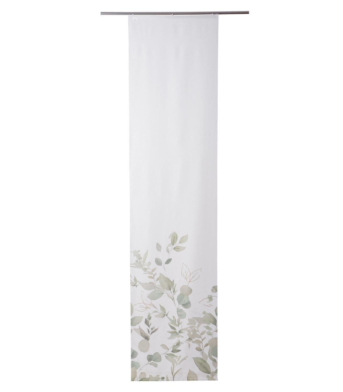 Der Flächenvorhang der Marke Home4You ist in Weiß erhältlich. Er besteht aus Polyester und ist mit Blätter- und Blumenmotive in Lindgrün versehen. Die Lieferung erfolgt inklusive Technik zur Anbringung. Der Vorhang hat eine Länge von 245 cm und eine Breite von 60 cm und ist bei 60 °C waschbar.