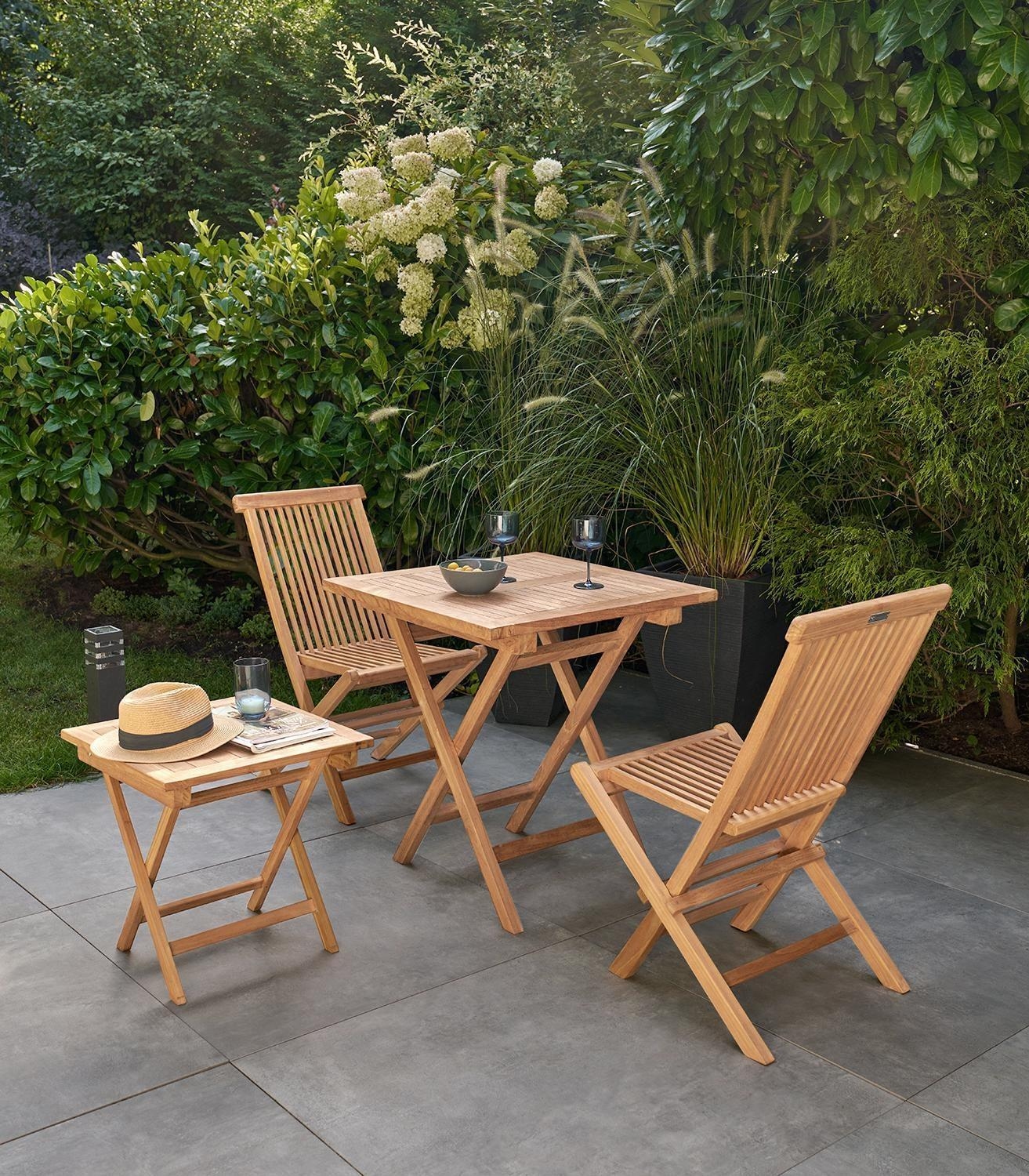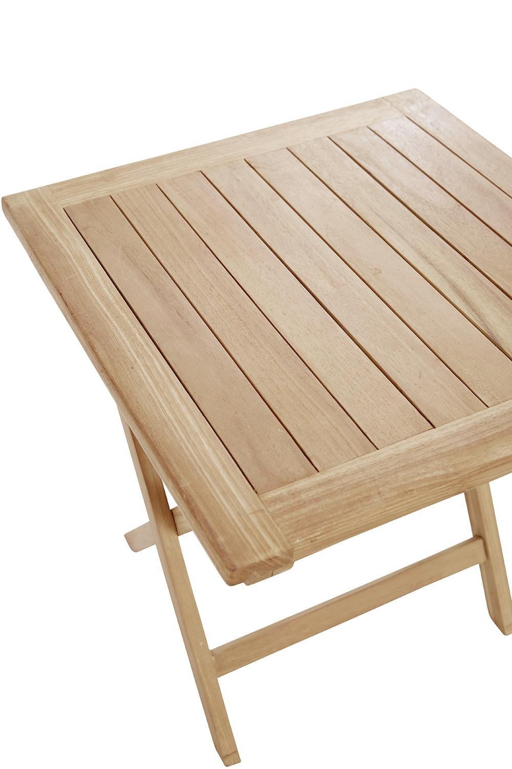 Das Gestell und die Tischplatte aus Teakholz sind robust und witterungsbeständig. Durch die natürlichen Öle im Holz ist der Beistelltisch bereits gut geschützt und hat eine hohe Lebensdauer. Zu Beginn können die Farbpigmente im Holz durch Nässe und Regen herausgewaschen werden und somit Flecken auf hellen Bodenbelägen verursachen. Deshalb wird es empfohlen, den Tisch auf einem unempfindlichen Untergrund mehrmals zu wässern, um das Auswaschen der Farbpigmente zu beschleunigen.