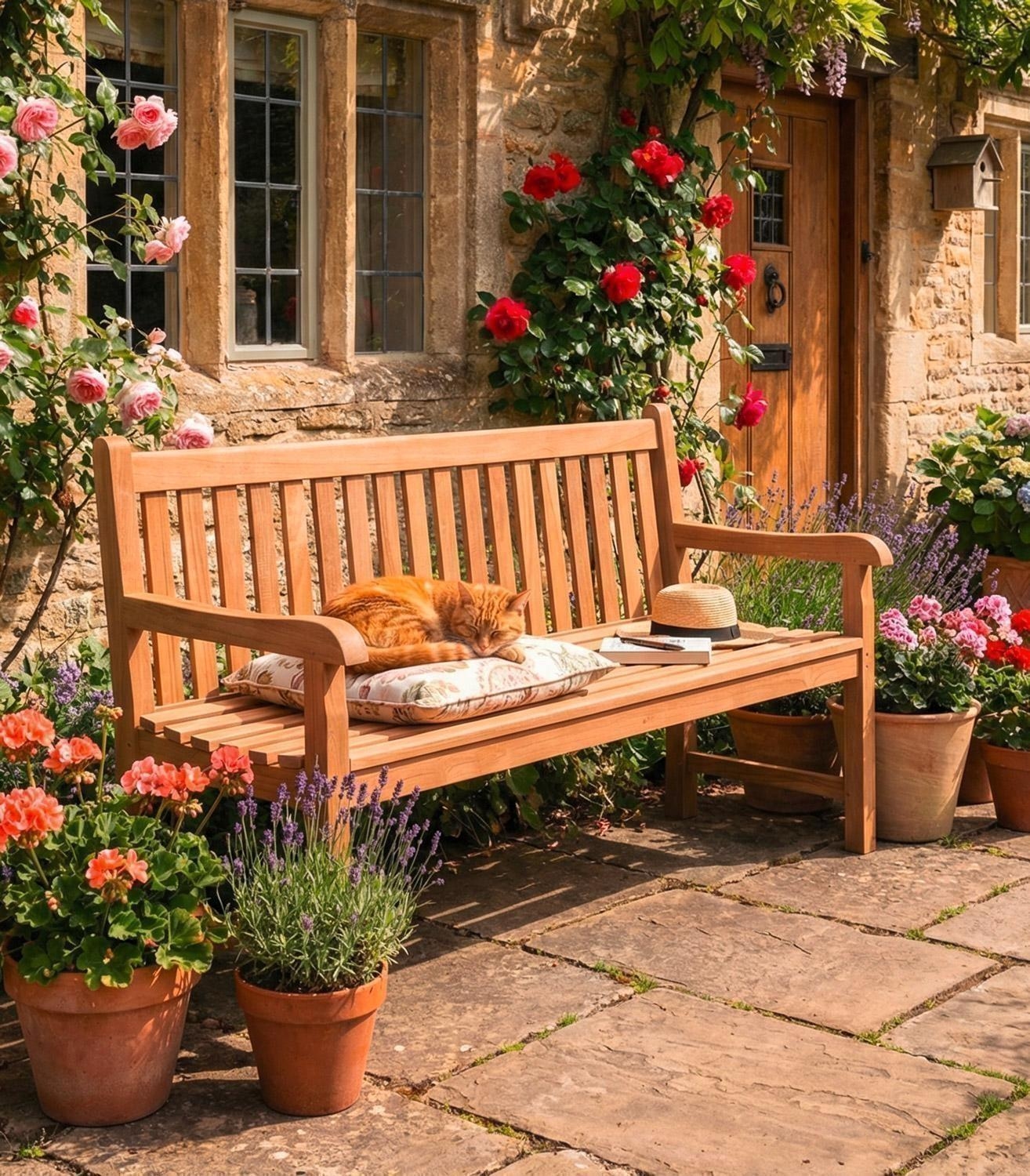 Das Gestell aus Teakholz ist robust und witterungsbeständig. Durch die natürlichen Öle im Holz ist die Gartenbank bereits gut geschützt und hat eine hohe Lebensdauer. Zu Beginn können die Farbpigmente im Holz durch Nässe und Regen herausgewaschen werden und somit Flecken auf hellen Bodenbelägen verursachen. Deshalb wird es empfohlen, die Bank auf einem unempfindlichen Untergrund mehrmals zu wässern, um das Auswaschen der Farbpigmente zu beschleunigen.