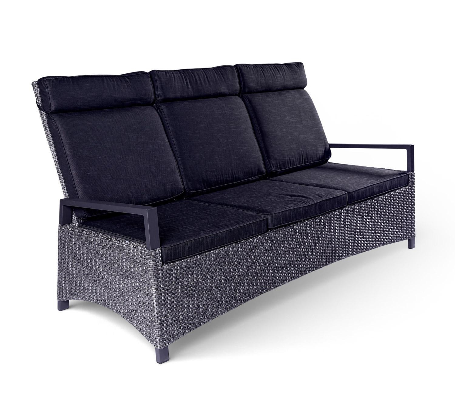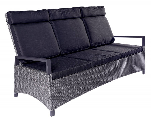 Die Stabilität und Witterungs- sowie UV-Beständigkeit erhält die Gartenbank durch ein Gestell aus anthrazitfarbenem Aluminium. Ein doppelt halbrundes Geflecht aus Polyrattan im modernen Grau-Mix bespannt das Gestell. Das Material Polyrattan ist ebenfalls wetterfest und leicht. Die mitgelieferten Stoffkissen in Grau sorgen für eine weiche Sitzfläche und fügen sich auch optisch perfekt ein. Jede der drei Sitzflächen dieser Gartenbank ist jeweils bis etwa 110 kg belastbar und lässt sich dank verstellbarer Rückenlehnen auch an unterschiedliche Bedürfnisse anpassen.