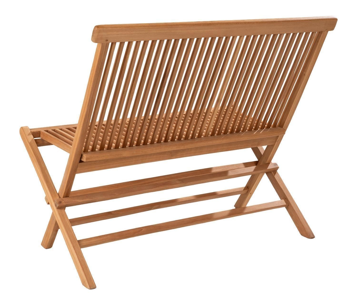 Die Gartenbank RIVA der Marke Home4You ist aus massivem Teakholz gefertigt und verfügt über eine Rückenlehne. Diese Holzsitzbank bietet Platz für zwei Personen und weist eine Breite von 100 cm, eine Höhe von 89 cm sowie eine Tiefe von 43 cm auf. Ein funktionales Merkmal dieser Bank ist die Möglichkeit, sie platzsparend zusammenzuklappen. Durch die Klappfunktion lässt sich diese Sitzgelegenheit bei Bedarf flexibel verstauen.