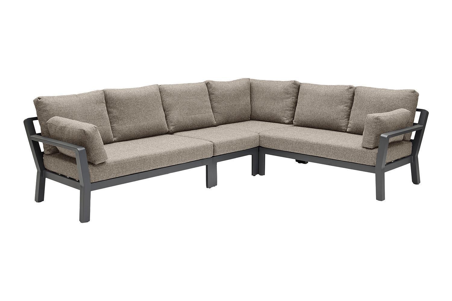 Die 3-teilige Gartenlounge AVENA der Marke Home4You verfügt über ein Gestell aus Aluminium in der Farbe Anthrazit. Diese Ecklounge setzt sich aus zwei 2-Sitzern sowie einem Eckelement zusammen und weist eine Gesamtbreite von 279 cm, eine Höhe von 72 cm sowie eine Tiefe von 279 cm auf. Zum Lieferumfang der Gartenmöbel-Gruppe gehören drei Sitzkissen, sechs Rückenkissen und zwei Armlehnkissen, die jeweils mit braunen Webstoffbezügen ausgestattet sind.