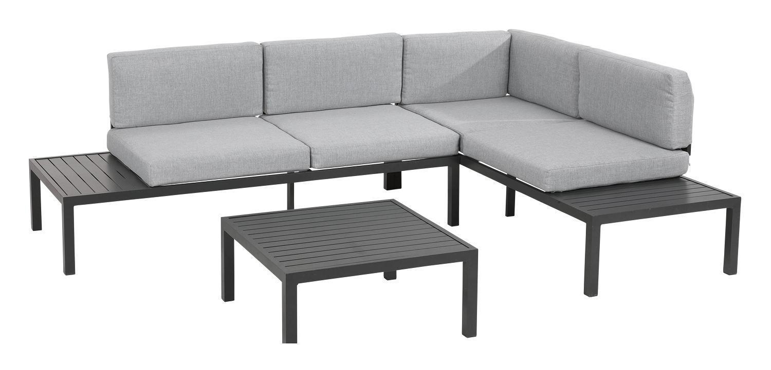 Das Gestell der Gartenlounge besteht aus pulverbeschichtetem Aluminium. Die beiden Bänke und der Couchtisch aus Aluminium sind wegen des geringen Gewichts leicht zu Handhaben. Das rostfreie Aluminium erhält durch hochwertige Polyesterbeschichtung ein edles Oberflächenfinish, welches es unempfindlich gegen Witterungseinflüsse und absolut pflegeleicht macht. Die Bezüge sind bis 30° Grad waschbar, jedoch wird eine Reinigung per Hand empfohlen.