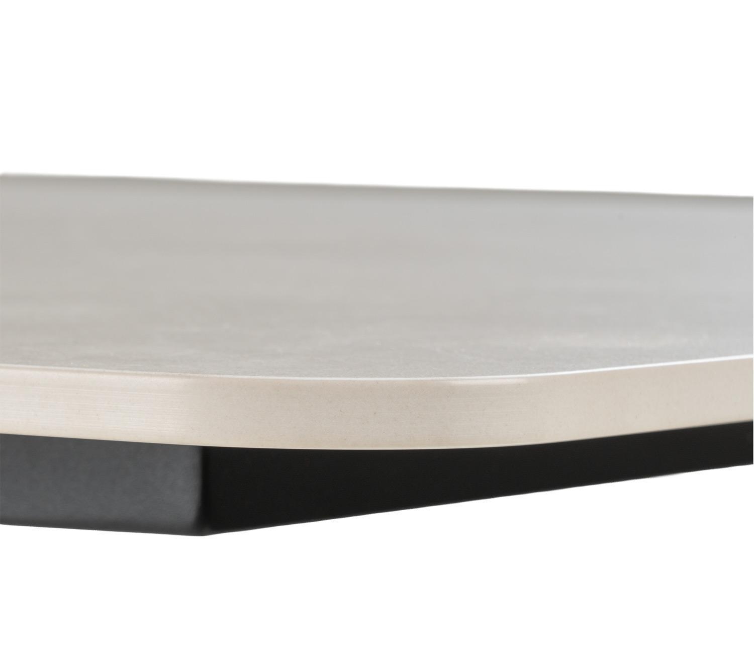 Die Tischplatte des Gartentisches besteht aus gesintertem Stein und ist gut für den Outdoor-Bereich geeignet. Dieses Material besteht aus natürlichen Mineralien und Rohstoffen, die unter sehr hohem Druck miteinander verpresst und anschließend bei hoher Temperatur gebrannt werden. Die Tischplatte ist kratzfest, fleckenabweisend und pflegeleicht.