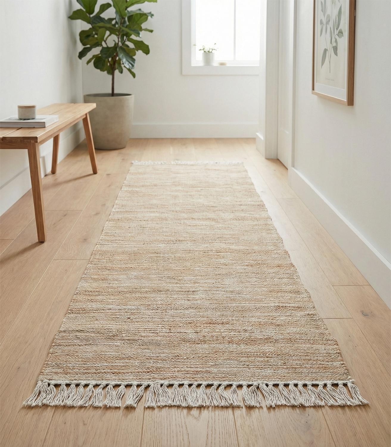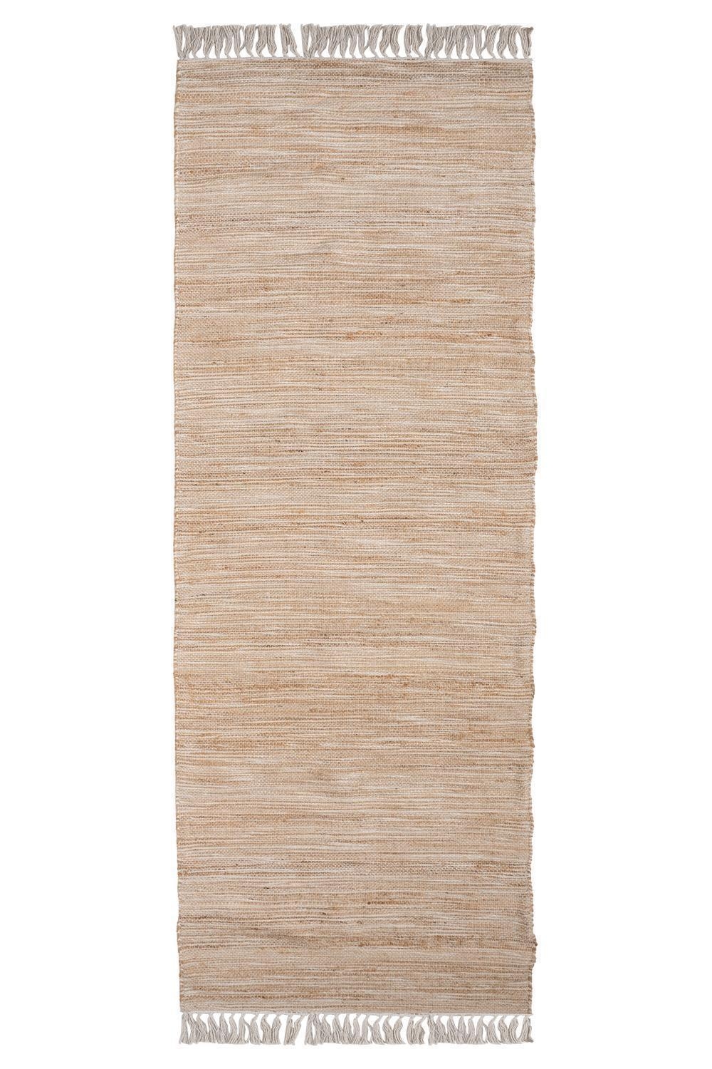 Der Handwebteppich von Home4You überzeugt mit seinem melierten Muster in Beige und Weiß sowie dekorativen weißen Quasten. Mit einer Größe von 80 x 250 cm eignet er sich ideal für verschiedene Wohnbereiche. Das Mischgewebe aus Jute, Wolle und Baumwolle verleiht ihm eine natürliche Ausstrahlung. Als stilvolles Wohnaccessoire lässt sich der Teppich vielseitig kombinieren.