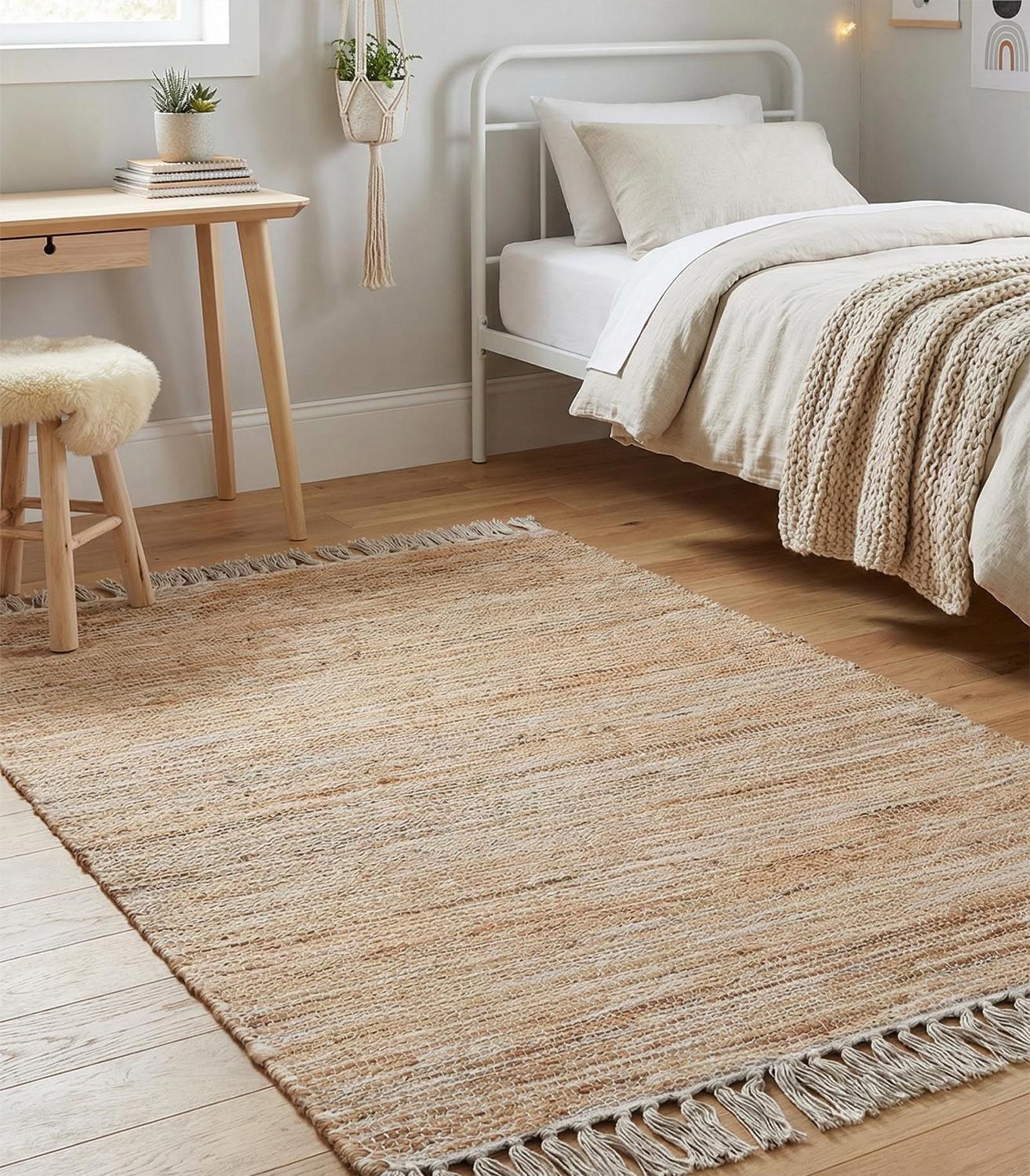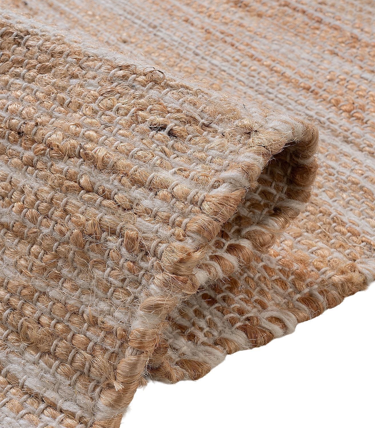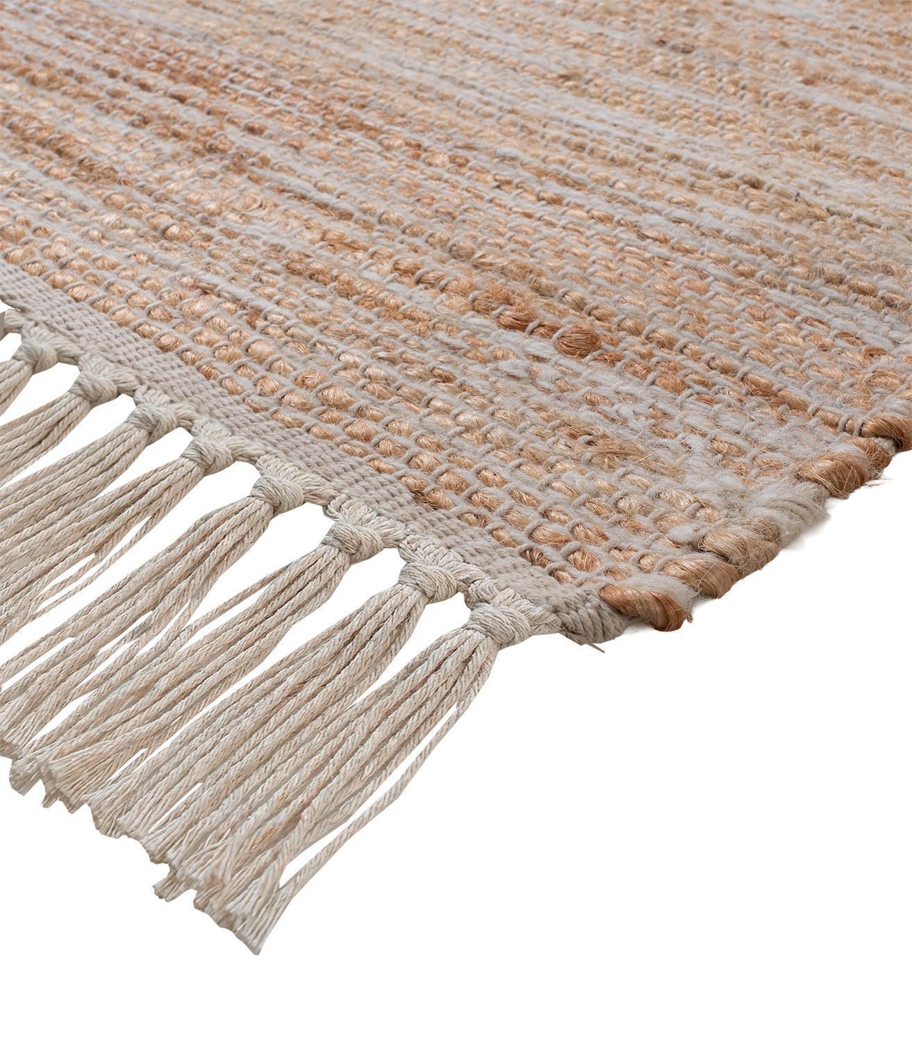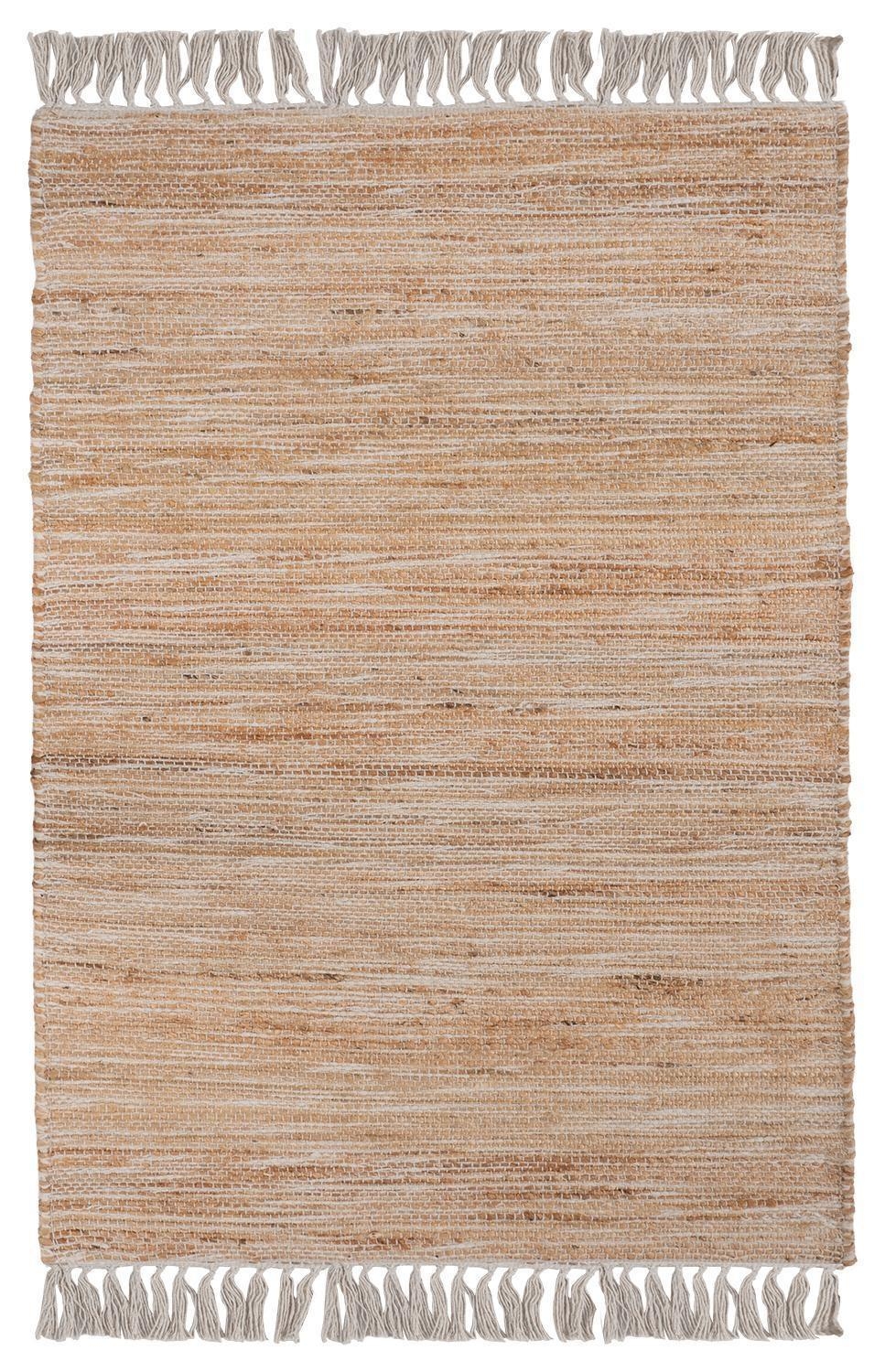 Der Handwebteppich von Home4You überzeugt mit seinem melierten Muster in Beige und Weiß sowie dekorativen weißen Quasten. Mit einer Größe von 70 x 120 cm eignet er sich ideal für verschiedene Wohnbereiche. Das Mischgewebe aus Jute, Wolle und Baumwolle verleiht ihm eine natürliche Ausstrahlung. Als stilvolles Wohnaccessoire lässt sich der Teppich vielseitig kombinieren.