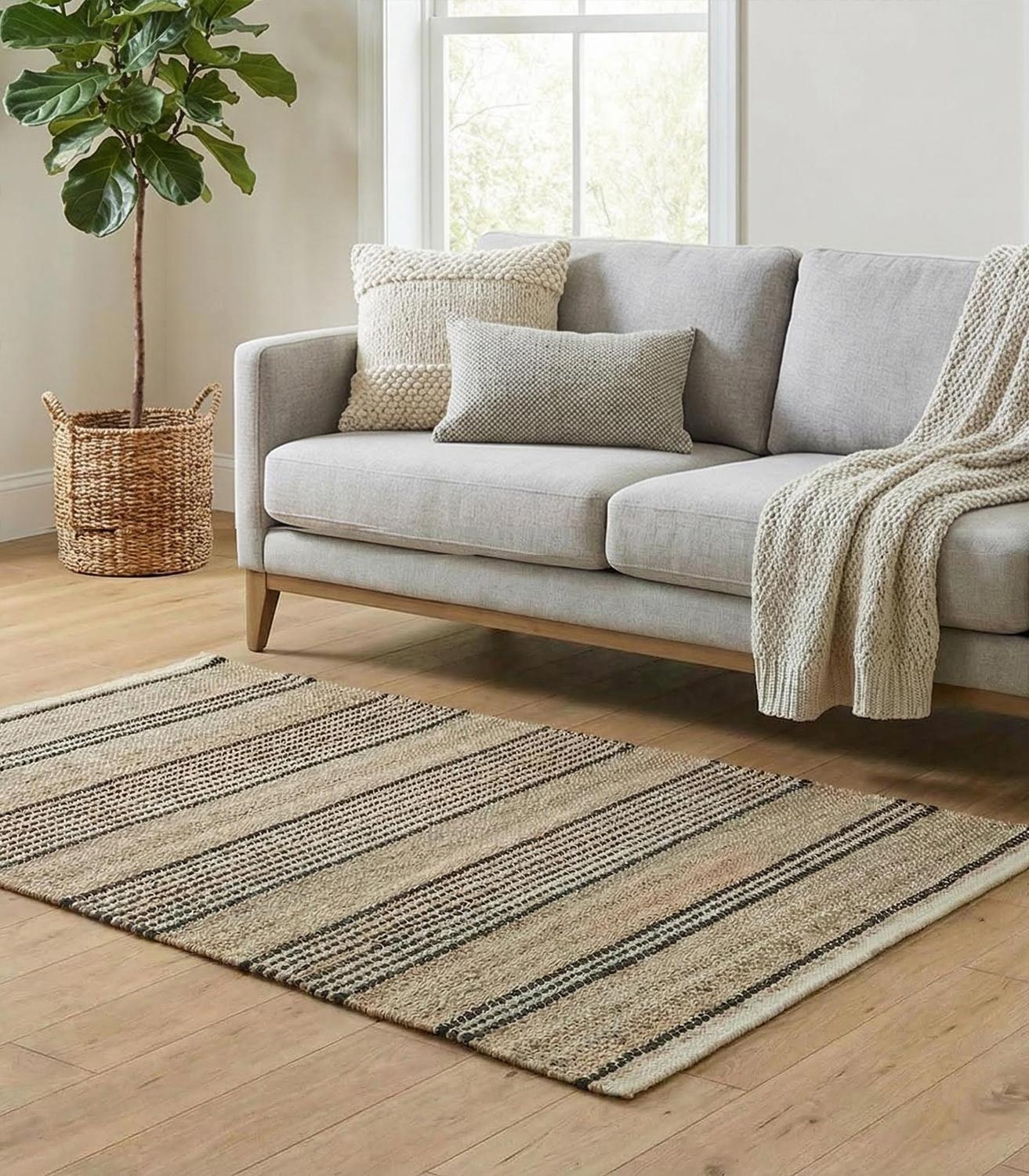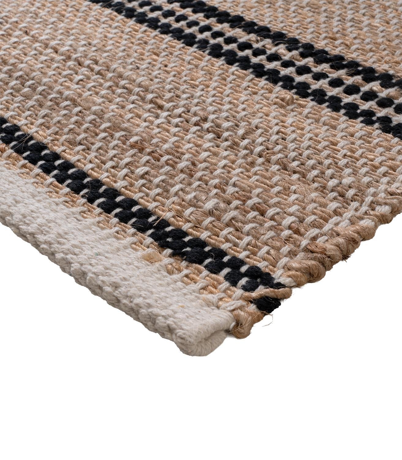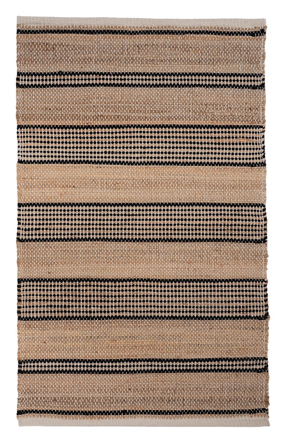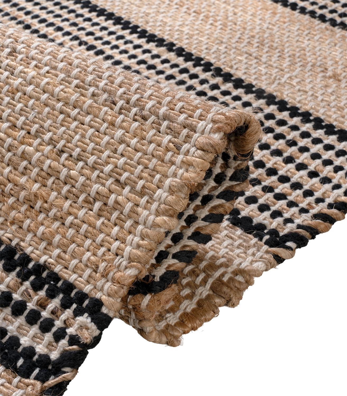 Der Handwebteppich von Home4You überzeugt mit seinem melierten Design in Beige und Weiß sowie einem Streifenmuster in Schwarz. Mit einer Größe von 70 x 120 cm eignet er sich ideal für verschiedene Wohnbereiche. Gefertigt aus einem Mischgewebe aus Jute und Baumwolle, bringt er eine natürliche Ausstrahlung in den Raum und lässt sich vielseitig kombinieren.