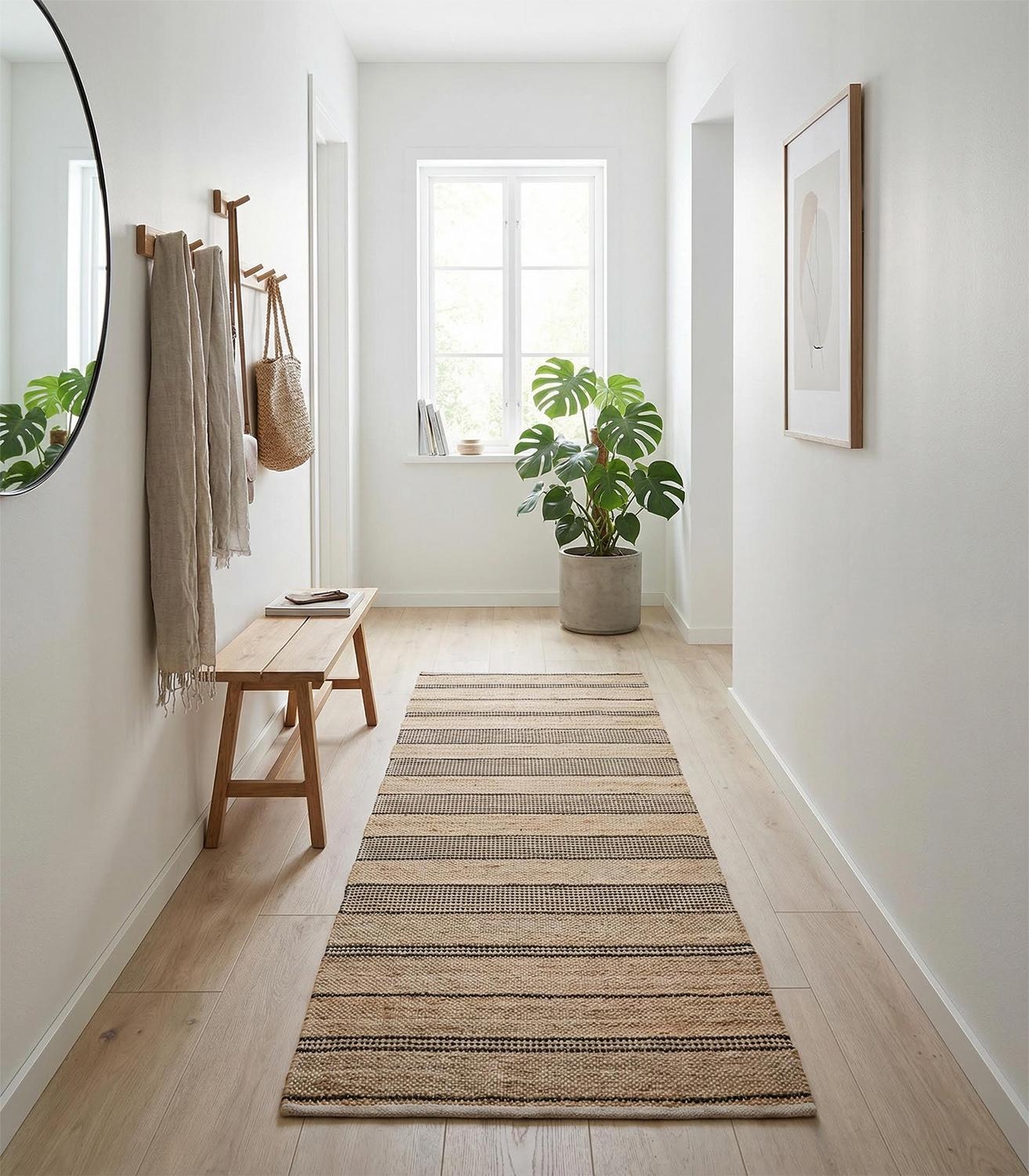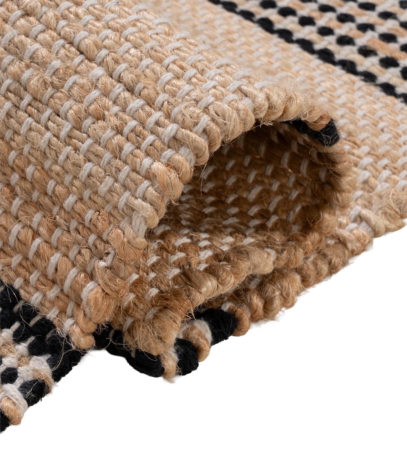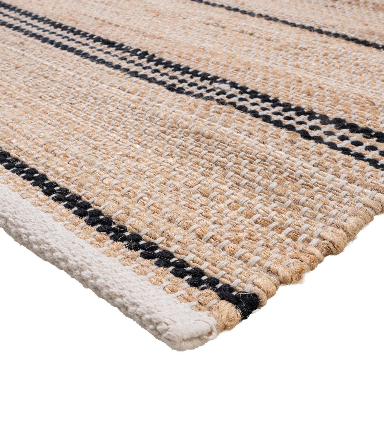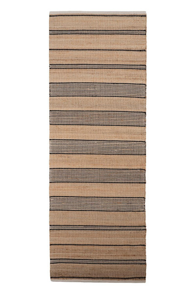 Der Handwebteppich von Home4You überzeugt mit seinem melierten Design in Beige und Weiß sowie einem Streifenmuster in Schwarz. Mit einer Größe von 80 x 250 cm eignet er sich ideal für verschiedene Wohnbereiche. Gefertigt aus einem Mischgewebe aus Jute und Baumwolle, bringt er eine natürliche Ausstrahlung in den Raum und lässt sich vielseitig kombinieren.