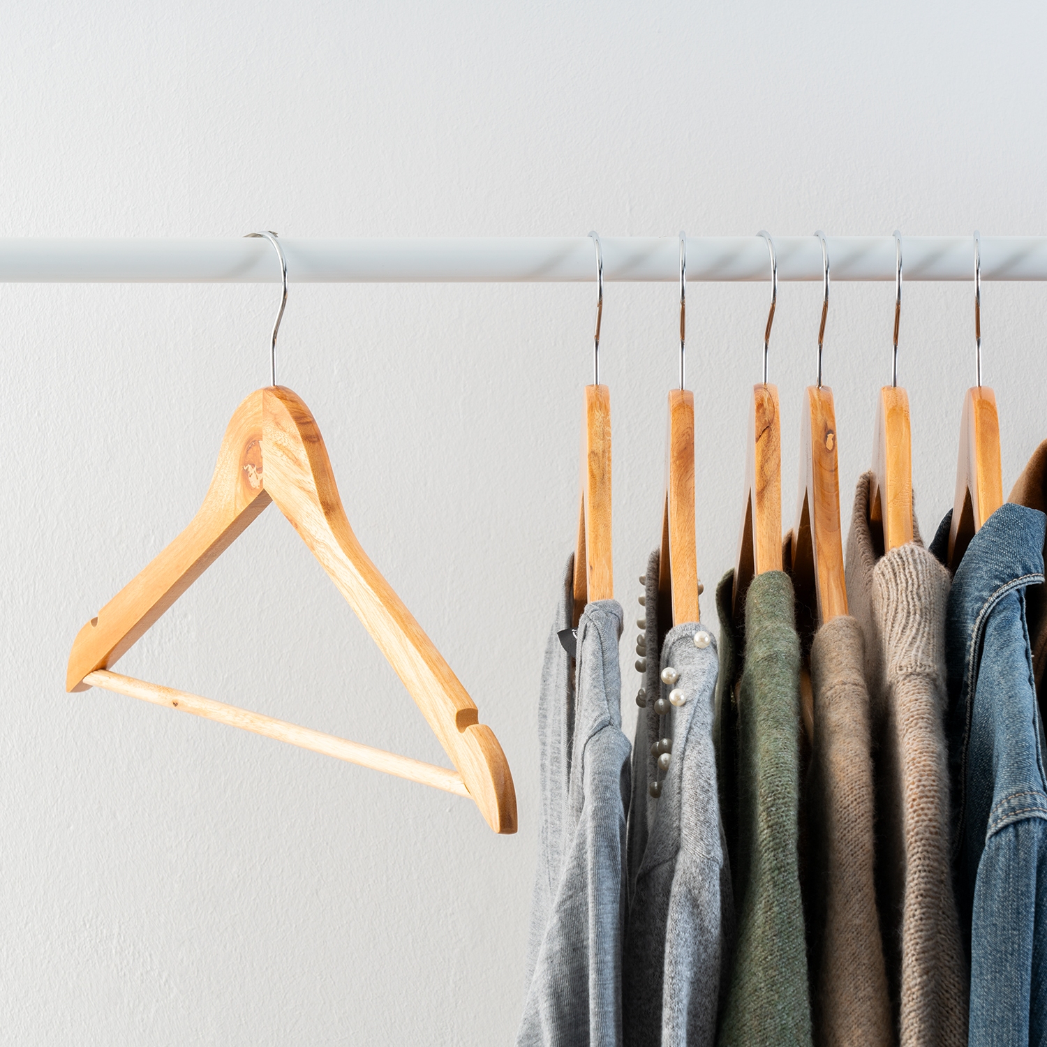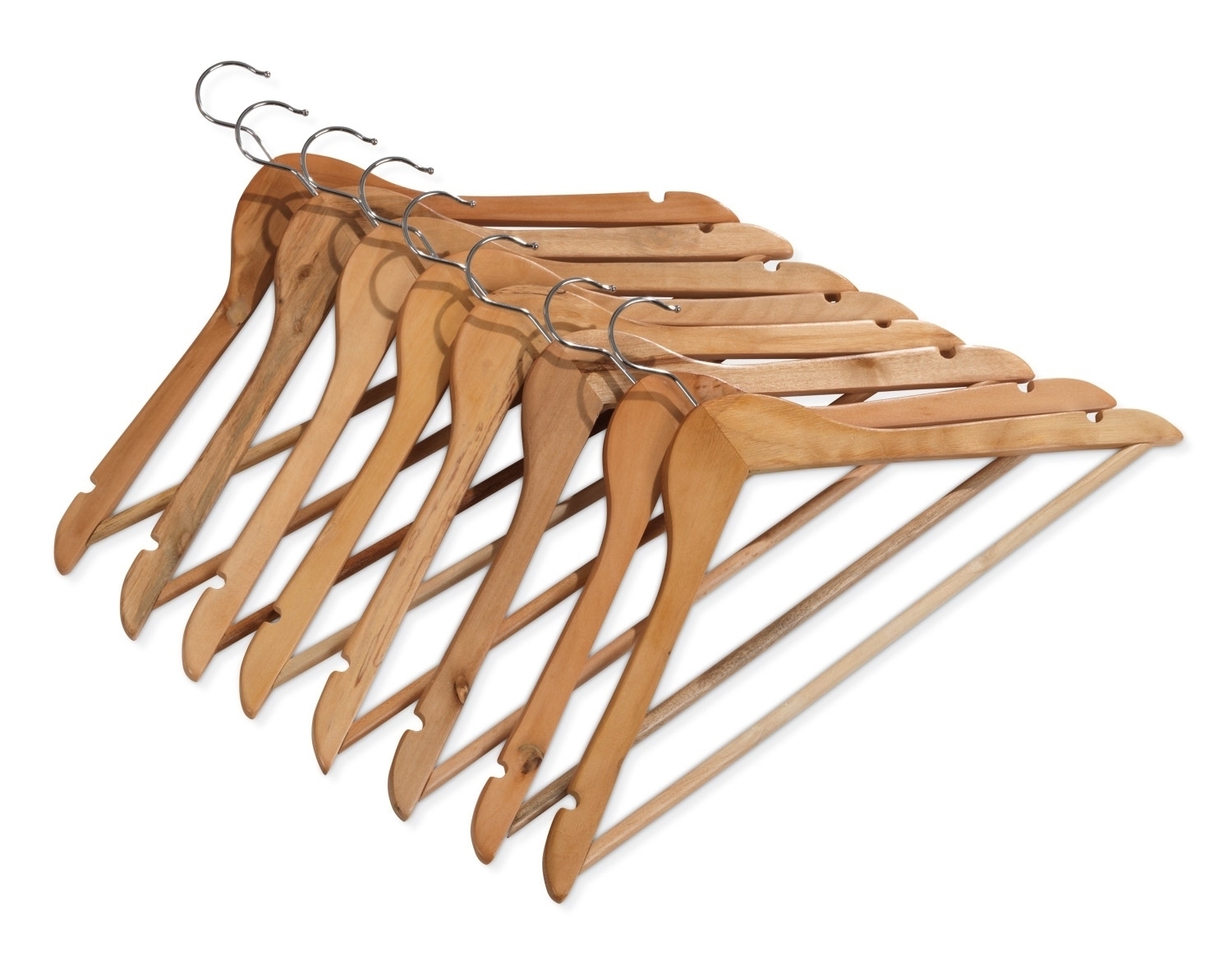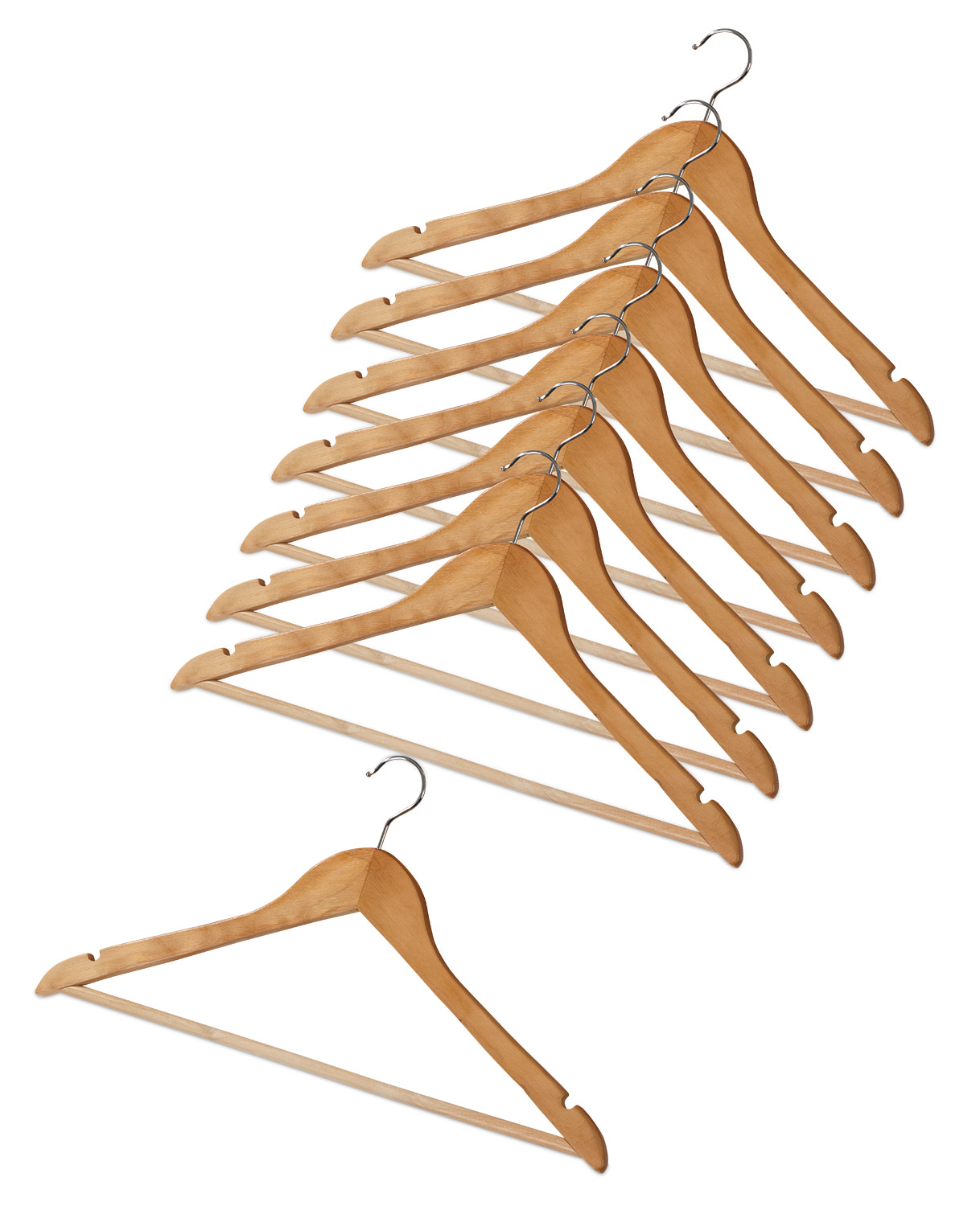 Zum günstigen Preis erhalten sie acht funktionale Kleiderbügel aus Holz und sind nicht mehr auf Plastikbügel aus dem Kaufhaus angewiesen. Ganz egal ob T-Shirt oder Pullover, Hose oder Rock, Jacke oder Mantel, mit den 8 Kleiderbügeln hängen Sie Ihre Kleidungsstücke sorgfältig und schonend auf. Die Bügel sind echte Multitalente - dank Rockkerbe und Hosensteg sowie drehbaren Haken fällt nichts herunter. Im Vergleich zu vielen anderen Kleiderbügeln sind diese vollständig aus Holz hergestellt und dadurch langlebig und stabil. Ergänzen Sie Kleiderschrank, Garderobe oder Kleiderständer mit diesen Kleiderbügeln im 8er Set.