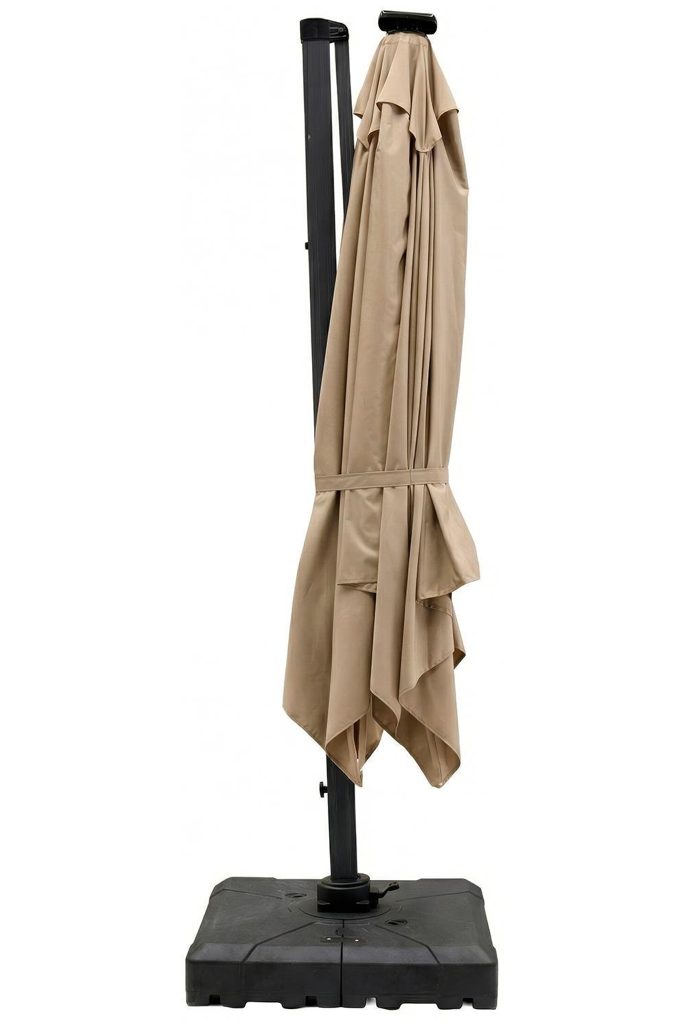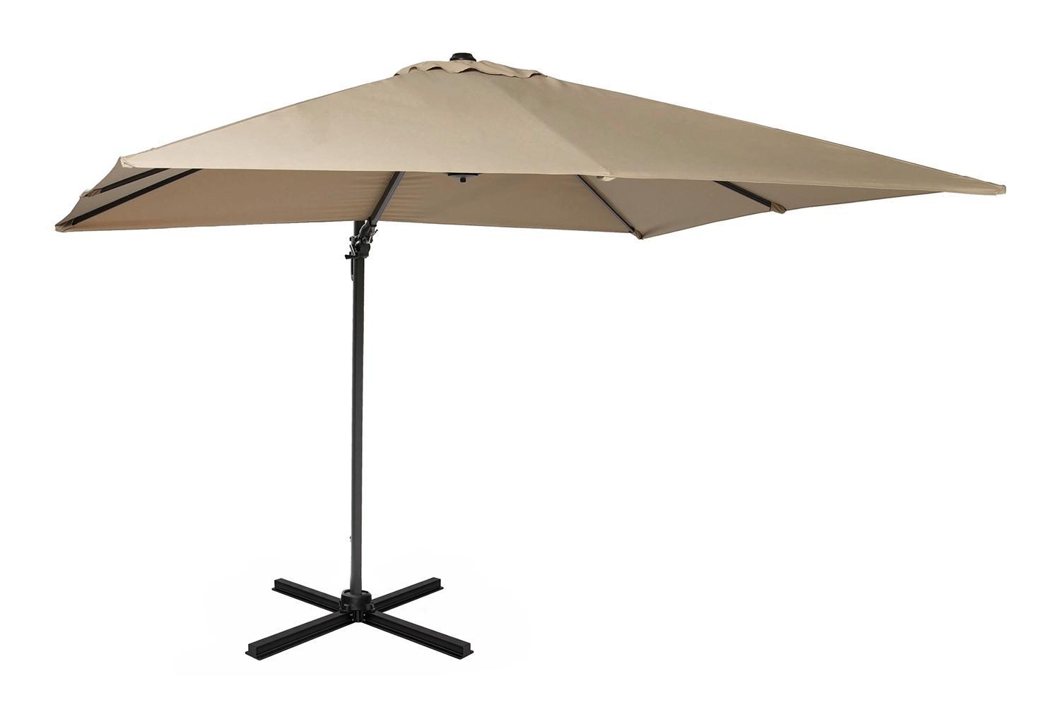 Der LED-Ampel-Sonnenschirm SOLEI der Marke Home4You verfügt über einen taupefarbenen Schirm aus Polyester und ein Gestell aus Aluminium in Anthrazit. Die Ausstattung umfasst ein Solarpaneel sowie eine in die Streben integrierte LED-Beleuchtung. Zur Bedienung sind eine Handkurbel und ein Schiebemast vorhanden, die eine 360-Grad-axiale Drehung sowie das Schwenken des Schirms ermöglichen. Im Lieferumfang sind ein Standkreuz und eine Schutzhülle enthalten, während Sockelplatten separat zu ergänzen sind. Die Breite beträgt 300 cm bei einer Tiefe von 300 cm und einer Gesamthöhe von 256 cm.