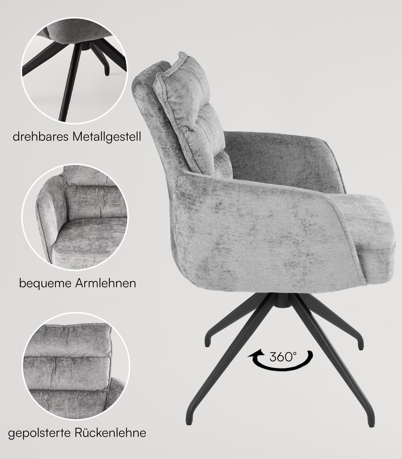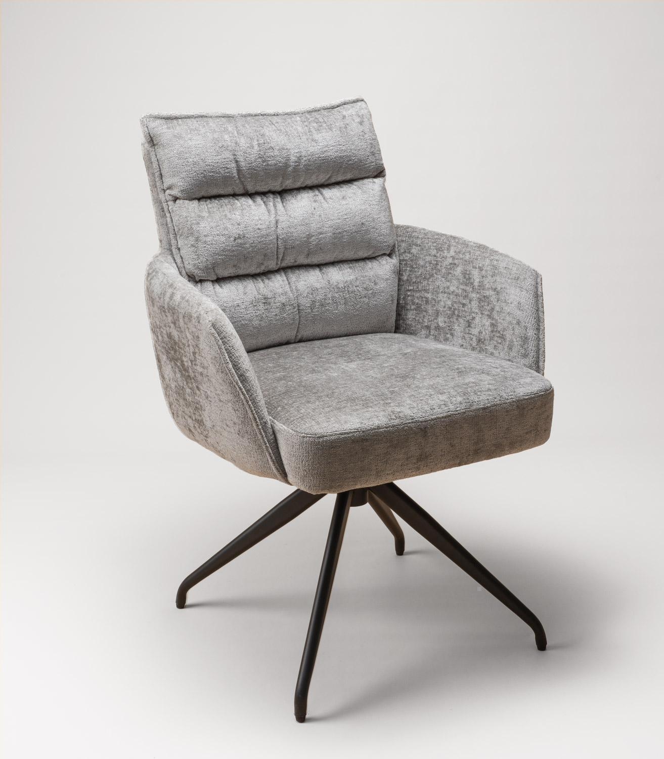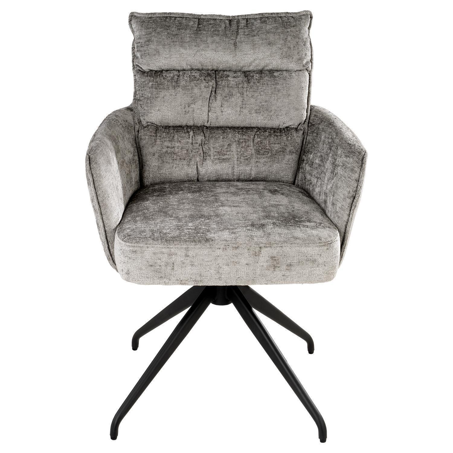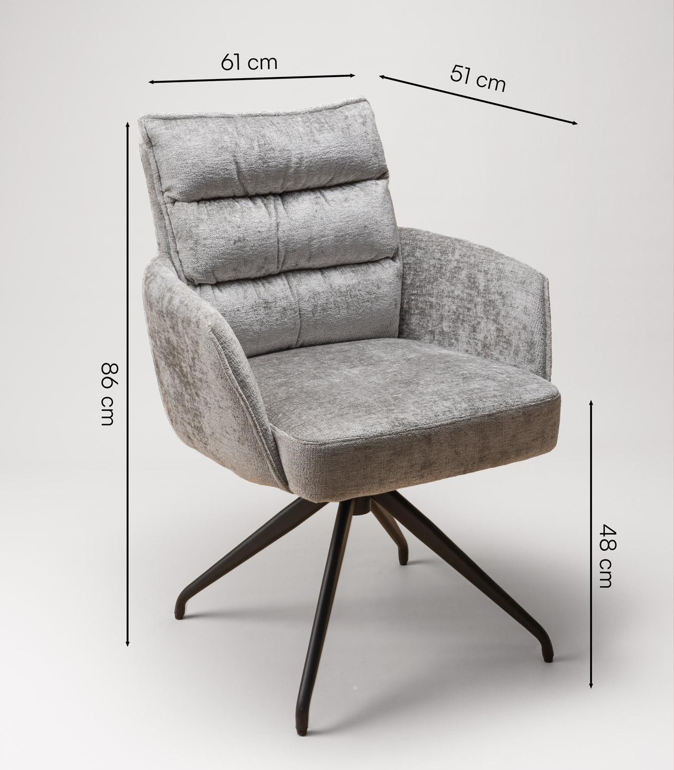 Der Polsterstuhl ALFI der Marke Home4You ist mit einem Webstoffbezug in der Farbe Grau ausgestattet. Das Gestell besteht aus schwarzem Metall, was für Stabilität sorgt. Der Stuhl verfügt über gepolsterte Armlehnen sowie Quersteppungen in der Rückenlehne, die das Design strukturieren. Eine 360-Grad-Drehfunktion ermöglicht eine flexible Nutzung. Die Abmessungen des Stuhls betragen 61 cm in der Breite, 86 cm in der Höhe und 51 cm in der Tiefe. Die Sitzhöhe liegt bei 48 cm, die Sitztiefe bei 45 cm.