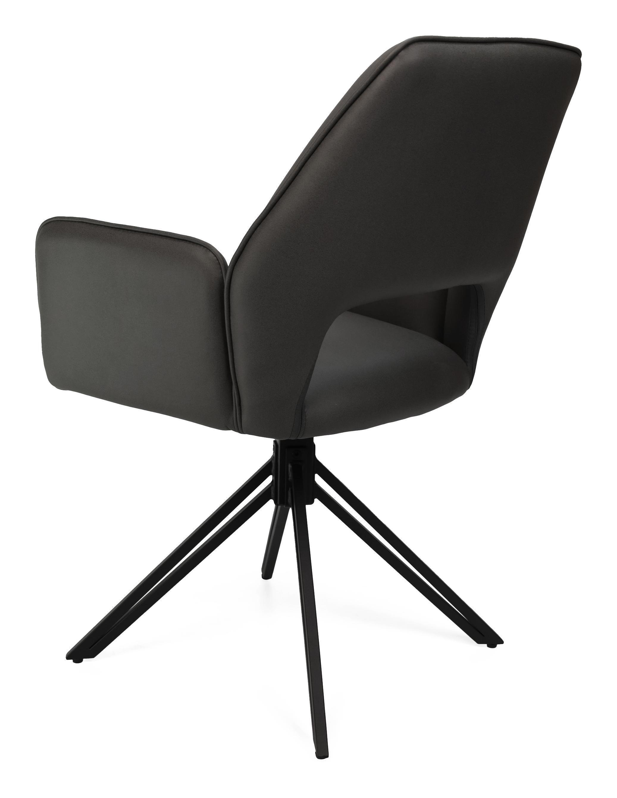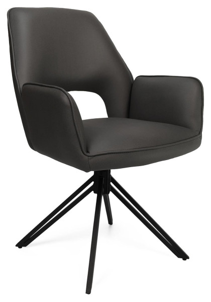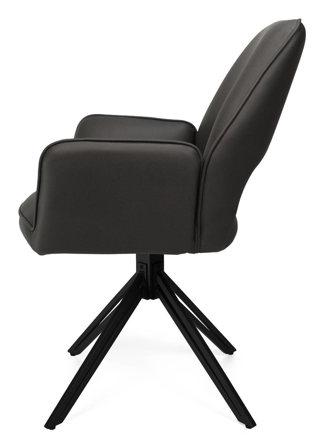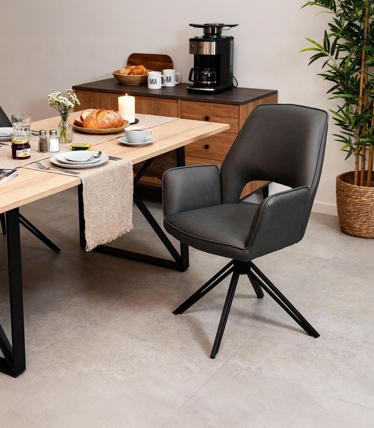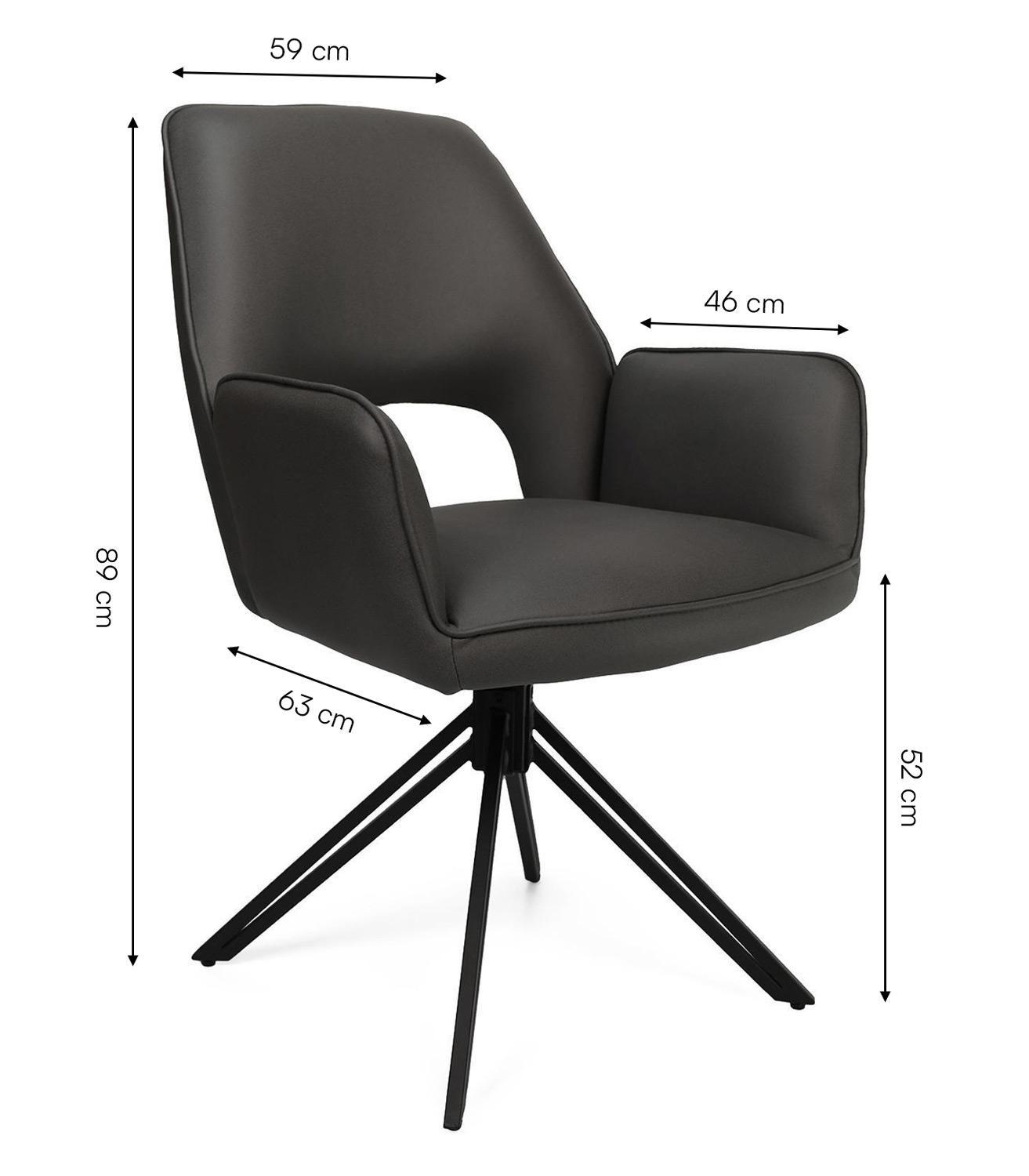 Der Polsterstuhl KENDALO der Marke Home4You ist mit einem anthrazitfarbenen Mikrofaserbezug in Lederoptik bezogen und verfügt über ein Gestell aus schwarz mattem Metall. Der Armlehnstuhl ist 360 Grad drehbar und besitzt gepolsterte Armlehnen. Seine Breite beträgt 59 cm, die Höhe 89 cm und die Tiefe 63 cm. Die Sitzhöhe liegt bei 52 cm, die Sitztiefe bei 46 cm. Die maximale Belastbarkeit beträgt 120 kg.