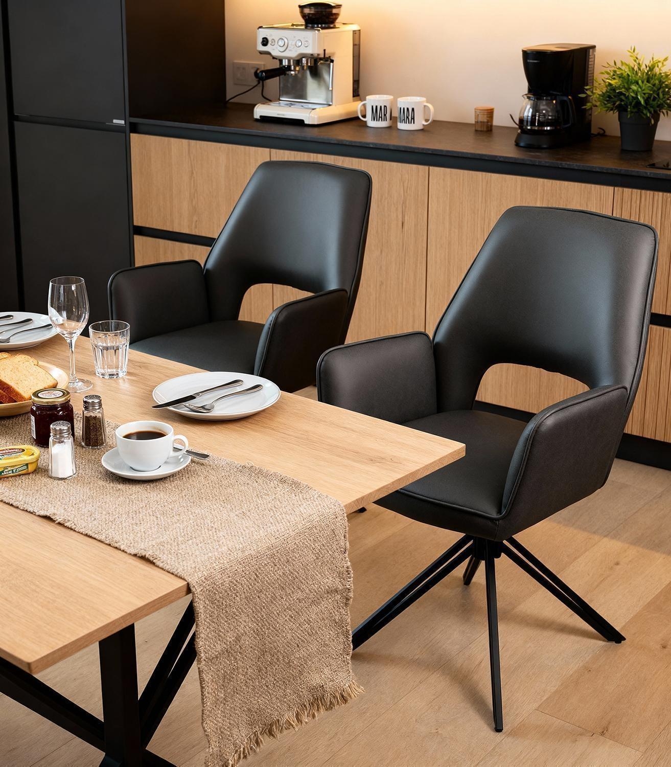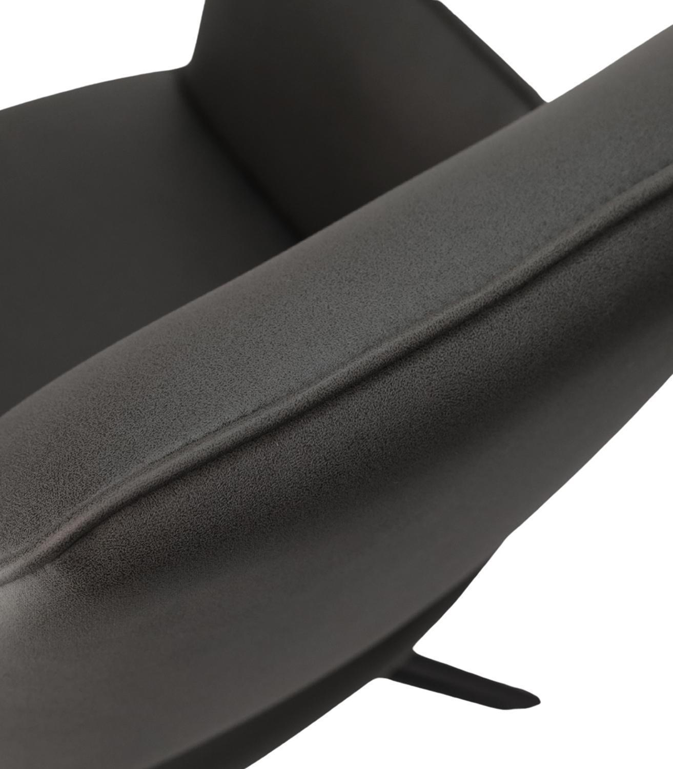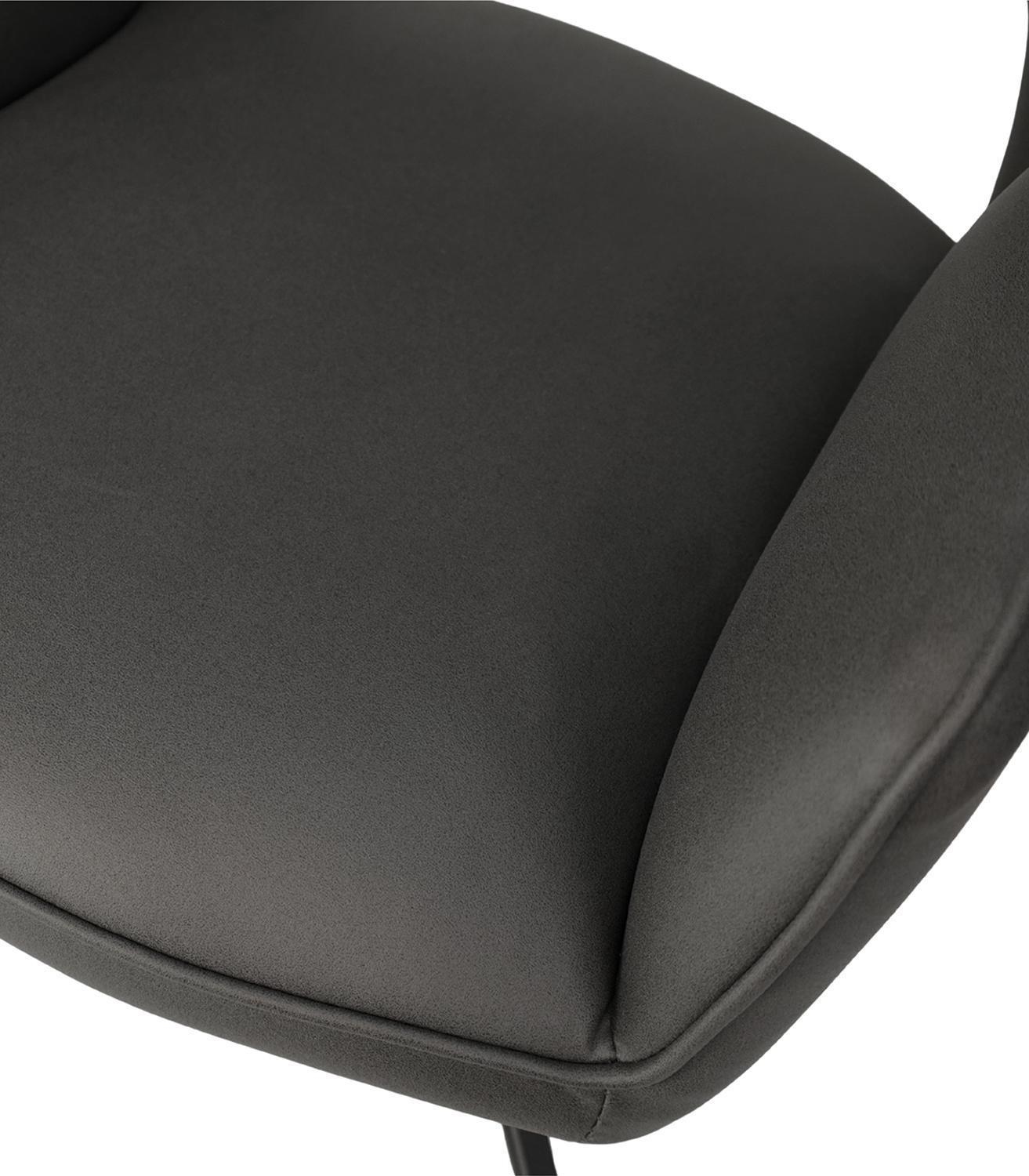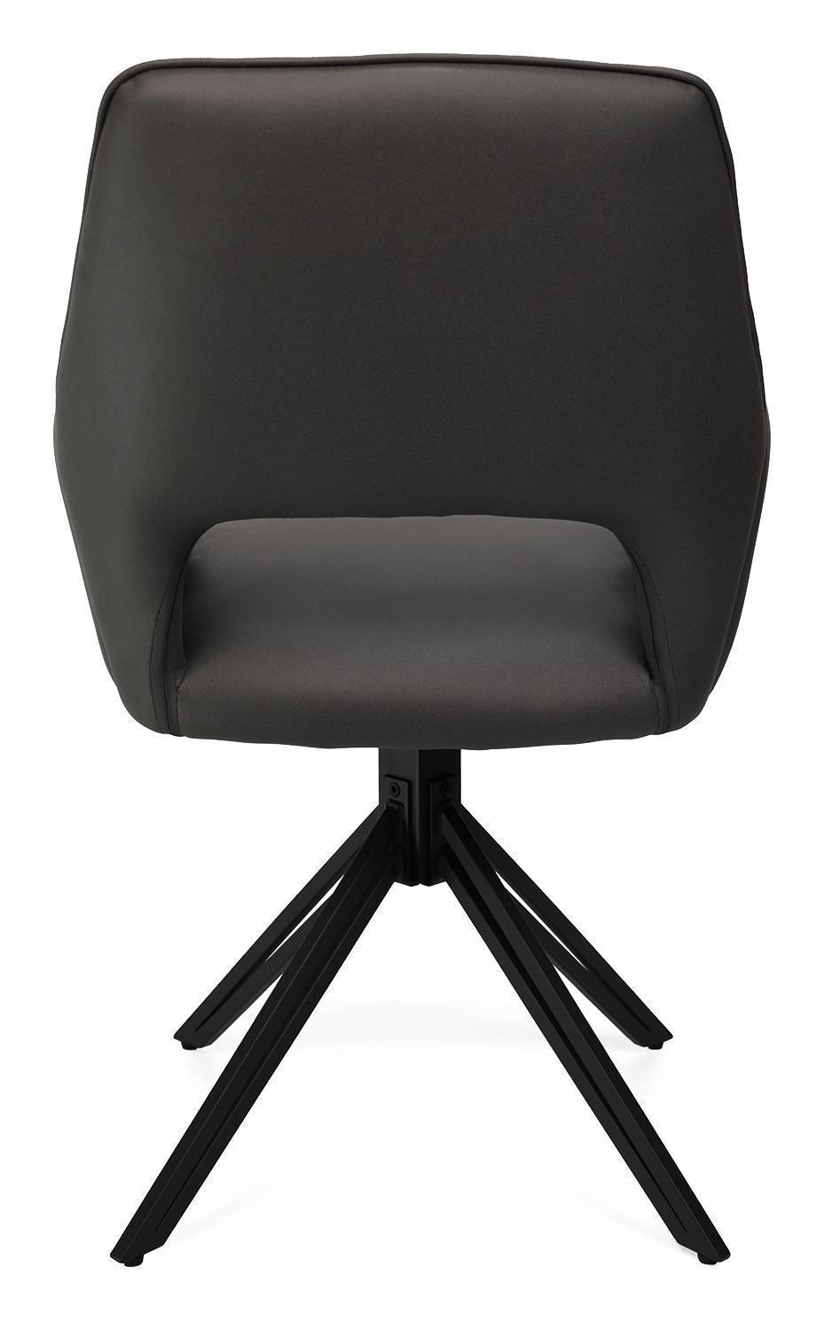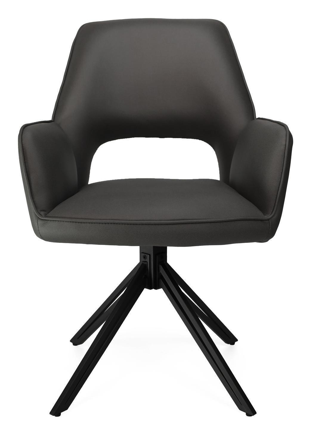 Der Polsterstuhl KENDALO der Marke Home4You ist mit einem anthrazitfarbenen Mikrofaserbezug in Lederoptik bezogen und verfügt über ein Gestell aus schwarz mattem Metall. Der Armlehnstuhl ist 360 Grad drehbar und besitzt gepolsterte Armlehnen. Seine Breite beträgt 59 cm, die Höhe 89 cm und die Tiefe 63 cm. Die Sitzhöhe liegt bei 52 cm, die Sitztiefe bei 46 cm. Die maximale Belastbarkeit beträgt 120 kg.