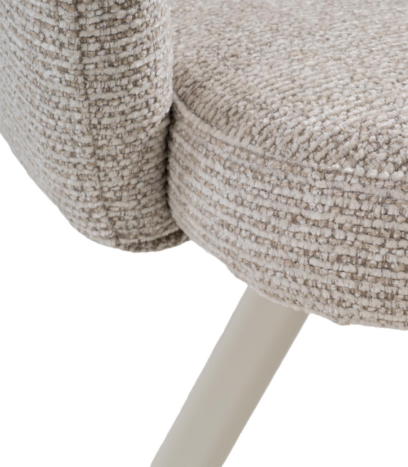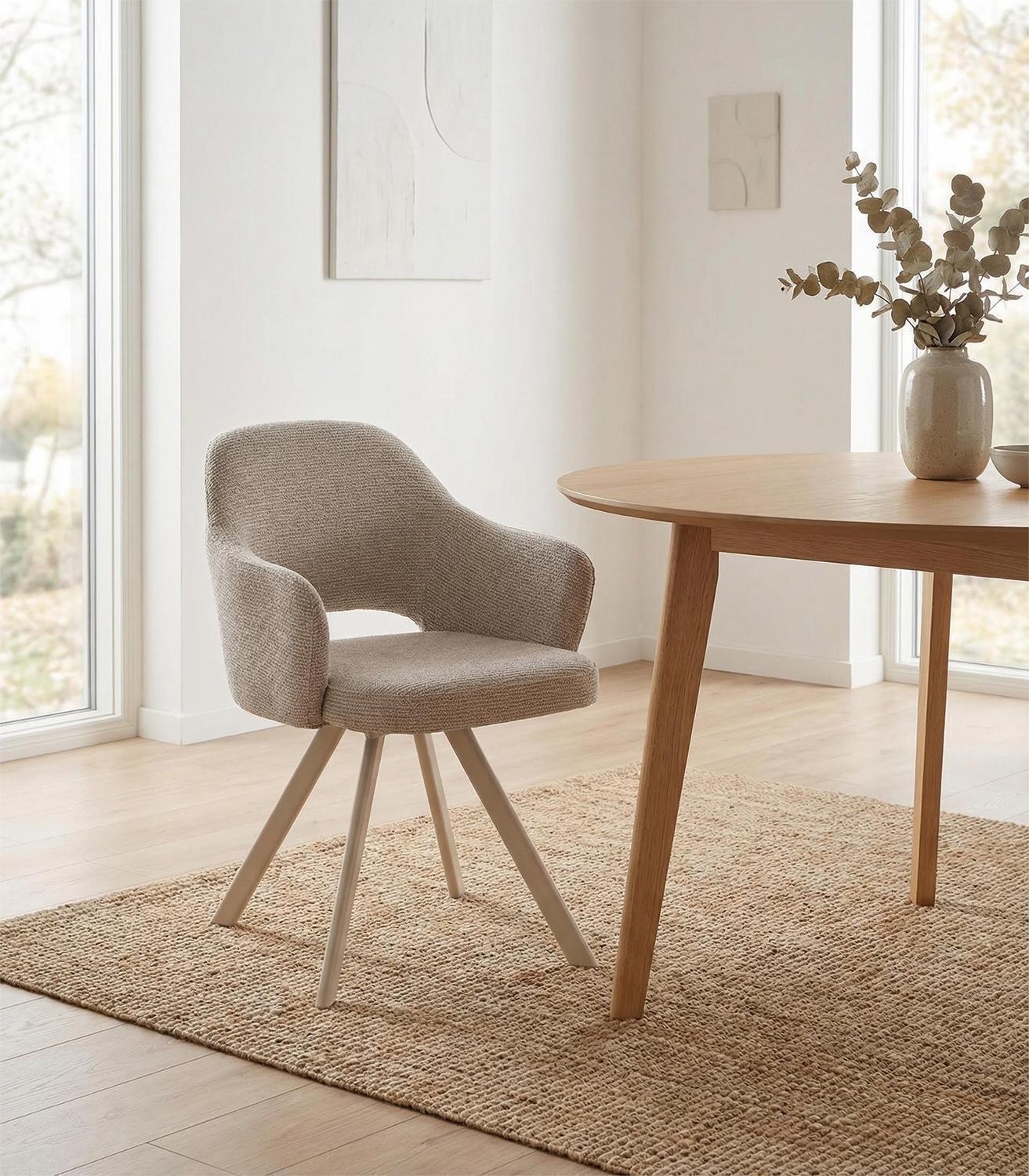 Der Polsterstuhl NILANA der Marke Home4You ist mit einem Polyesterbezug in Leinengrau ausgestattet und verfügt über ein Gestell aus Metall in Sandgrau matt. Der Armlehnstuhl ist um 180 Grad drehbar und mit einer Rückstellmechanik versehen. Zudem besitzt der Esszimmerstuhl gepolsterte Armlehnen. Mit einer Breite von 58 cm, einer Höhe von 83 cm und einer Tiefe von 61 cm ist der Stuhl für Esszimmer, Wohnzimmer und Küche geeignet.