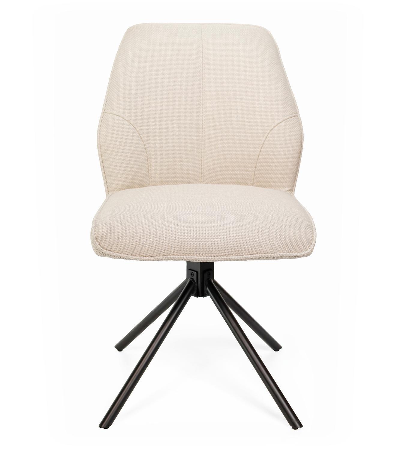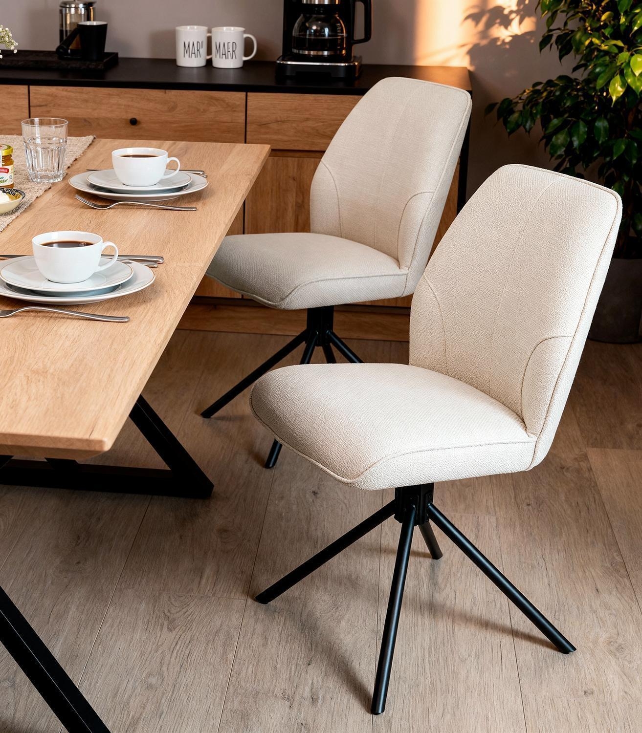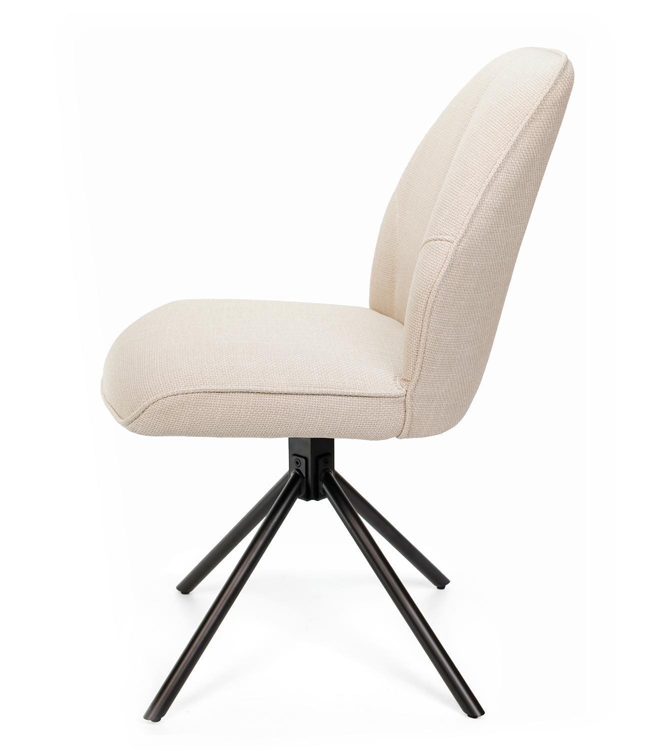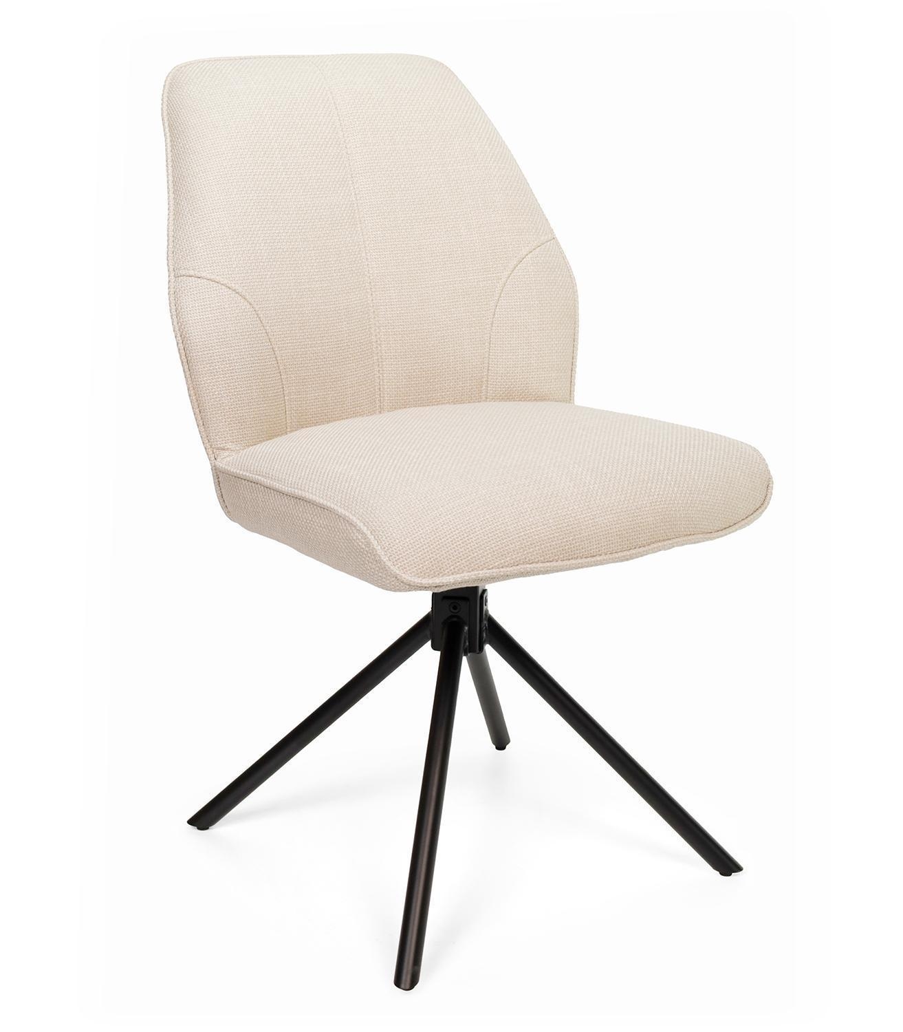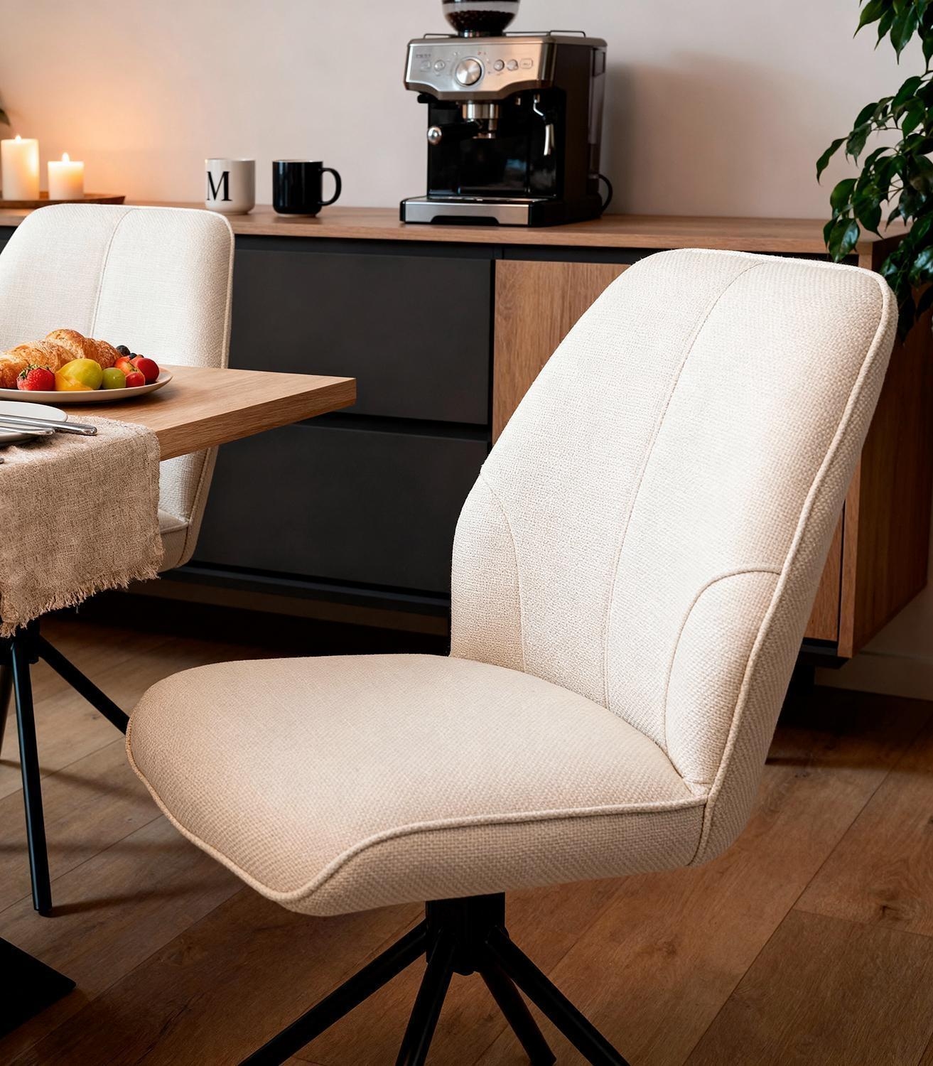 Der Polsterstuhl PLANA der Marke Home4You ist mit einem Webstoffbezug in Creme gestaltet und verfügt über ein Gestell aus Metall in Schwarz matt. Dieses Sitzmöbel weist eine Breite von 49 cm, eine Höhe von 88 cm sowie eine Tiefe von 63 cm auf, wobei die Sitzhöhe bei 50 cm und die Sitztiefe bei 44 cm liegt. Zur Ausstattung dieses Esszimmerstuhls gehört eine 180-Grad-Drehfunktion mit integrierter Rückstellmechanik sowie praktische Höhenausgleichsfüße zur Anpassung an den Untergrund. Die maximale Belastbarkeit beträgt 120 kg.