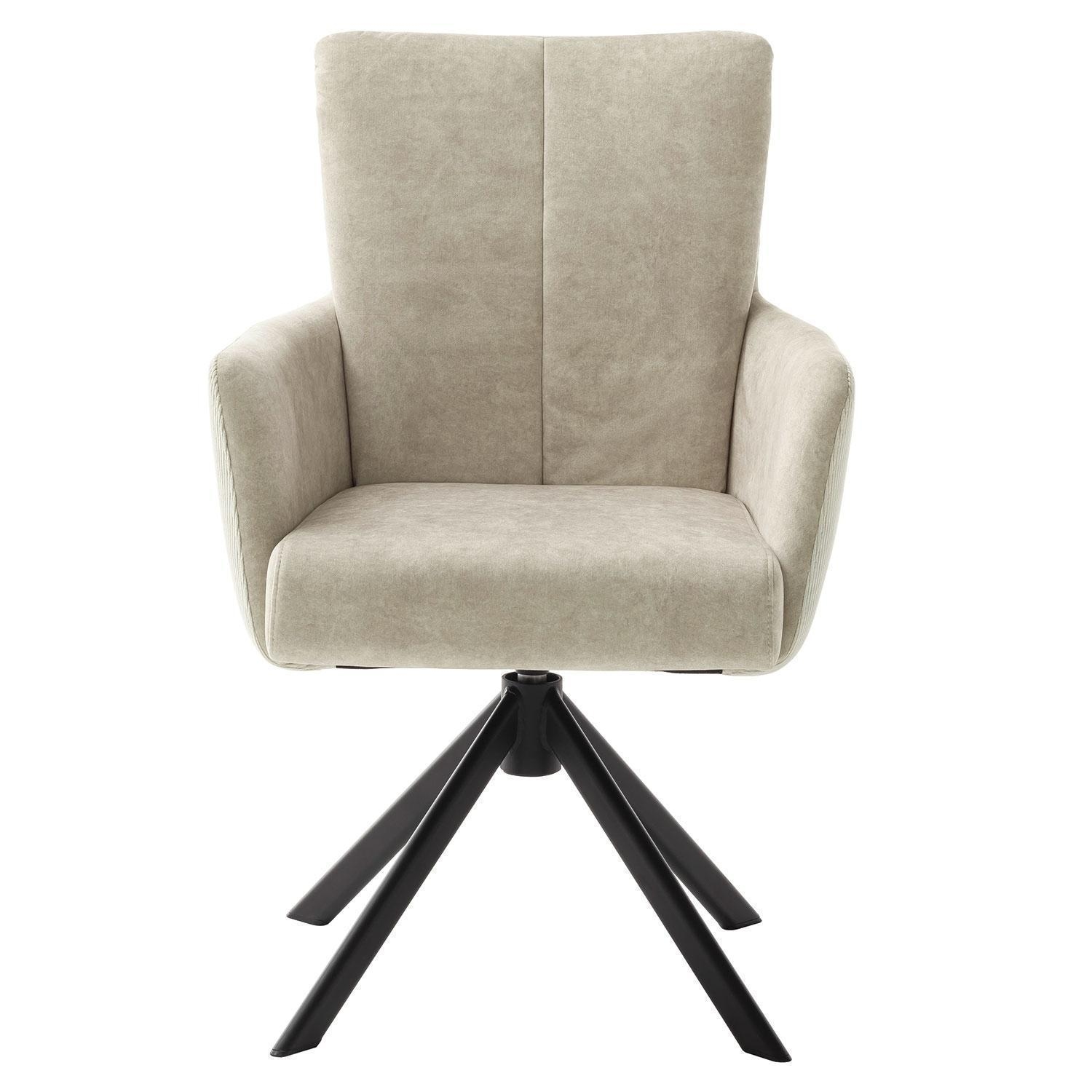 Der Polsterstuhl ROCCO der Marke Home4You besticht durch seinen Innenbezug aus cremefarbenem Velours und den Außenbezug aus Cord, ebenfalls in Creme. Sein Gestell aus schwarz mattem Metall verleiht ihm eine moderne Note. Mit einer Taschenfederkernpolsterung in der Sitzfläche bietet er hohen Sitzkomfort. Dank seiner 360-Grad-Drehfunktion und Rückholfunktion ist er äußerst flexibel einsetzbar. Mit Abmessungen von 61 cm Breite, 90 cm Höhe und 67 cm Tiefe passt er gut in verschiedene Räume.