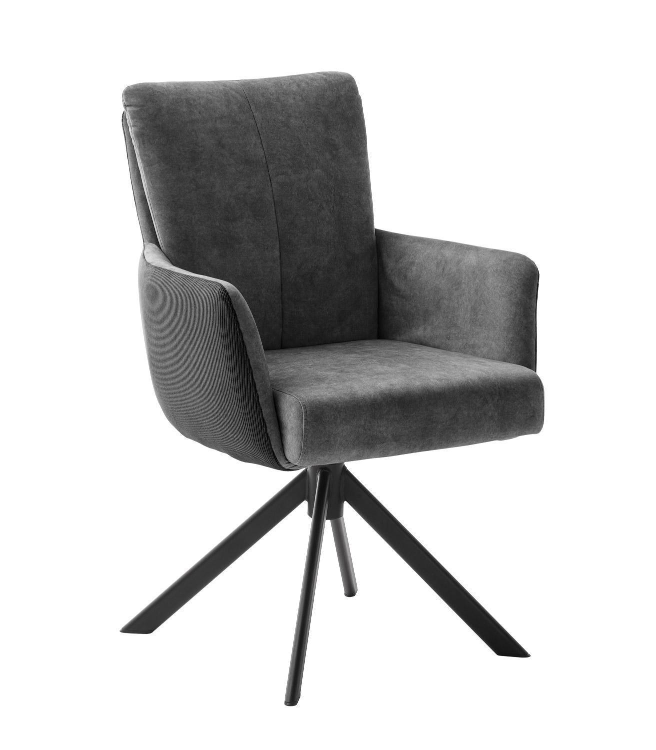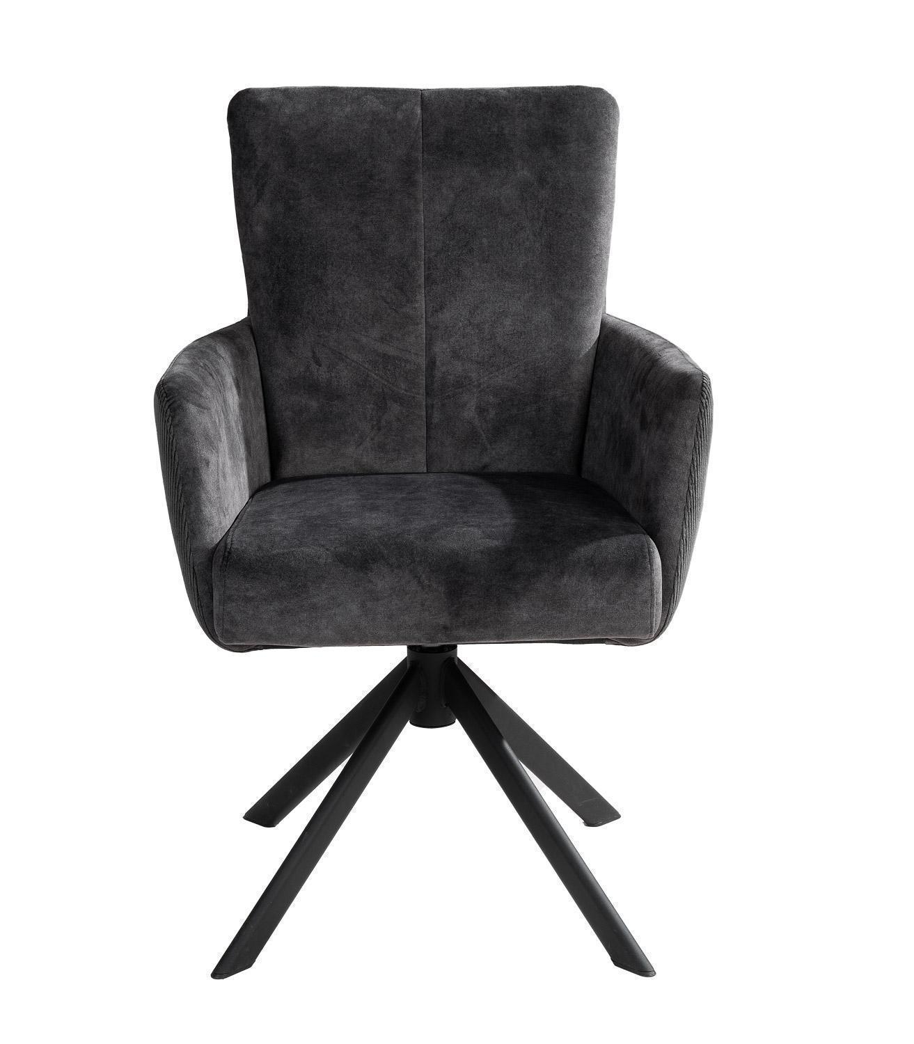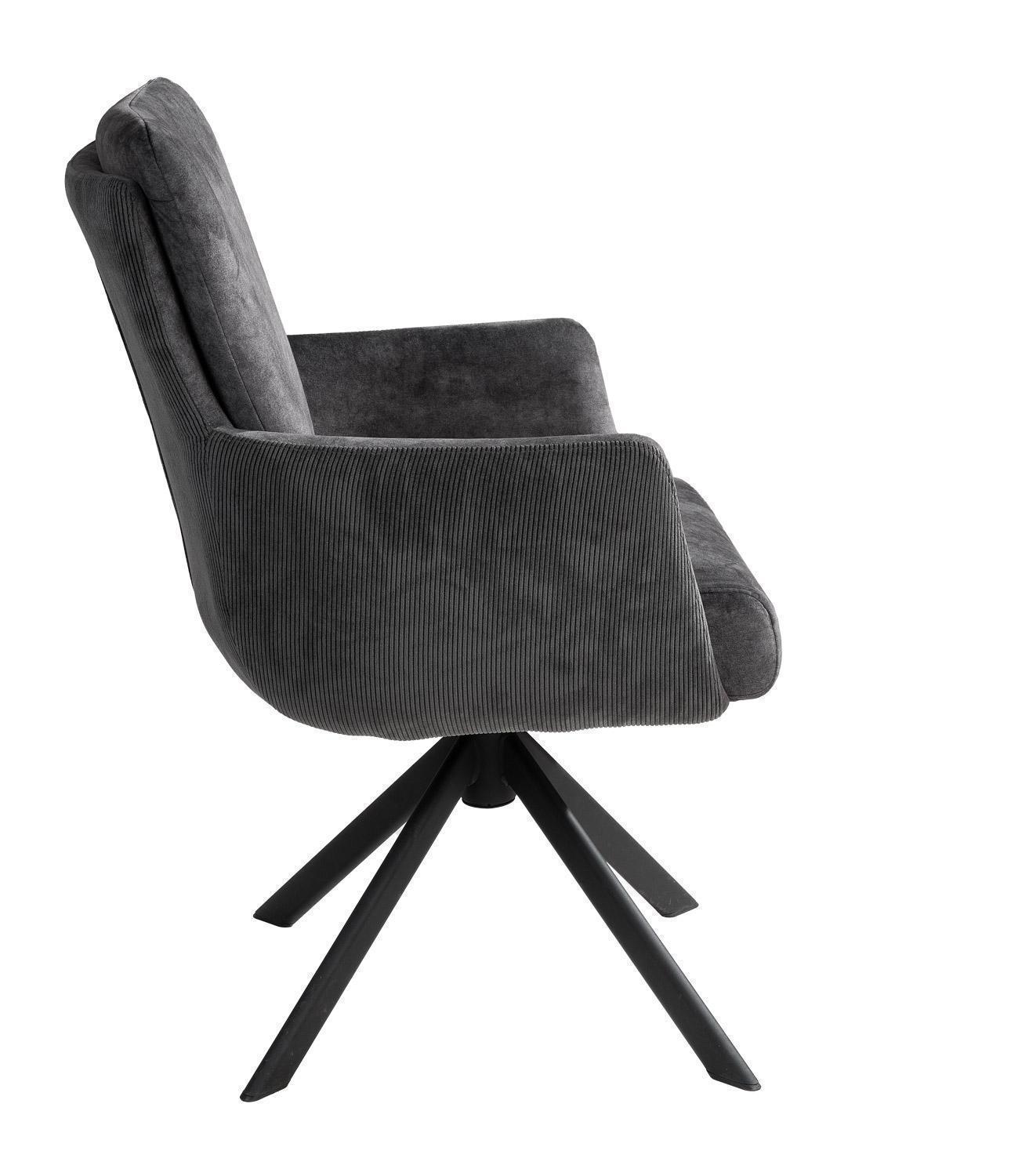 Der Polsterstuhl ROCCO der Marke Home4You besticht durch seinen Innenbezug aus anthrazitfarbenem Velours und den Außenbezug aus Cord, ebenfalls in Anthrazit. Sein Gestell aus schwarz mattem Metall verleiht ihm eine moderne Note. Mit einer Taschenfederkernpolsterung in der Sitzfläche bietet er hohen Sitzkomfort. Dank seiner 360-Grad-Drehfunktion und Rückholfunktion ist er äußerst flexibel einsetzbar. Mit Abmessungen von 61 cm Breite, 90 cm Höhe und 67 cm Tiefe passt er gut in verschiedene Räume.
