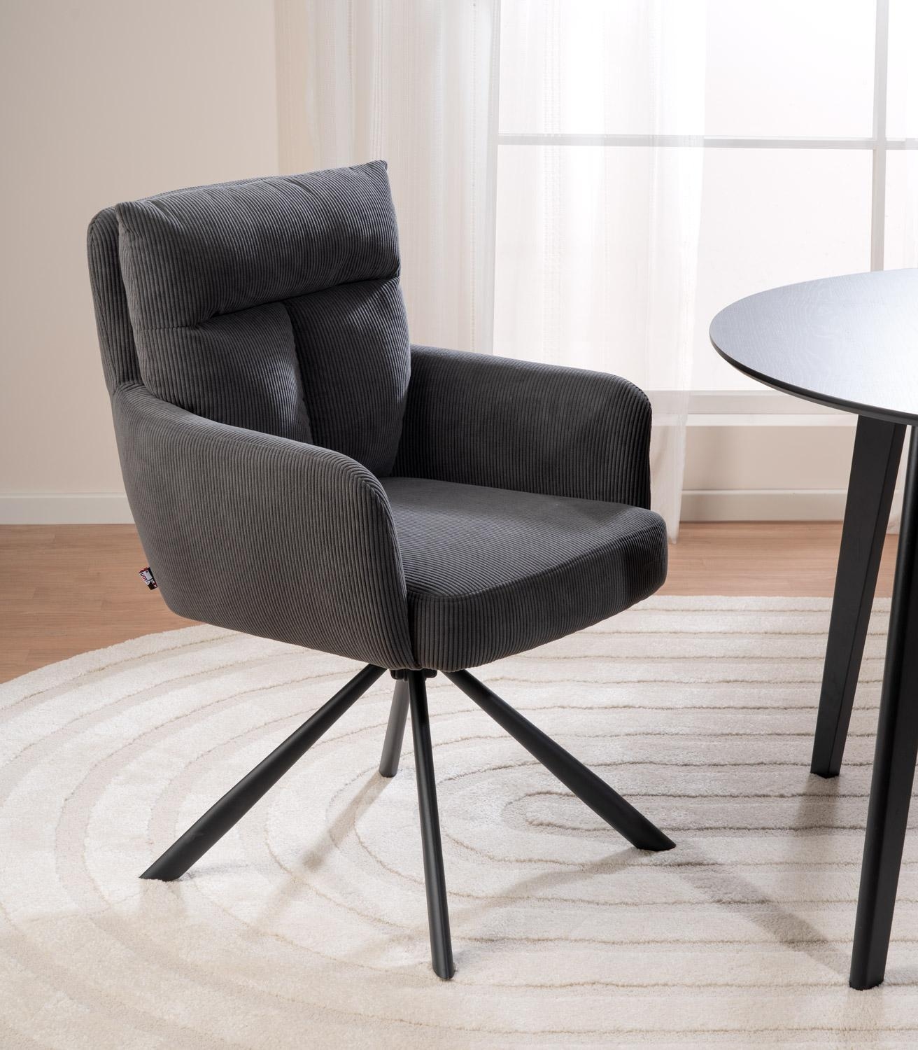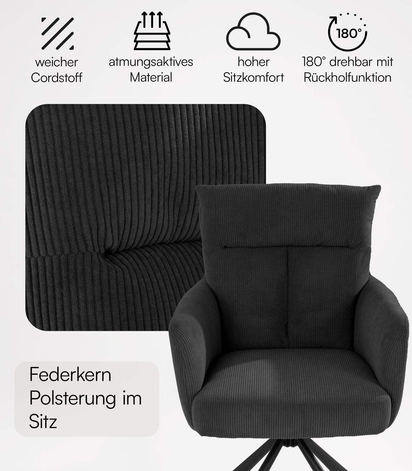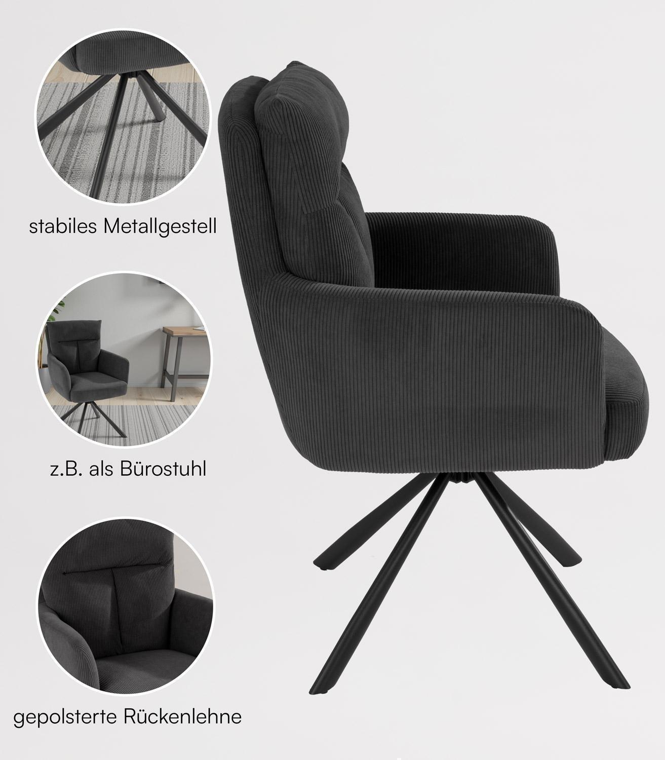 Der Polsterstuhl STEFFEN der Marke Home4You ist mit einem Cordbezug in Dunkelgrau ausgestattet. Das Gestell besteht aus Metall in Schwarz und verleiht dem Stuhl eine stabile Konstruktion. Der Sitz verfügt über eine Federkernpolsterung, die für einen angenehmen Sitzkomfort sorgt. Zusätzlich ist der Stuhl mit gepolsterten Armlehnen versehen, die weiteren Komfort bieten. Eine besondere Funktion stellt die 180-Grad-Drehbarkeit mit Rückholfunktion dar, die eine flexible Nutzung ermöglicht.