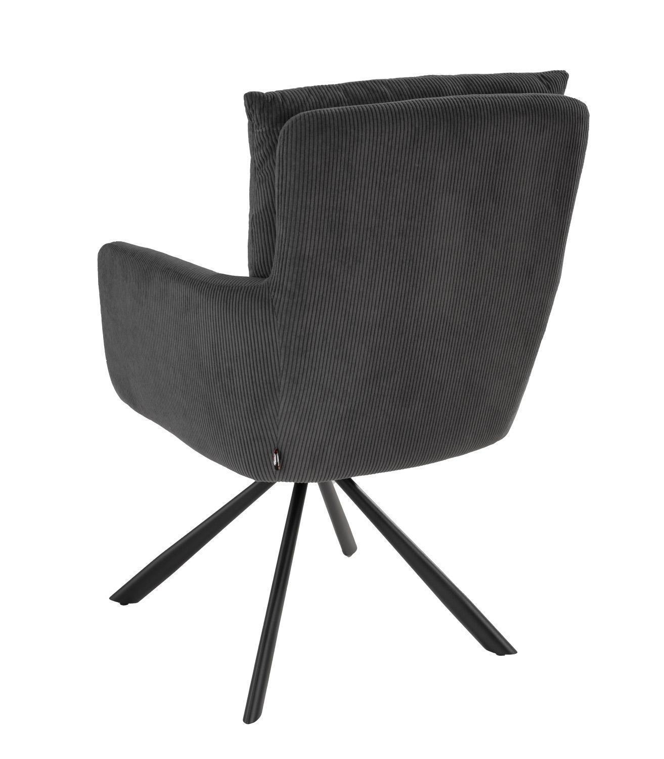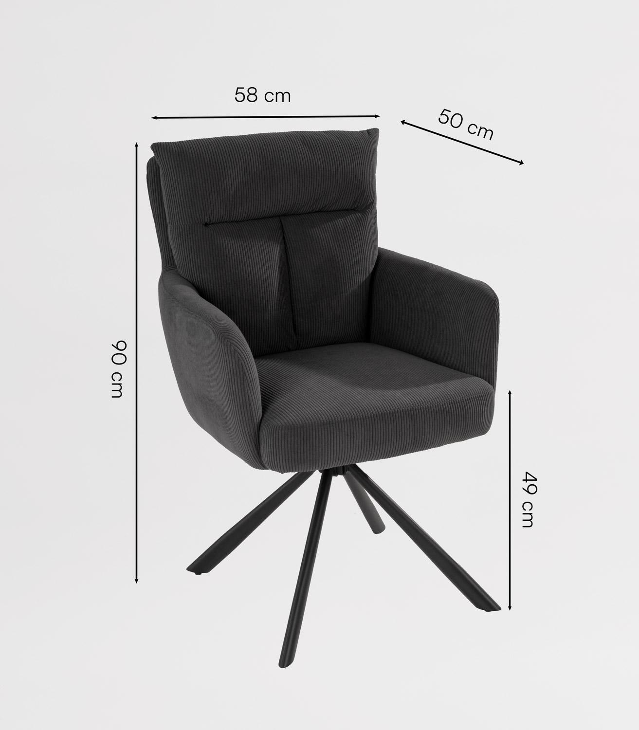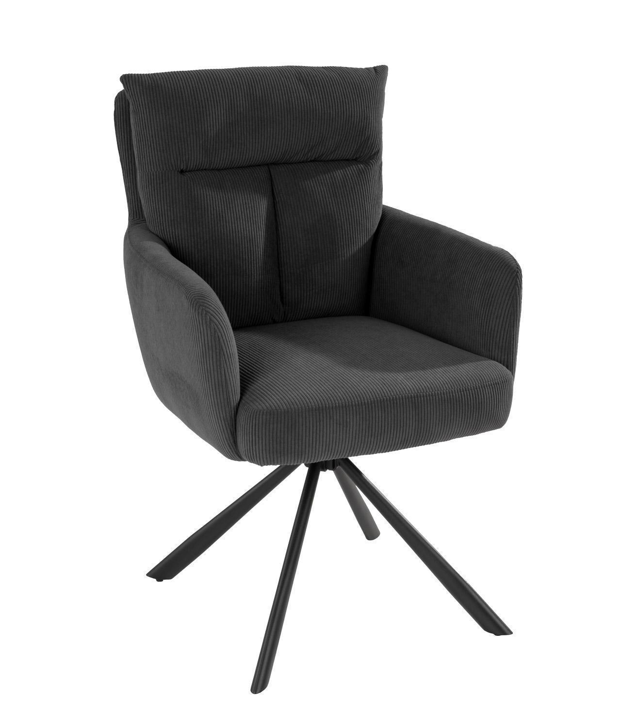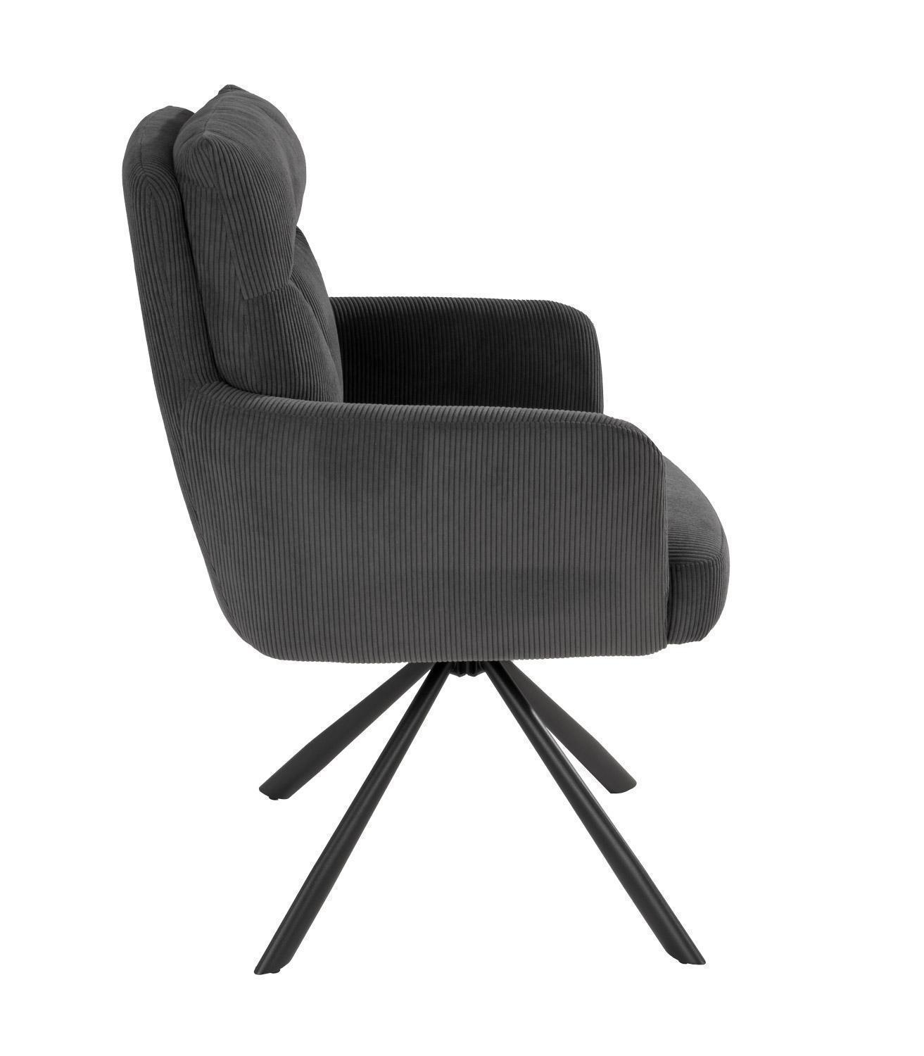 Der Polsterstuhl STEFFEN der Marke Home4You ist mit einem Cordbezug in Dunkelgrau ausgestattet. Das Gestell besteht aus Metall in Schwarz und verleiht dem Stuhl eine stabile Konstruktion. Der Sitz verfügt über eine Federkernpolsterung, die für einen angenehmen Sitzkomfort sorgt. Zusätzlich ist der Stuhl mit gepolsterten Armlehnen versehen, die weiteren Komfort bieten. Eine besondere Funktion stellt die 180-Grad-Drehbarkeit mit Rückholfunktion dar, die eine flexible Nutzung ermöglicht.