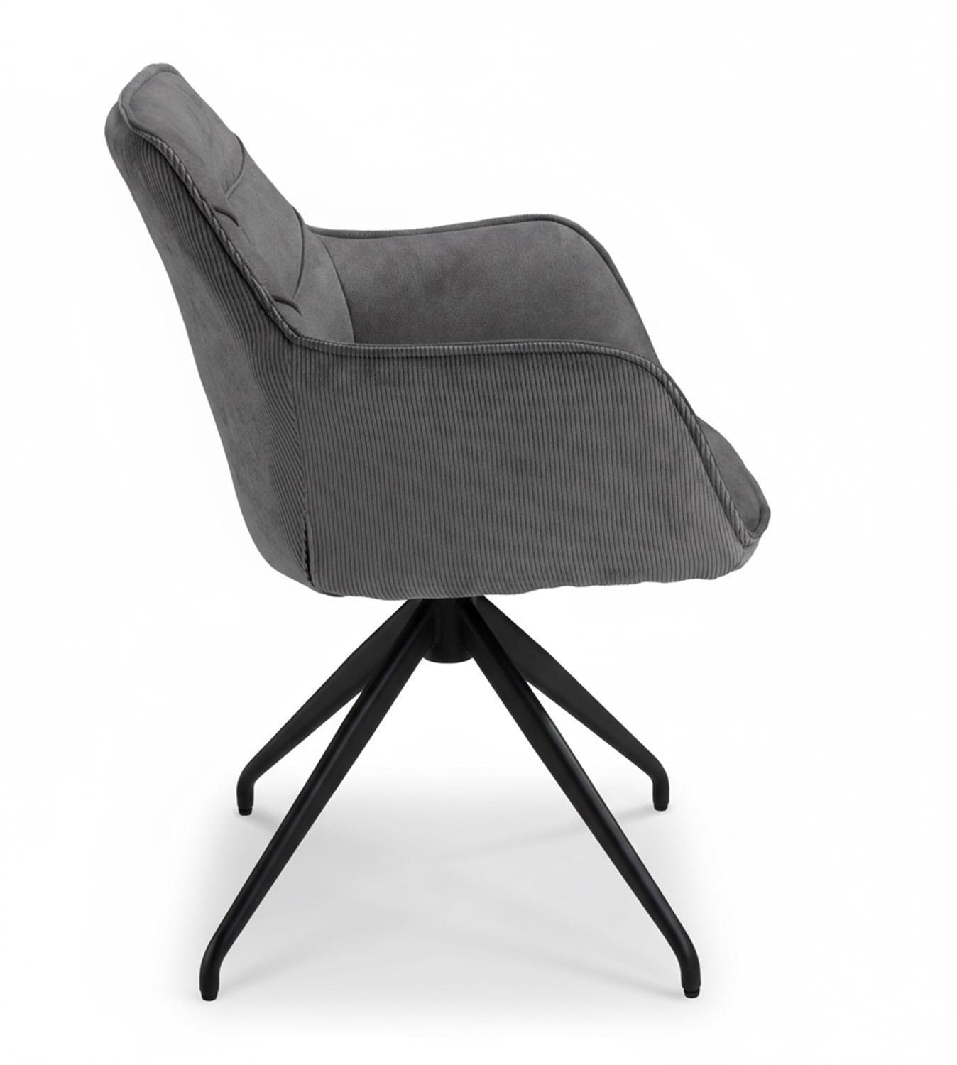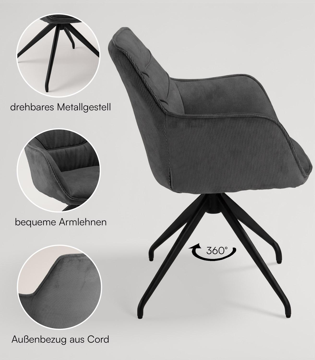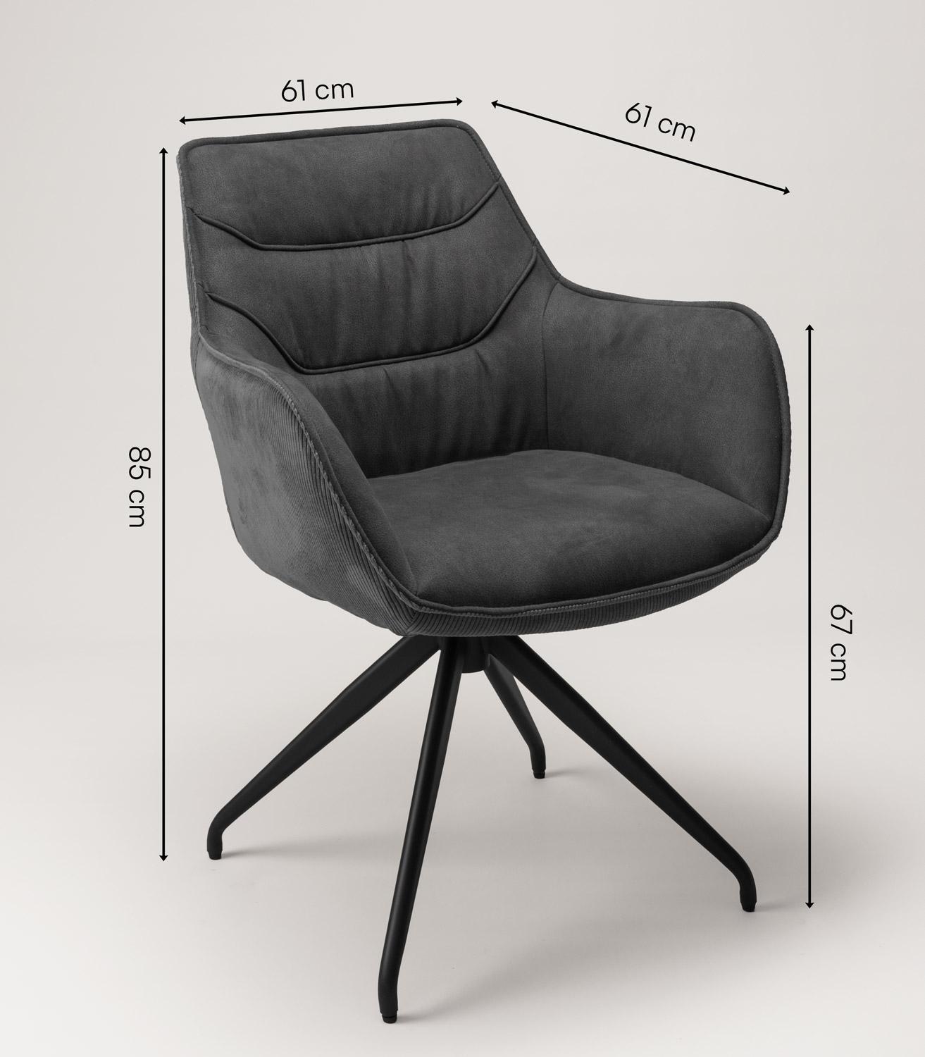 Der Polsterstuhl TURINO der Marke Home4You ist mit einem Innenbezug aus grauer Mikrofaser ausgestattet. Der Außenbezug besteht aus grauem Cord. Das Gestell ist aus schwarzem Metall gefertigt und verleiht dem Stuhl eine stabile Basis. In der Rückenlehne befinden sich Quersteppungen, die das Erscheinungsbild strukturieren. Der Stuhl ist um 360 Grad drehbar. Die Maße betragen 61 cm in der Breite, 85 cm in der Höhe und 61 cm in der Tiefe. Die Sitzbreite liegt bei 43 cm, ebenso die Sitztiefe.