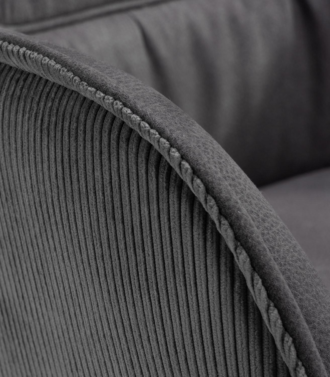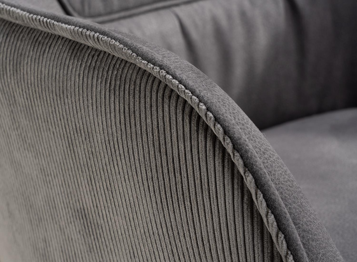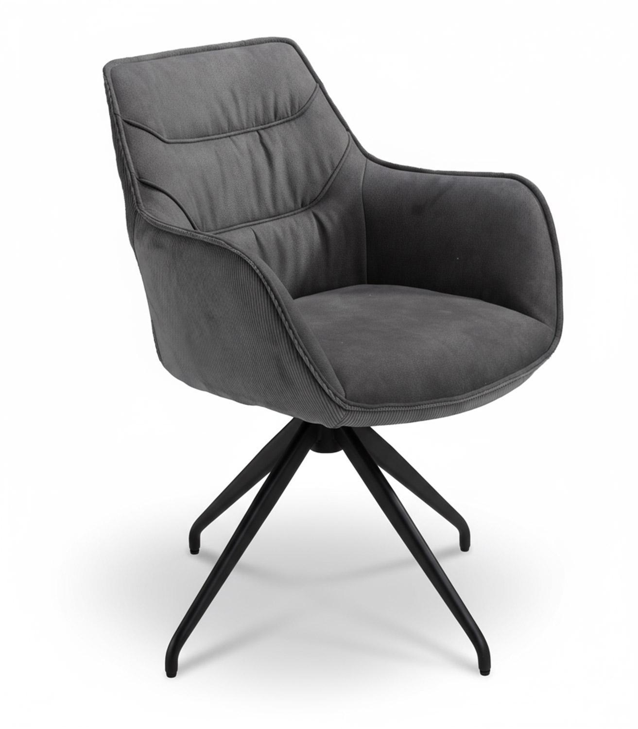 Der Polsterstuhl TURINO der Marke Home4You ist mit einem Innenbezug aus grauer Mikrofaser ausgestattet. Der Außenbezug besteht aus grauem Cord. Das Gestell ist aus schwarzem Metall gefertigt und verleiht dem Stuhl eine stabile Basis. In der Rückenlehne befinden sich Quersteppungen, die das Erscheinungsbild strukturieren. Der Stuhl ist um 360 Grad drehbar. Die Maße betragen 61 cm in der Breite, 85 cm in der Höhe und 61 cm in der Tiefe. Die Sitzbreite liegt bei 43 cm, ebenso die Sitztiefe.