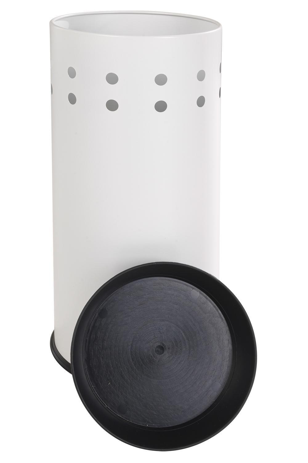 Der Schirmständer RAJA von Home4You ist eine praktische und elegante Lösung zum Aufbewahren von Regenschirmen oder Gehstöcken in Ihrem Eingangsbereich oder Flur. Er wird einzeln geliefert und ist in einem attraktiven Weiß mit einem gebürsteten Edelstahlgehäuse gehalten, was ihm ein modernes und stilvolles Aussehen verleiht.