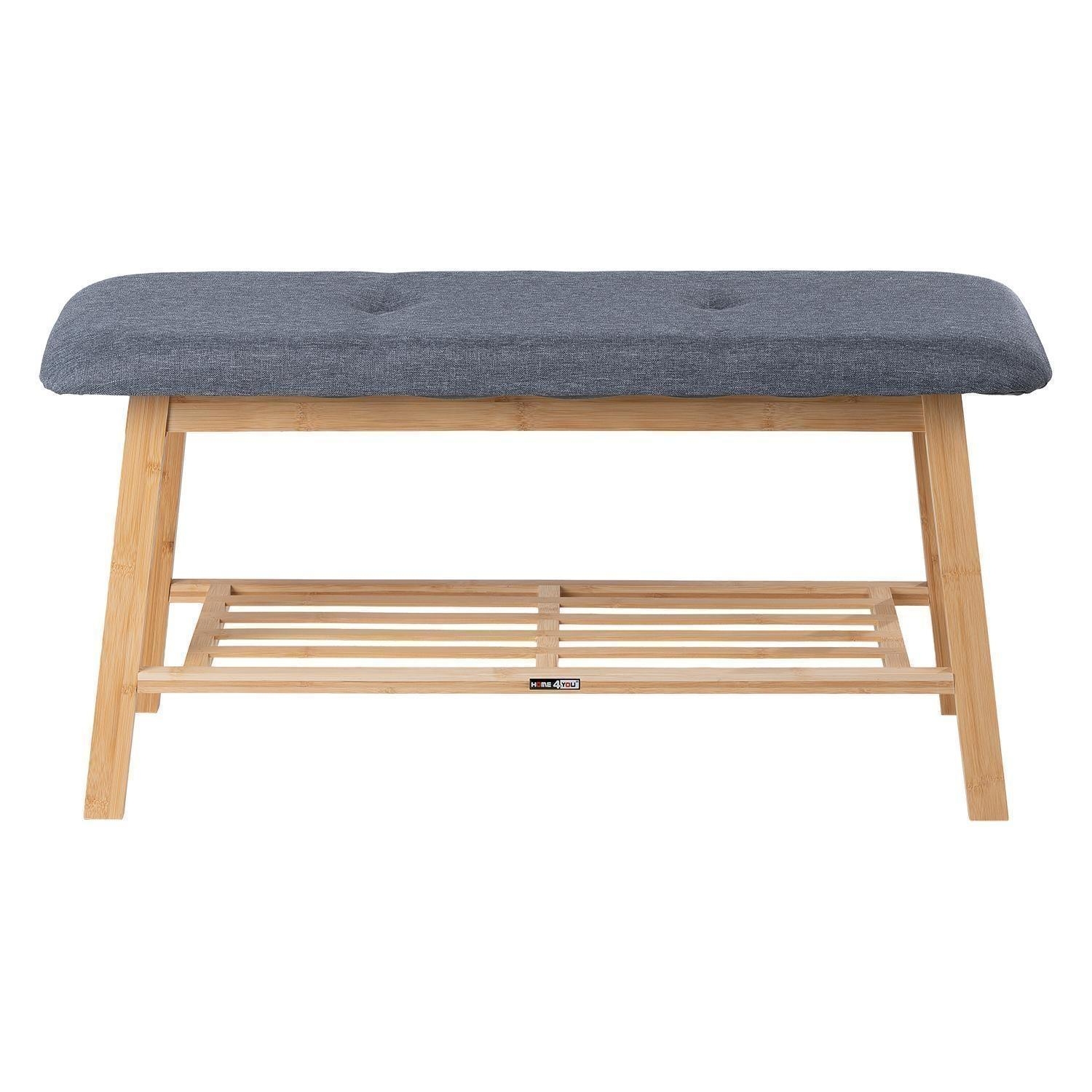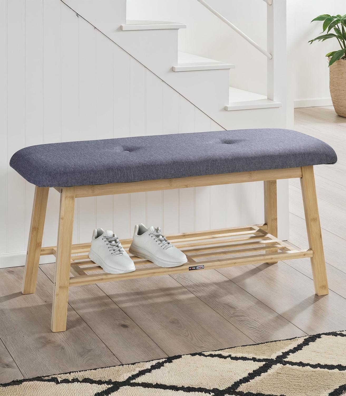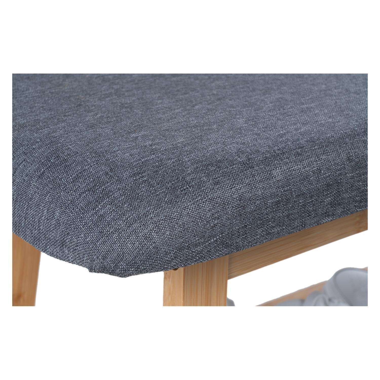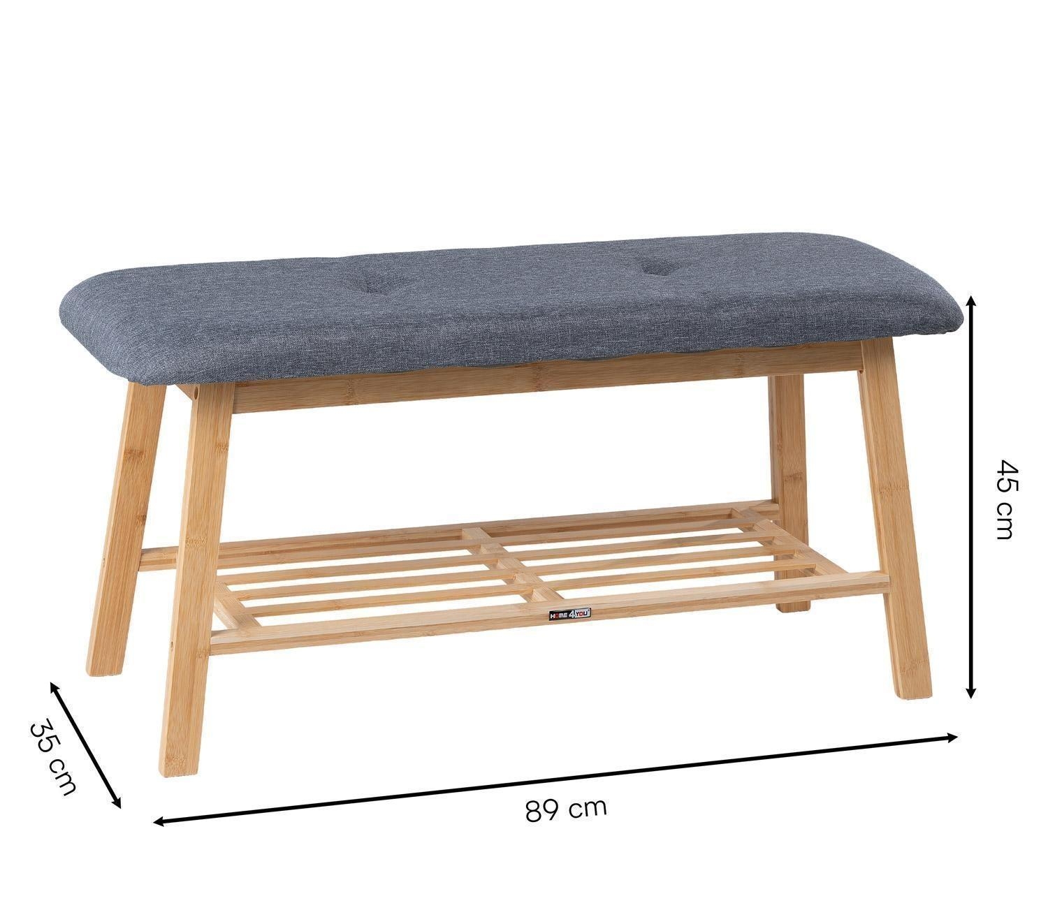Die Schuhbank ZORO der Marke Home4You ist mit einem Stoffbezug in Grau ausgestattet. Gestell und Ablagefläche bestehen aus Bambusholz. Die Ablagefläche bietet Platz für bis zu 3 Paar Schuhe. Die maximale Belastbarkeit beträgt 170 kg. Die Maße der Schuhbank liegen bei 89 cm Breite, 45 cm Höhe und 35 cm Tiefe.