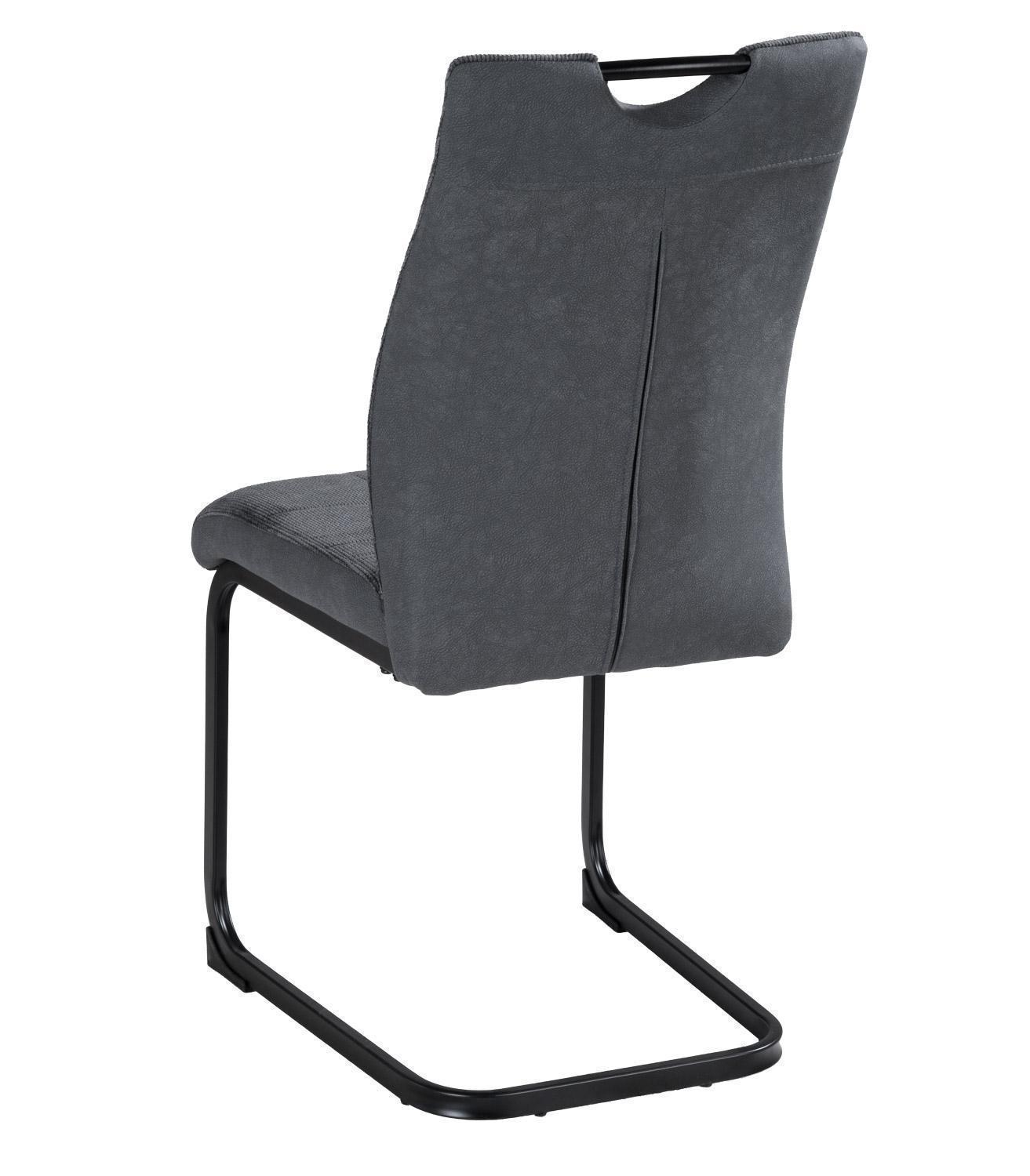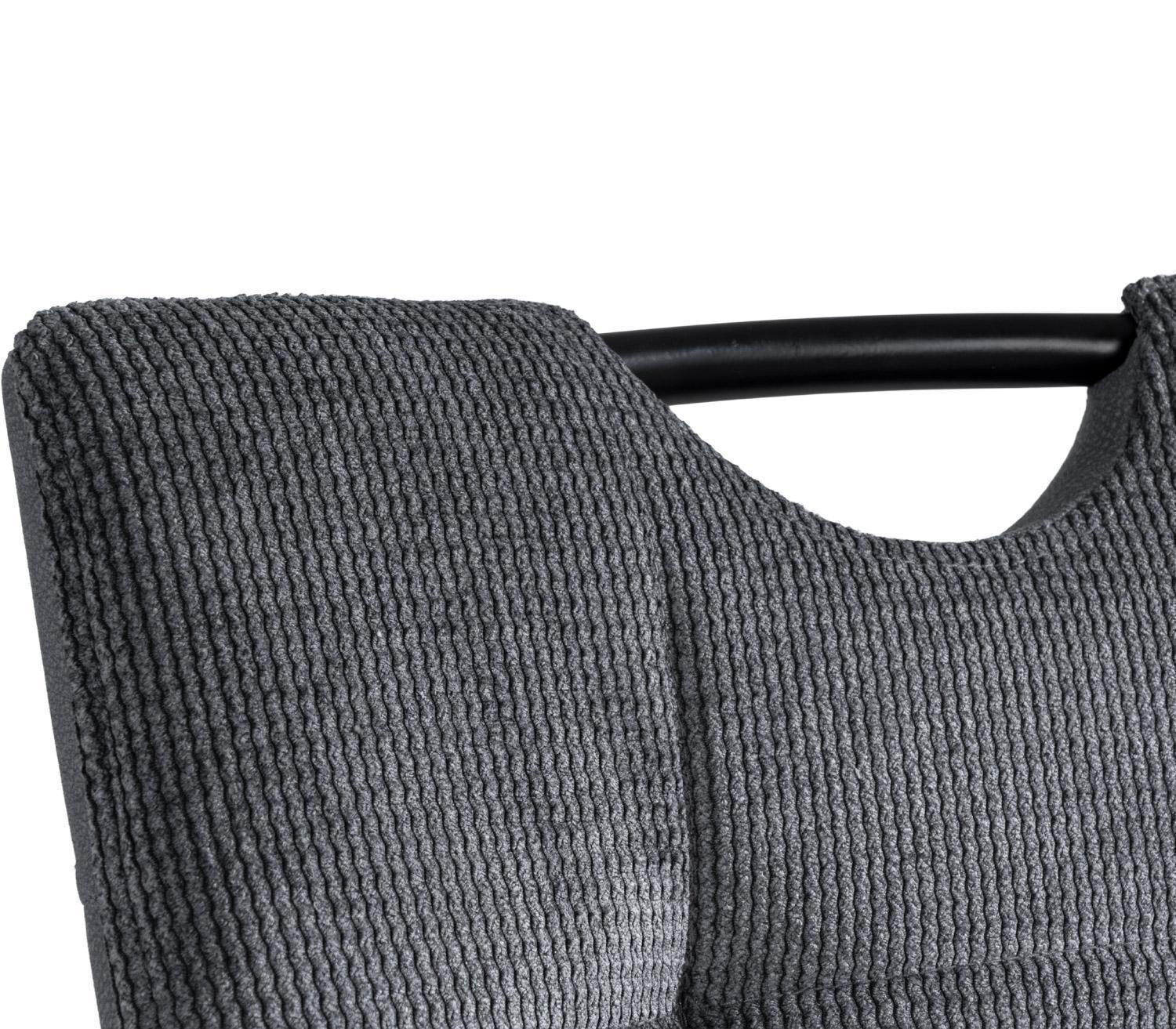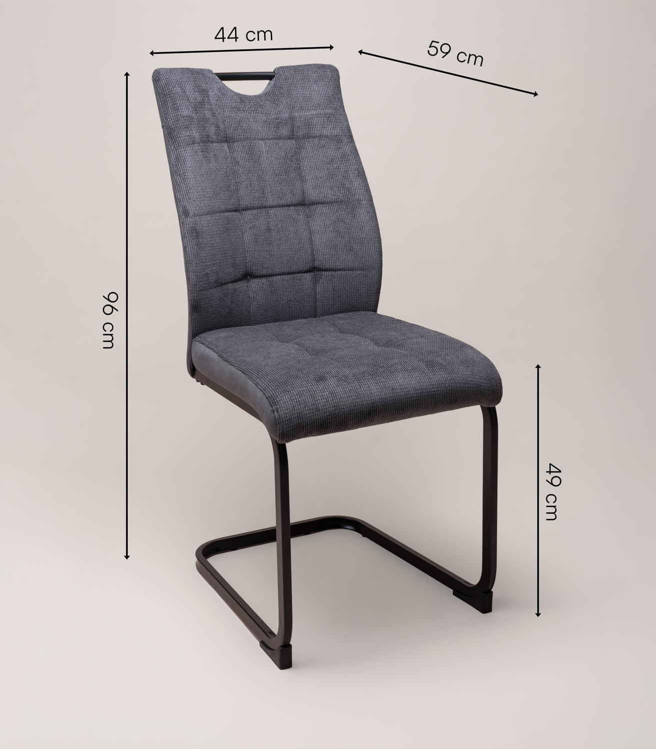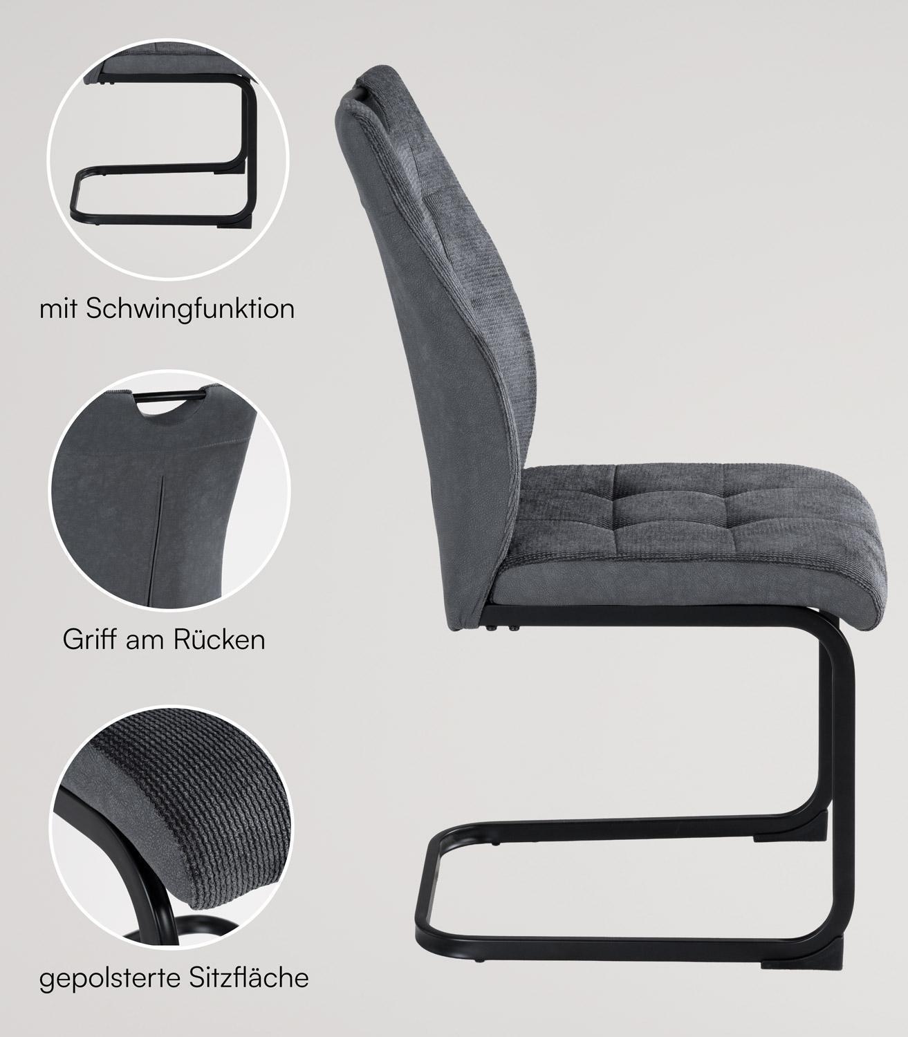 Der Schwingstuhl BASKO der Marke Home4You verfügt über einen Webstoffbezug in Grau im Sitz- und Rückenlehnenbereich, während der Rücken mit einem Mikrofaserbezug in gleicher Farbgebung ausgestattet ist. Das Gestell ist aus schwarzem Metall gefertigt und verleiht dem Stuhl seine charakteristische Schwingfunktion. Sitz- und Rückenfläche sind mit Steppungen versehen. Ein integrierter Griff an der Rückenlehne erleichtert das Umplatzieren des Stuhls. Die Abmessungen betragen 44 cm in der Breite, 96 cm in der Höhe und 59 cm in der Tiefe. Die Sitzhöhe liegt bei 49 cm.