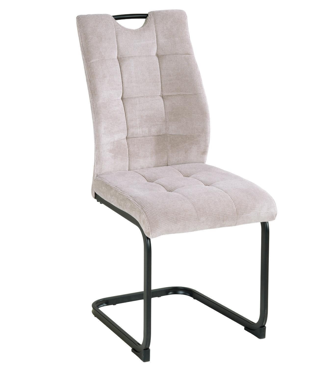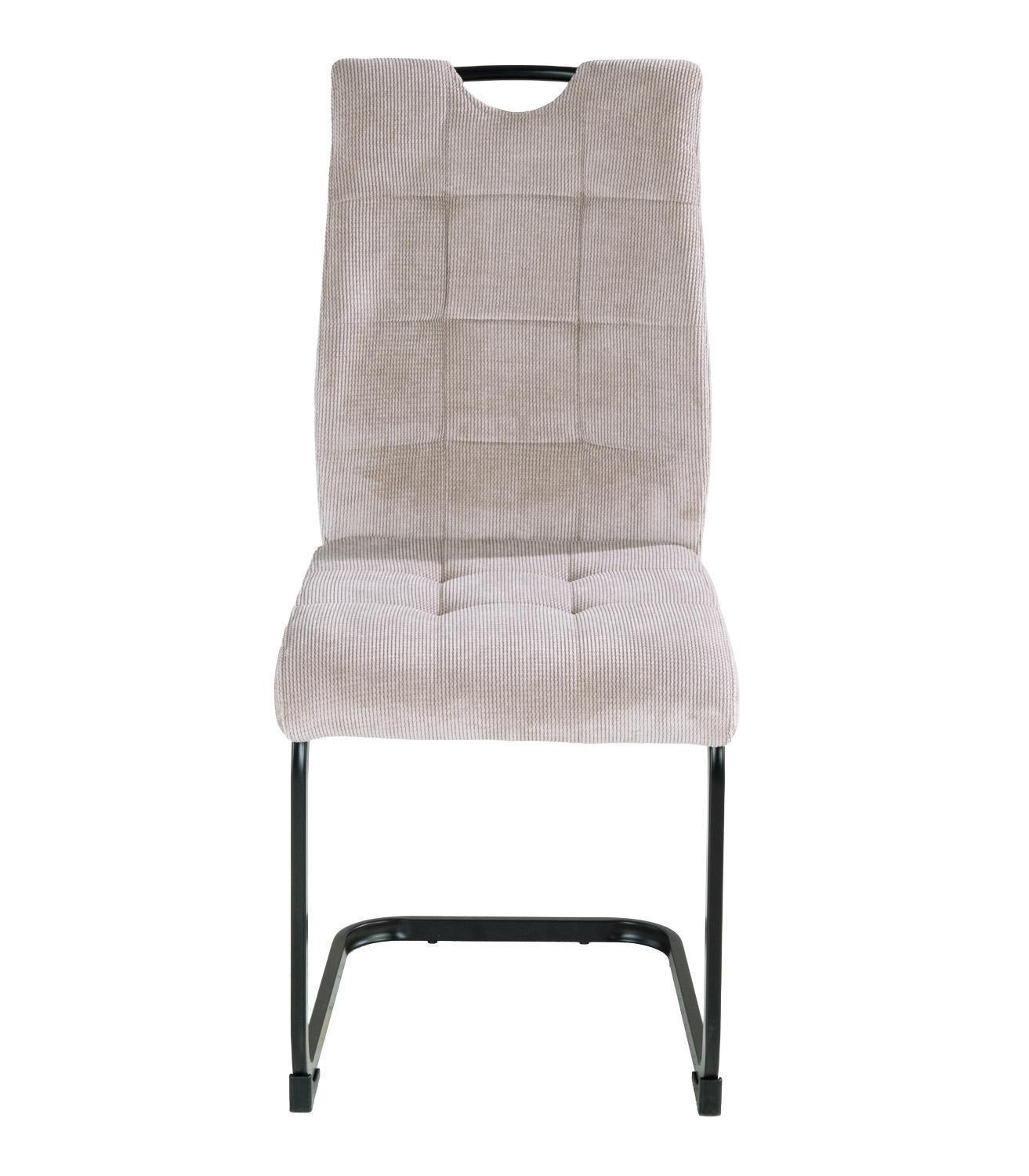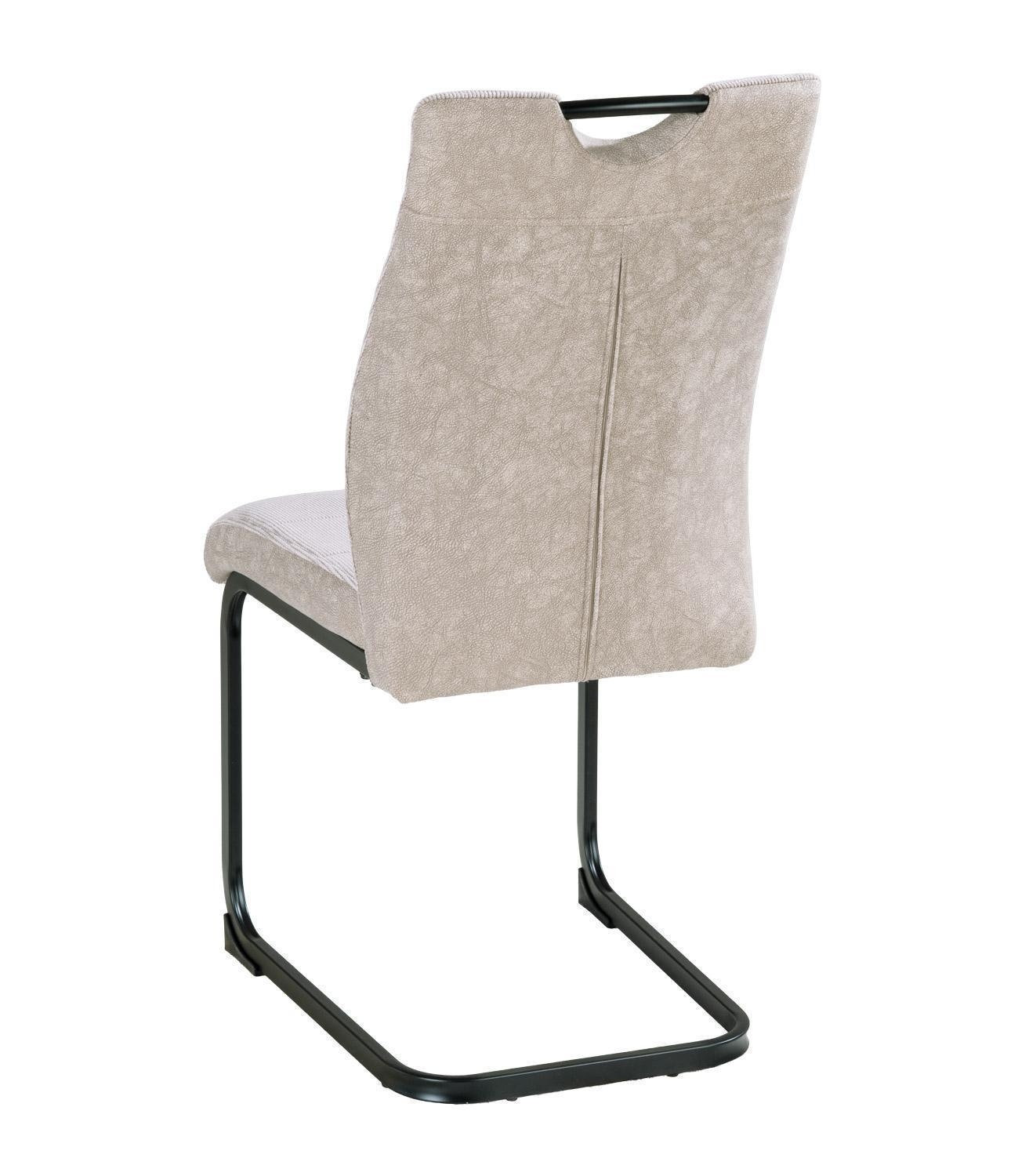 Der Schwingstuhl BASKO der Marke Home4You verfügt über einen Webstoffbezug in Beige im Sitz- und Rückenlehnenbereich, während der Rücken mit einem Mikrofaserbezug in gleicher Farbgebung ausgestattet ist. Das Gestell ist aus schwarzem Metall gefertigt und verleiht dem Stuhl seine charakteristische Schwingfunktion. Sitz- und Rückenfläche sind mit Steppungen versehen. Ein integrierter Griff an der Rückenlehne erleichtert das Umplatzieren des Stuhls. Die Abmessungen betragen 44 cm in der Breite, 96 cm in der Höhe und 59 cm in der Tiefe. Die Sitzhöhe liegt bei 49 cm.