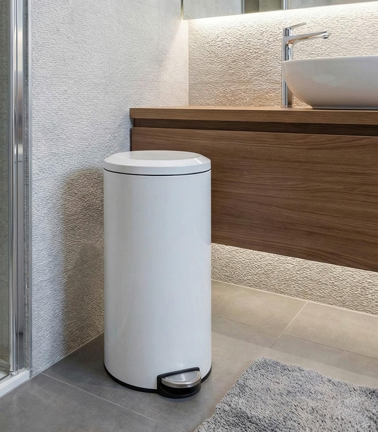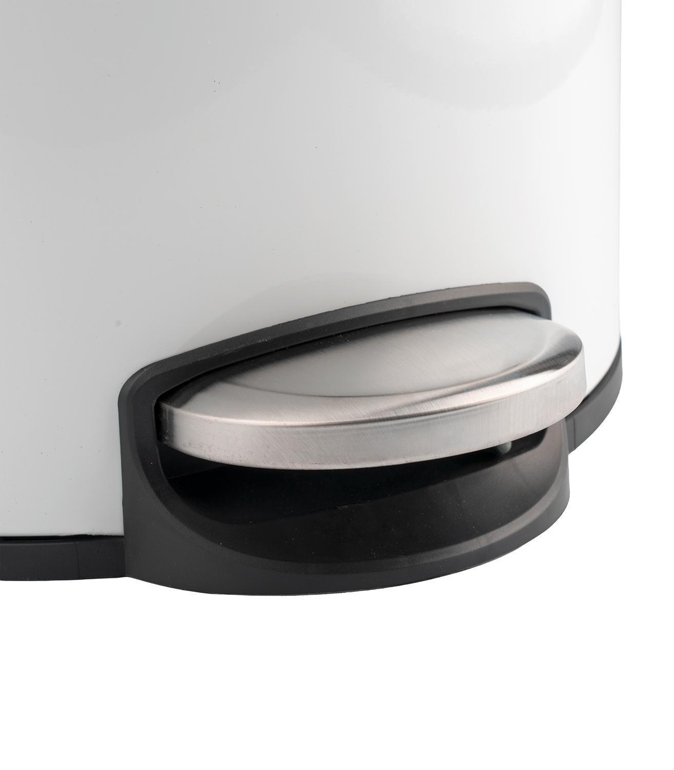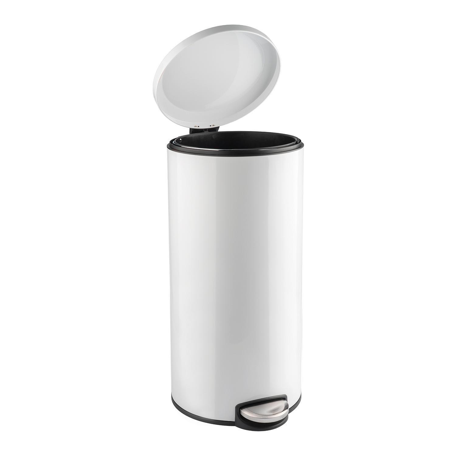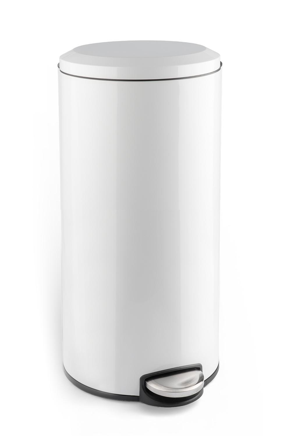 Der Treteimer der Marke Home4You ist aus satiniertem Edelstahl gefertigt und in der Farbe Weiß glänzend gehalten. Er hat einen Durchmesser von 29 cm sowie eine Höhe von 64,7 cm und verfügt über ein Fassungsvermögen von 30 Litern. Der Treteimer ist mit einer Soft-Close-Funktion ausgestattet und besitzt einen herausnehmbaren Kunststoffeinsatz. Das Öffnen erfolgt einfach und komfortabel über das Fußpedal.