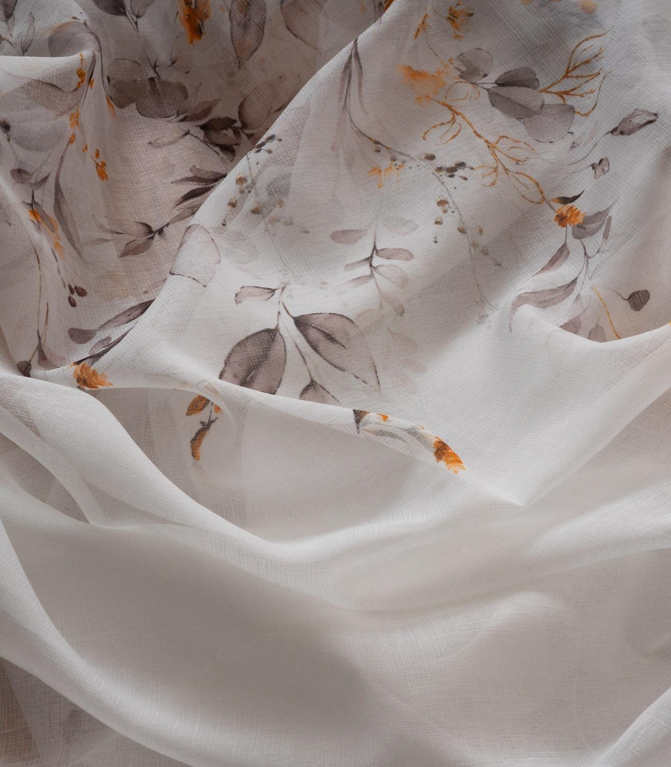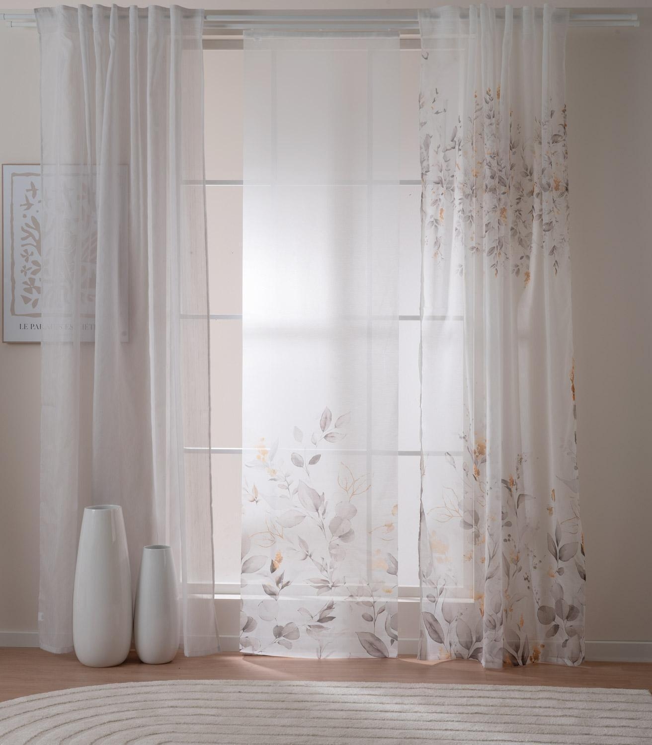 Der verdeckte Schlaufenschal von Home4You aus Polyester in Weiß verleiht Fenstern eine natürliche Leichtigkeit. Mit einer Größe von 140 x 245 cm bietet er dekorativen Spielraum für Wohn- und Schlafräume. Blätter- und Blumenmotive in Grau und Goldgelb setzen einen sanften Akzent und fügen sich harmonisch in viele Einrichtungsstile ein. Das halbtransparente Gewebe sorgt für helle Räume und lässt Tageslicht angenehm durchscheinen. Dank verdeckter Schlaufen lässt sich der Schal mühelos aufhängen und ist bei 60 °C waschbar.